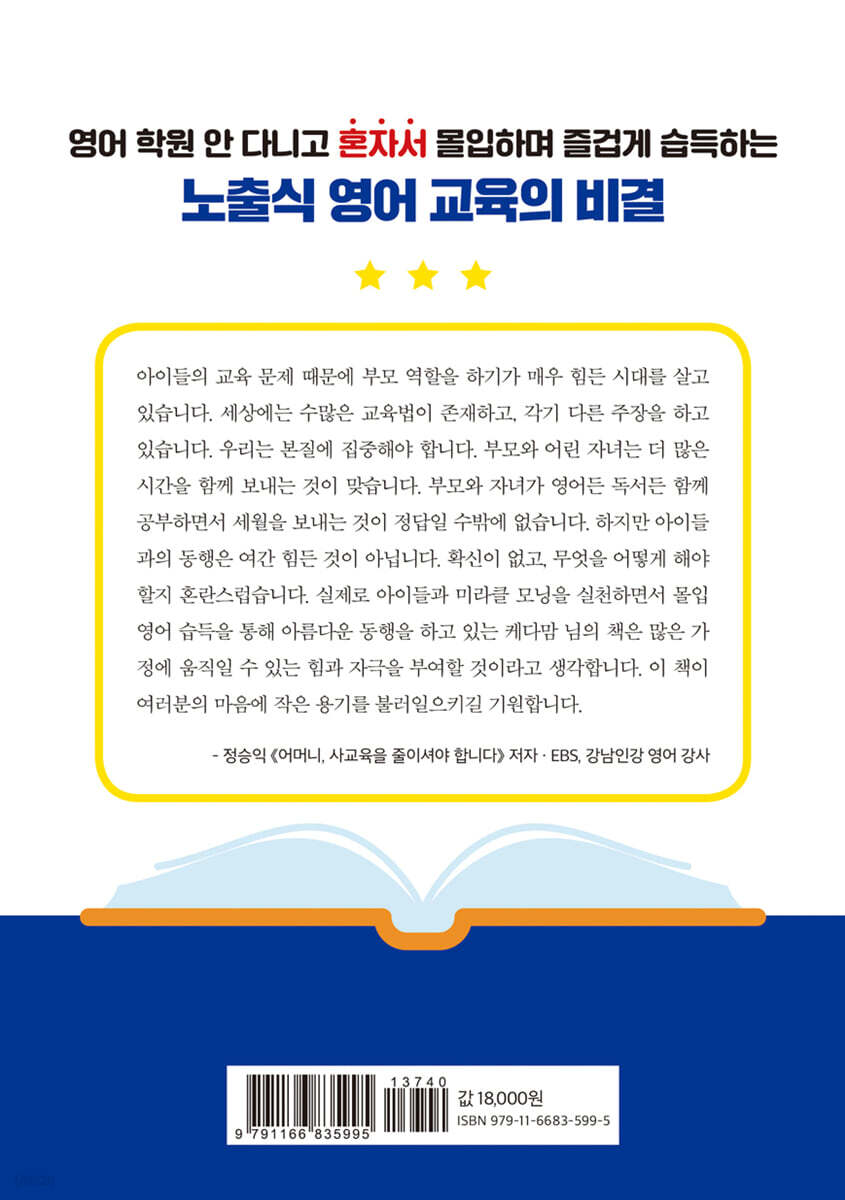 1장. 실용 영어를 익혀야 하는 이유 - 영어를 배워야 하는 시대적인 이유 - 이 시대에 꼭 필요한 영어 능력과 그 목표 - 영어를 알지만 할 줄 모르는 우리 부모 세대 2장. 책 육아와 영어 교육 - 사교육으로 하는 영어 교육의 한계 - 영어 노출은 곧 책 육아의 연장선 - 자녀 교육의 최종적 목표 3장. 영어 3종의 구체적인 방법 - 엄마가 가르치지 않는 엄마표 영어 - 흘려 듣기: 자막 없이 영어 영상 보기 - 집중 듣기: 영어책을 원어민 음성에 맞춰 손가락으로 짚으며 읽기 - 영어책 읽기: 말 그대로 영어책을 재미있게 읽기 4장. 한글 책 읽기의 중요성 - 모국어의 문해력과 영어 실력의 상관관계 - 고학년이라면 고전 읽기에 도전하기 5장. 영어 3종을 매일 하는 습관의 필요성 - 흘려 듣기, 집중 듣기, 영어책 읽기의 루틴화 - N시간 스케줄 관리 방법 6장. 책 육아 인테리어로 조성하는 노출 환경 - 책 육아 인테리어의 포인트 - 책이 술술 읽히는 분위기의 비결 7장. 초등 1~6학년 영어 로드맵 - 우리 아이 맞춤 영어 목표 세우기 - 영어 3종 노출 목표 시간 - 대박 책 및 영상 선정 노하우 - 중등 및 대입 입시 영어와의 간극을 좁히는 방법 부록. 책과 영어 영상 추천 리스트 에필로그. 엄마와 아이가 동행하는 행복한 자녀 교육 |