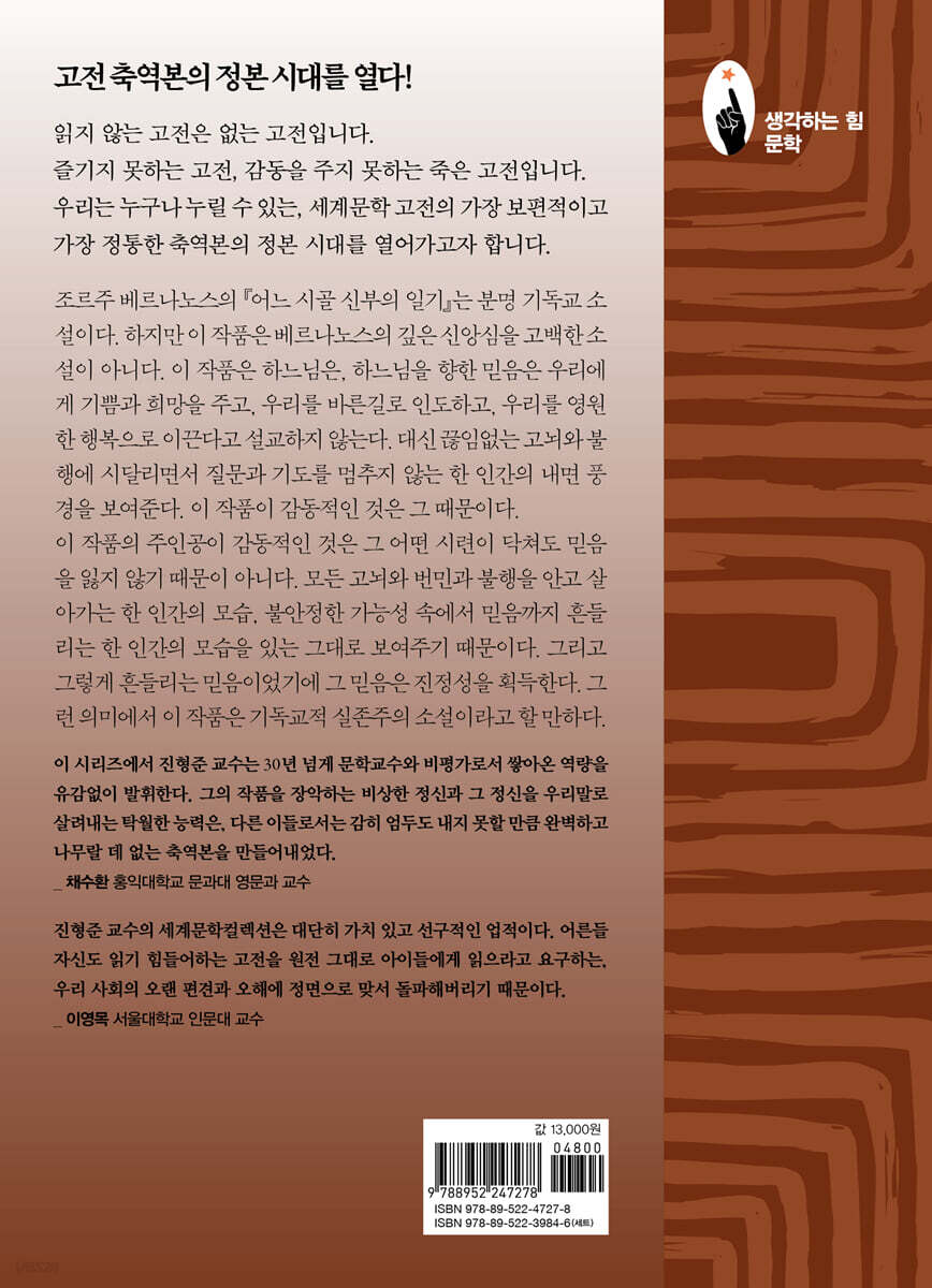 끊임없는 고뇌와 불행에 시달리면서 질문과 기도를 멈추지 않는 한 신부 조르주 베르나노스(George Bernanos, 1888~1948)의 『어느 시골 신부의 일기(Journal d’un cure de campagne)』는 해설이랍시고 몇 자 끼적이는 것을 거부하는 소설이라고 해도 무방하다. 이 작품이 전하는 감동, 이 작품이 우리에게 전하는 의미는 그런 몇 마디 해설이나 분석 너머에 있기 때문이다. 무엇보다 이 작품은 임종의 순간 “모든 게 은총이라네”라고 속삭이며 죽어간 한 영혼의 기록이다. 더욱이 그 영혼의 주인공은 믿음, 초월과 늘 가까이할 수밖에 없는 신부이다. 영혼, 믿음, 초월 같은 것은 언어적 정의나 설명이 가닿을 수 없는 영역의 것들이다. 그것들은 언어적 규정의 영역에 속하는 것이 아니라 구체적 내적 체험의 영역에 속한다. 『어느 시골 신부의 일기』는 그 내적 체험의 기록이다. 아니, 소설이라는 형식(언어를 사용할 수밖에 없는 형식)을 통해 독자를 그런 내적 체험 가까이 이끄는 작품이다. 고백하지만 이 소설을 번역하면서 나는 그런 체험을 아주 조금은 했던 것 같기도 하다. 이 시리즈를 시작한 뒤 지금까지 90권 가까이 번역을 했지만, 번역을 하면서 눈물이 글썽했던 경험은 이번이 처음이다. 기독교 소설임이 분명한 이 작품을 읽고 교회나 성당에 다니지도 않는 내가 왜 눈물을 흘렸던 것일까? 더욱이 이 나이에……. 여러 가지 이유를 댈 수도 있겠지만 가장 솔직히 말한다면 이 작품 속에 담긴 베르나노스의 진정성의 무게, 요즈음은 맛보기 힘든 그 진지함의 무게에 감동받았기 때문이다. 무엇에 대한 진지함? 바로 우리의 삶 자체에 대한 진지함이다. 모든 것이 한없이 가벼워지고 있는 세상을 살아가고 있는 나의 마음속에 그 진지함의 무게와 깊이가 울림을 주었기 때문이다. 이 작품은 분명 기독교 소설이다. 하지만 이 작품은 베르나노스의 깊은 신앙심을 고백한 소설이 아니다. 기독교의 위대함, 신앙의 위대함을 설파한 소설이 아니다. 이 작품은 하느님은, 하느님을 향한 믿음은 우리에게 기쁨과 희망을 주고, 우리를 바른 길로 인도하고, 우리를 영원한 행복으로 이끈다고 설교하지 않는다. 만일 그랬다면 내게 주는 감동은 덜 했을 것이다. 이 작품이 내게 감동적인 것은 끊임없는 고뇌와 불행에 시달리면서 질문과 기도를 멈추지 않는 한 인간,ㅡ주인공이 신부이니 기도를 멈추지 않는 것은 당연한 일이다ㅡ하지만 바로 그 인간적 진정성으로 인해 기도까지 소홀히 하는 위험, 혹은 시련을 겪는 한 인간의 기록이기 때문이다. 물론 결말은 “모든 게 은총이라네”라는 속삭임이다. 또한, 이 작품의 주인공은, 아니 이 작품 자체가 절대적 진리로서의 하느님에 대한 믿음을 조금도 부정하지 않는다. 그는 늘 믿음과 함께 한다. ㆍ 생각하는 힘: 진형준 교수의 세계문학컬렉션 시리즈 소개 〈생각하는 힘: 진형준 교수의 세계문학컬렉션〉은 문학평론가이자 불문학자로서 제2대 한국문학번역원 원장을 역임한 진형준 교수가 평생 축적해온 현장 경험과 후세대를 위한 애정을 쏟아부은 끝에 내놓는, 10년에 걸친 장기 프로젝트의 성과물이다. 『일리아스』와 『열국지』에서 『1984』와 『이방인』까지, 고대부터 현대에 이르는 세계문학 고전을 총망라할 계획으로 이미 81권을 선보여 많은 독자의 호응을 얻었고 계속해서 후속 권들이 출간되고 있다. 〈생각하는 힘: 진형준 교수의 세계문학컬렉션〉은 진정한 독서의 길을 제시하려는 대단히 가치 있고 선구적인 작업이다. 우리 사회에는 ‘고전’을 읽어야 한다는, 그리고 반드시 ‘완역본’을 읽어야 한다는 주장이 팽배하다. 그러나 아이로니컬하게도 정작 그 작품들을 실제로 읽어본 사람은 거의 없다. 한마디로 ‘죽은’ 고전이다. 진형준 교수는 바로 그 ‘죽어 있는’ 세계문학 고전을 청소년의 눈높이, 마음 깊이에 꼭 맞춰서 누구나 읽기 좋은, 믿을 만한 ‘축역본(remaster edition)의 정본(正本)’으로 재탄생시켜냈다. ‘진형준 교수의 세계문학컬렉션’으로 만나는 새로운 세계문학 읽기의 세계 〈생각하는 힘: 진형준 교수의 세계문학컬렉션〉은 ‘축약본의 정본’을 지향한다. 이 목표에 걸맞은 알차고 풍성한 내용 및 구성은 책 읽는 즐거움, 앎의 기쁨을 배가해주고, 사고력과 창의성과 상상력을 한껏 키워줄 것이다. ㆍ 쉽고 재미나는 고전 작품 읽기 고전이 더 이상 어렵고 지루한 작품이 아니라 친구 같은 존재가 된다. 현 시대를 사는 사람들의 눈높이, 마음 깊이에 딱 맞춘 문장과 표현으로 재탄생한 작품들을 통해 즐거운 독서의 세계에 빠져들 수 있도록 친절히 안내한다. ㆍ 작가와 작품 세계를 한눈에 보여주는 도판과 설명 각 작품마다 시작 부분에 작가와 작품에 관한 다양한 시각 자료와 내용을 소개해놓았다. 저자는 어떤 사람인지, 왜 이 작품을 썼는지, 그리고 이 작품은 어떤 의미와 가치를 가지고 있는지 음미할 수 있게 한다. ㆍ 이해의 폭과 깊이를 더해주는 흥미진진한 자료와 읽을거리 본문 중간중간에 작품 속 등장인물이나 주제, 맥락, 배경지식 등에 대한 다양하고 친절한 자료와 설명을 덧붙여놓았다. 이것을 바탕 삼아 스스로 더 많은 것을 