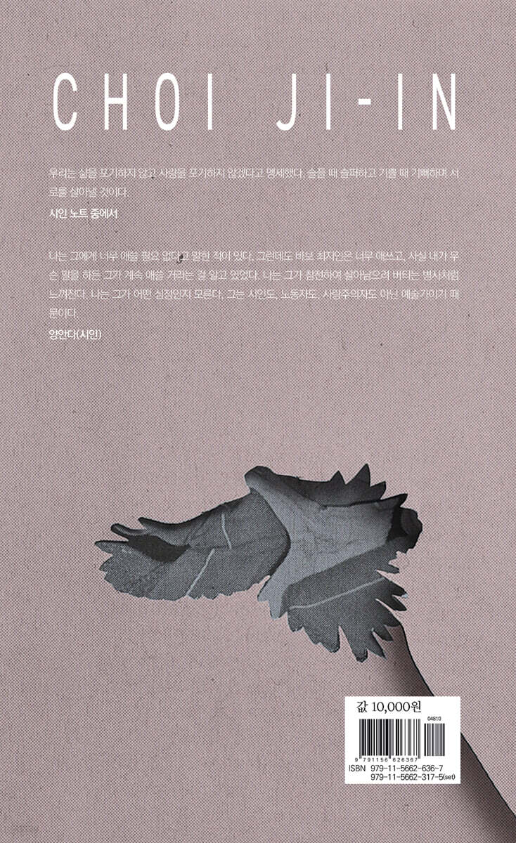 나는 그에게 너무 애쓸 필요 없다고 말한 적이 있다. 그런데도 바보 최지인은 너무 애쓰고, 사실 내가 무슨 말을 하든 그가 계속 애쓸 거라는 걸 알고 있었다. 나는 그가 참전하여 살아남으려 버티는 병사처럼 느껴진다. 나는 그가 어떤 심정인지 모른다. 그는 시인도, 노동자도, 사랑주의자도 아닌 예술가이기 때문이다. - 양안다 (시인)