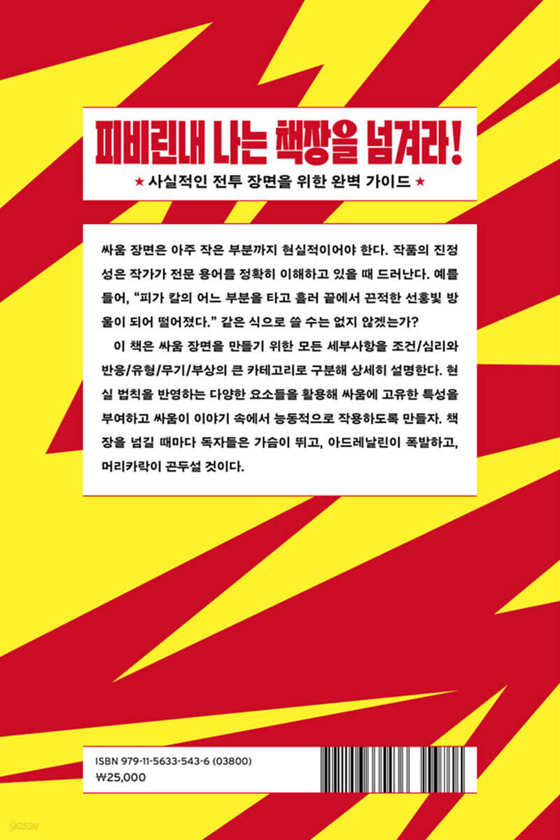 [ROUND 1 조건] 01 왜 … 015 강도│속도│변수 02 어디서 … 023 지형과 구조물│기후│규모 03 누가 … 033 체격│능력│기술 04 장면 만들기 … 045 목표 설정하기│개요 짜기│조사하기│단순화하기│감정 전달하기 [ROUND 2 심리와 반응] 05 두려움 … 069 근본적 두려움│생산적 두려움 06 아드레날린 … 078 부수적 작용: 좋은 점│부수적 작용: 나쁜 점│부작용: 덤프 07 복합 반응 … 085 자세│항복│경직│뇌의 위협 감지 08 살인과 트라우마 … 096 본능적 거부감│정신적 외상│외상후스트레스장애 09 여성의 공격성 … 105 언어적 폭력 선호│더 정교한 수법│돌보고 친구가 되기│환경에 따른 차이│작품 속 인물 설정 10 공격 신호 … 121 JACA│사건 발생 이전 지표 [ROUND 3 유형] 11 배경 요소 … 135 시대│문화│사회 구조│지리적 위치 12 싸움 용어 및 방식 … 143 싸움 용어│싸움 방식│비교 및 대조 13 입식 타격 … 170 펀치의 시작│충격의 방향│타격의 유형│싸움 팁│충격에 대한 반응 14 타격 방어 … 195 머리로 날아드는 펀치│몸으로 날아드는 펀치│발차기│캄보│싸움 팁 15 그라운드 게임 … 216 바닥 싸움으로 번지는 비율│그라운드 동작의 복잡성│기본 자세│서브미션│이스케이프│싸움 팁 16 길거리 싸움 … 236 일반적인 부상│복부 부상 17 인간 이외의 적 … 247 로봇│외계인 18 심리전: 가스라이팅 … 268 악당│가스라이팅: 개요│가스라이터의 성격│가스라이팅 전략│가스라이팅 피해자의 반응 19 싸울 수 있는 권리 … 285 법률과 자기 방어│합리성│물리력 vs 치사적 물리력│정당방위│자기 방어를 위한 대안들│작품에 적용하기 [ROUND 4 무기] 20 무기 사용 시 고려사항 … 307 시대│문화│지리적 위치│체격│휴대와 노출│작품 속 목숨의 가치 21 칼 … 321 기본 지식 22 칼: 세부사항 … 328 싱글에지 vs 더블에지 vs ‘더블에지’스러운│칼의 유형│칼날│특수 칼 23 칼: 공격점 … 342 칼싸움 스탠스│하이/로우/레프트/라이트│목표 지점 노출시키기│타이머와 스위치 24 서양 검 … 350 기본 지식 25 검: 세부사항 … 355 손잡이│가드│싱글에지│더블에지│검몸통의 모양│브로드│소드브레이커│작품 속 검의 의미 26 총기 … 373 유형 1: 발사 후 수동 장전│유형 2: 발사 후 자동 장전│권총│권총 및 소총의 탄약│소총│머스킷│남북전쟁 시대 전장형 소총 발포 8단계│산탄총 27 주변의 무기 … 387 부엌│거실│화장실│침실│차고│자동차│교실│사무실│기내 및 공항 28 독물 … 397 관련 의학 용어│독소 vs 독물 vs 독액│독물과 독소│독성 식물│독사 [ROUND 5 부상] 29 통제된 싸움에서의 부상 … 423 일반적인 부상│특정 부위의 부상│몸통│신체 하부 30 칼에 의한 상처 … 437 자창│특정 무기에 의한 상처 31 총기에 의한 상처 … 443 총상 통계│총상 유형 32 출혈에 따른 영향 … 448 혈액량│출혈 등급│내출혈│출혈 시 통증│저혈량 쇼크│응급 처치 33 사망 시점 추정 … 460 죽음 임박 신체 증상│사후 신체 변화│경직 방해 및 방부 처리 머리카락이 곤두서는 싸움 장면을 만들자! … 468 도움을 준 사람들 … 470 참고 자료 … 474 |