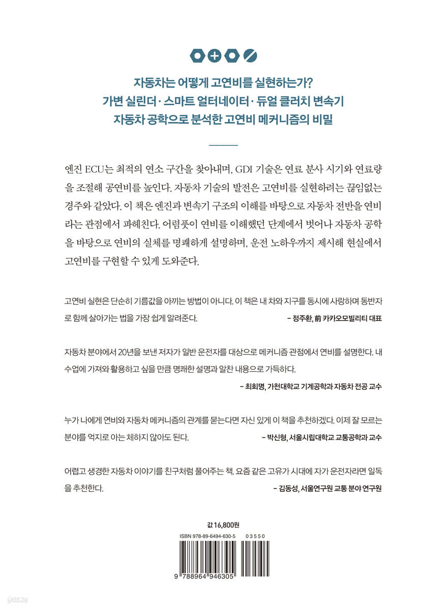 고연비 실현은 단순히 기름값을 아끼는 방법이 아니다. 이 책은 내 차와 지구를 동시에 사랑하며 동반자로 함께 살아가는 법을 가장 쉽게 알려준다. - 정주환 (前 카카오모빌리티 대표)