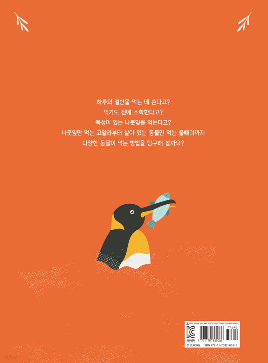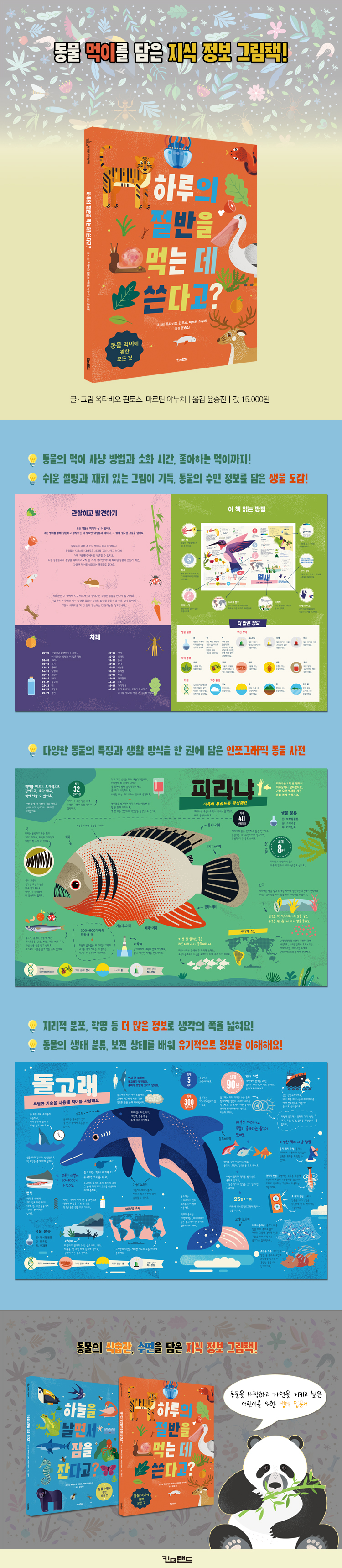 먹이는 동물의 생활 전반에 영향을 미쳐요. 먹이 활동을 하기에 좋은 환경에 사는지, 아닌지에 따라 동물의 기대 수명이 달라질 수 있어요. 기후나 환경의 변화로 서식지의 먹이 조건이 달라진다면 동물의 생존에도 영향을 줄 수 있지요. 또, 번식하는 데 필요한 먹이도 있어요. 암컷 모기는 자기 몸무게보다 무려 세 배나 많은 양의 피를 섭취할 수 있는데, 이는 알을 낳는 데 필요한 단백질을 보충해야 하기 때문이지요. 먹이는 동물의 서식지를 결정하기도 해요. 달팽이는 등딱지를 건강하고 튼튼한 상태로 유지하기 위해 칼슘이 풍부한 먹이를 찾아다녀요. 동물의 뼈나 돌, 모래나 흙을 먹기도 해요. 먹이 사슬의 정점에 있어 천적이 없는 호랑이는 어렵지 않게 먹잇감을 구할 수 있을 거라고 생각하기 쉽지요. 하지만 하루에 고기 50킬로그램도 먹어 치울 수 있는 호랑이도 때때로 먹이를 구하지 못해 몇 주 동안 아무것도 먹지 못한 채, 먹이를 찾아 30킬로미터를 이동하기도 한답니다. 어떤 동물들은 체내에서 이유식을 만들어 새끼에게 먹여요. 바로 펭귄과 코알라지요. 암컷 펭귄은 수컷에게 알을 맡기고 먹이를 구하기 위해 바다로 떠나요. 수컷은 암컷이 돌아올 때까지 얼음 조각을 깨 먹으며 알을 지키지요. 알이 부화하면 수컷 펭귄은 위장 속에 있던 먹이를 게워 내 새끼에게 먹여요. 더 이상 게워 낼 게 없으면 새끼들을 굶기지 않으려고 위벽의 점막을 녹여 게워 내 먹이지요. 코알라는 독성이 있는 나뭇잎을 주식으로 하는 동물이에요. 코알라는 미성숙한 상태로 태어나서 6개월 동안 젖을 먹고 자라며, 생후 1년이 될 때까지 어미 등을 타고 다녀요. 이때 어미의 몸은 ‘팹’이라는 이유식을 만들기 시작하지요. 팹은 어미가 먹어서 반쯤 소화된 채 배설한 유칼립투스 나뭇잎이에요. 팹은 일반 배설물에 비해 미생물 수가 훨씬 많지요. 이 미생물은 새끼 코알라가 질긴 식물의 섬유소를 소화할 수 있게 해요. 그뿐만 아니라, 이 미생물은 새끼가 성장하는 데 꼭 필요한 양질의 단백질원이기도 해요. 이처럼 먹이는 생존은 물론 번식과 서식지 등 동물의 한살이 전반에 영향을 미쳐요. 앞서 소개한 것처럼 이 책은 ‘동물’ 먹이를 중심으로 동물과 관련한 거의 모든 정보를 소개하고 있어요. 자칫 딱딱하게 다가올 수 있는 방대한 양의 정보를 재미있는 글과 일러스트, 인포그래픽으로 쉽고 직관적으로 이해할 수 있게 디자인했어요. 판다는 왜 하루의 절반을 먹는 데 쓰게 되었을까요? 먹기도 전에 소화할 수 있는 동물은 누구일까요? 독성이 있는 나뭇잎을 먹는 OOO는 어떻게 살아남을 수 있었을까요? 좋아하는 동물의 먹이에 관한 특별한 비밀을, 책 속에서 찾아보세요. 초등 교과 연계 2학년 2학기 겨울 02. 겨울 탐정대의 친구 찾기 3학년 1학기 과학 03. 동물의 한살이 3학년 2학기 과학 02. 동물의 생활 |