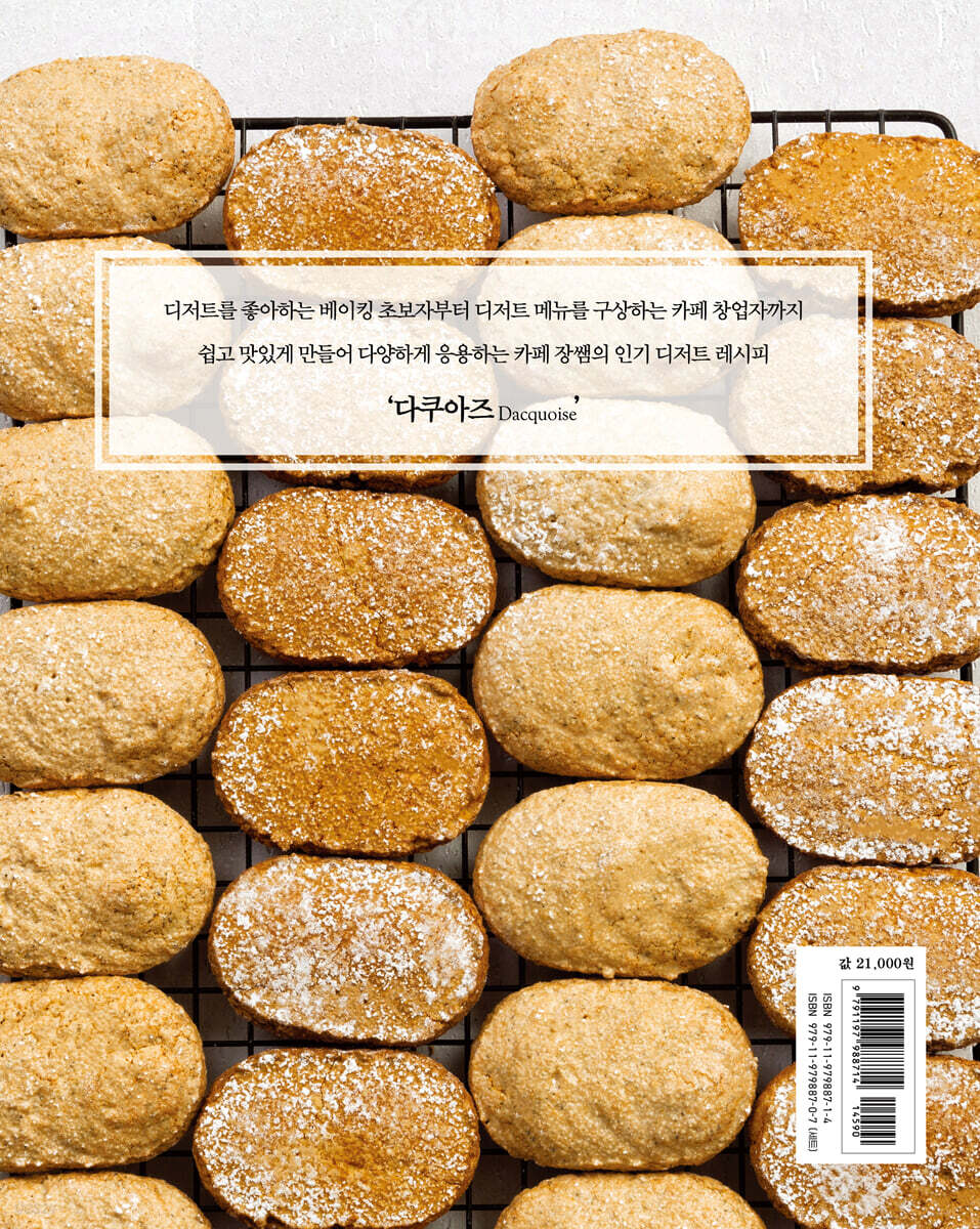 프랑스 정통 디저트, 다쿠아즈 이 책을 활용하는 법 CLASS 01. 준비하기 01. 필수 도구 02. 기본 재료 03. 오븐 사용법 04. 짤주머니 사용법 CLASS 02. 다쿠아즈 시트 만들기 01. 플레인시트 반죽 02-1. 틀을 이용한 반죽 성형 02-2. 유산지를 이용한 반죽 성형 03. 굽기 CLASS 03.다쿠아즈 크림 만들기 01. 파타봄브 방식 크림 02. 앙글레즈 방식 크림 CLASS 04. 장쌤의 다쿠아즈 레시피 01. 진한 말차 다쿠아즈 02. 얼그레이 다쿠아즈 03. 바닐라 다쿠아즈 04. 진저레몬 다쿠아즈 05. 캐러멜헤이즐넛 다쿠아즈 06. 오레오까망베르 다쿠아즈 07. 망고치즈 다쿠아즈 08. 쑥인절미 다쿠아즈 09. 더블초콜릿 다쿠아즈 10. 군고구마 다쿠아즈 11. 시나몬단호박 다쿠아즈 12. 카페라테 다쿠아즈 13. 둘깨 다쿠아즈 14. 카야코코넛 다쿠아즈 15. 체리 다쿠아즈 16. 애플파이 다쿠아즈 17. 트리플베리 다쿠아즈 18. 민트초코 다쿠아즈 19. 아몬드크럼블 다쿠아즈 20. 티라미수 다쿠아즈 CLASS 05. 다쿠아즈 케이크 01. 오렌지쇼콜라 02. 피스타치오딸기 미니케이크 03. 래밍턴 04. 몽블랑 05. 당근케이크 SPECIAL CLASS. 다쿠아즈 더 맛있게 즐기기 최상의 맛을 위한 다쿠아즈 보관법 디저트 데코레이션을 위한 과일, 채소 건조법 안전한 보관을 위한 진공 밀폐법 망가진 다쿠아즈 시트 활용법 - Editor’s Pick - 모양 틀 없이 시트를 만들 수 있는 패턴 |