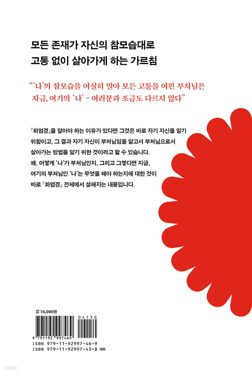 이 책은 불교 입문자와 인문학 독자를 위해 불교 경전의 핵심적인 내용만 쏙쏙 뽑아 쉽고 대중적인 언어로 풀어낸 ‘인문학 독자를 위한 불교 경전’ 시리즈 세 번째 책이다. 『화엄경』은 경전명 그대로 온갖 꽃으로 장엄된 부처님의 세계를 설하는 경전이다. 그 세계는 과연 어떤 세계일까? 하지만 그 세계를 확인하기 위해 방대하고도 어렵게 느껴지는 『화엄경』 원전을 용기 있게 들추기는 부담스러울 터. 이 책은 화엄의 세계로 나아가기 위한 일종의 준비운동이자 고통을 여의고 행복으로 나아가는 길의 첫걸음이 되어 줄 것이다.