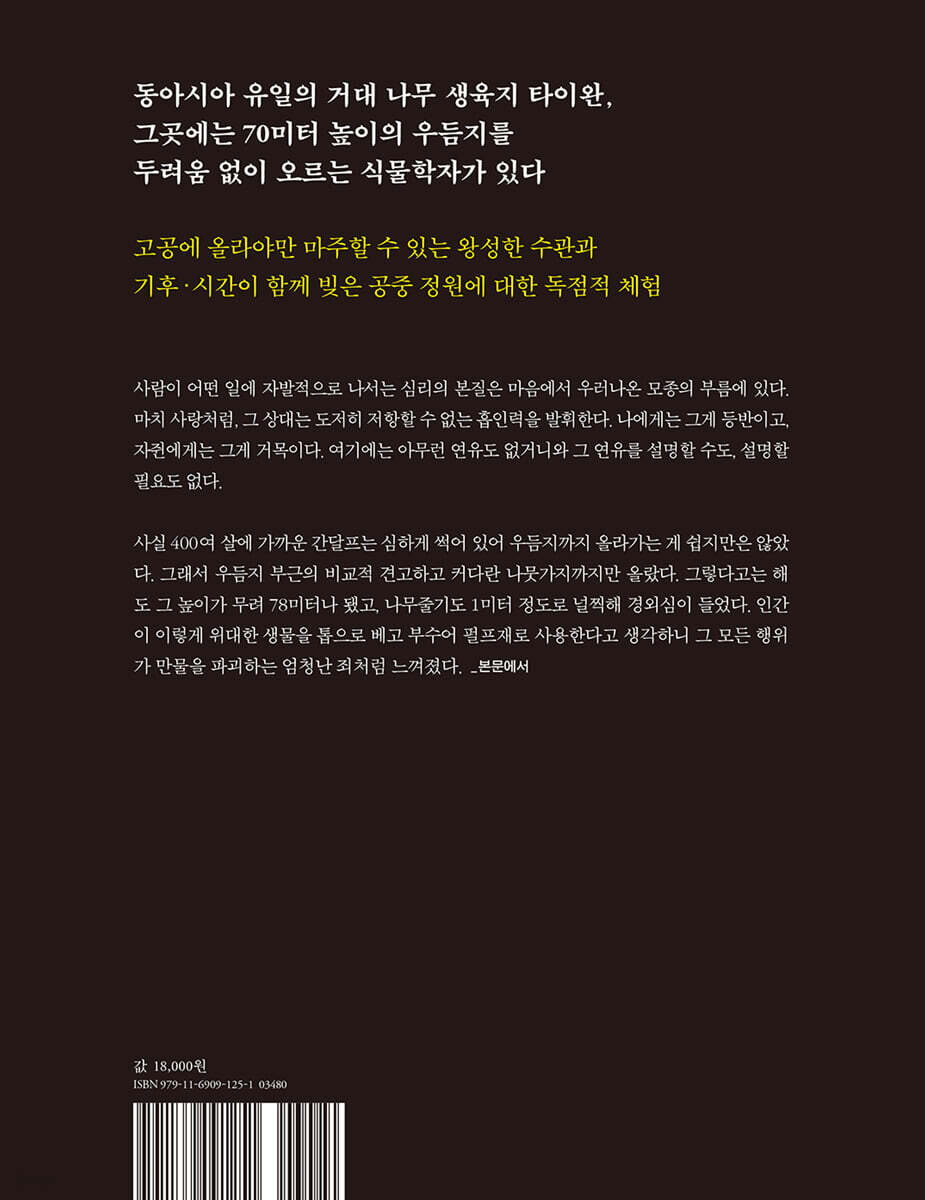 --- p.29 그 뒤 연 이틀간 우리 셋은 로프를 짊어진 채 오를 만한 나무를 찾아 사방을 뒤졌다. 추이츠와 추이츠 하산로 부근에도 아름다운 향나무와 타이완전나무가 많았다. 이 무렵 타이완전나무에는 아름다운 흑자색 구과가 잔뜩 열려 있었다. 이 정도 해발고도에서는 향나무와 타이완전나무가 그다지 크게 자라지 않아, 나무 높이도 20미터 정도에 불과했다. 그러나 전 세계를 통틀어도 3500미터 가까운 해발고도에서 20미터 이상의 나무가 자라는 곳은 드물다. 견식이 넓은 네덜란드 은사님 말씀에 따르면 타이완은 고산 툰드라 생태계에서 천연 수목 한계선을 찾아볼 수 있는 좋은 예를 보여주는 소수의 나라 중 하나이며, 그 형태도 ‘이보다 더 좋을 수는 없다’. --- p.65 2014년 치라이의 동능선을 올랐던 때가 떠올랐다. 파퉈루산의 산길에는 과거에 쓰였던 삭도목이 군데군데 남아 있었다. 대부분은 이미 말라 죽은 상태였는데, 손가락 두세 개를 합쳐놓은 굵기의 철사가 나무껍질을 벗겨낸 탓이었다. 파퉈루산에서 연해의 임도로 내려가던 중 마주한 가장 인상 깊었던 장면은 철사에 꽁꽁 묶인 커다란 편백이었다. 40년이 넘는 세월 동안 거칠게 결박되어 있던 이 커다란 나무는 아직까지도 고집스럽게 생존해 있었다. 나는 내 손이 닿을 수 있는 경우라면 나무껍질을 파고든 철사를 힘껏 잡아당겨보았다. 하지만 내 연약한 힘으로는 어림도 없었다. 과거 벌목꾼들이 두껍고 튼튼한 팔로 단단히 옭아매놓은 철사를 풀기란 하늘에 오르는 것보다 더 어려웠다. --- p.90 우리 둘이 나무에 올라 침낭 등 수면 장비를 모두 설치했을 때는 이미 해가 완전히 기운 뒤였다. 스티브는 그제야 간달프의 벌에 로프가 걸렸단 걸 알아차렸지만, 섬의 칠흑 같은 어둠 속에서는 장해물을 제거할 수 없었다. 그는 우리에게 조심하라고 당부하더니 홀로 나무에서 내려가 차로 돌아가버렸다. 타향의 거목 위에 남겨진 우리는 코를 쓱쓱 문지르곤 밤을 보낼 준비를 했다. 둘이서 한동안 허둥대느라 지상 40미터 높이에 매달린 해먹에서 장비를 떨어트리기도 했지만, 날이 밝을 때까지 무사히 버틸 수 있었다. 참 다행이었다. 큰유황앵무의 시끄러운 울음소리에 잠에서 깼을 때는 다시 태어난 듯한 느낌이 들었다. --- p.131 임도에 있는 무너진 사무소 건물에서 밤을 보낸 적이 있다. 지붕의 기와 틈 사이로 별 가득한 하늘이 보였다. 이런 경치를 쉽게 감상할 수 있는 곳은 전 세계에서 타이완뿐일 것이다. 타이완에서는 한 달씩이나 산 넘고 물 건너지 않고도, 2~3일이면 열도의 산림 가장 깊숙한 곳으로 들어가 자연의 아름다움과 나만의 고독을 누릴 수 있다. --- p.158 그해 4월 제2차 탐사를 나섰을 때는 대량의 등산 리본과 벌목도를 준비해 길을 내면서 나아갔다. 하지만 목표물까지의 직선거리가 300미터도 채 안 남은 곳에서 철벽같은 전죽의 바다를 만나는 바람에 기가 꺾여 돌아와야만 했다. 우리는 이대로 물러나는 것이 아쉬워 빗속에서 드론을 띄웠고, 타오산 신목과 비슷한 나무의 영상을 얻었다. 게다가 라이다 팀은 타오산 신목 주변을 촬영한 항공사진을 보더니 그곳에 연못이 있는 것 같다고 했다. 그 나무가 진짜로 있는 모양이네? 의욕이 샘솟았다. --- p.187 사람과 나무는 다르다. 나무가 크게 자라는 원인은 ‘키 크고 돈 많고 잘생겨야’ 연애 상대를 찾기에 더 수월해서가 아니다. 숲에서 가장 큰 나무가 갖는 이점으로는 이런 것들을 상상해볼 수 있다. 이웃보다 키가 크면 수관층도 비교적 높은 곳에 형성될 테니 보다 많은 햇빛(에너지의 근원)을 받을 수 있다. 아울러 이웃 나무의 햇빛을 막아 그들이 크지 못하게 할 수도 있다(배불리 먹지 못하게 하는 것이다). 키가 자라면 자랄수록 작은 나무들과는 점점 더 멀어지고, 귀찮은 덩굴식물과도 떨어질 수 있다. 불행히 숲에 화재가 발생하더라도 중요한 기관(잎, 싹, 꽃, 열매)이 불에 타지 않을 가능성이 높다. 종자와 꽃가루를 퍼트리더라도 더 높은 곳에서 퍼트려야 더 멀리 퍼트릴 수 있다. --- p.216 |