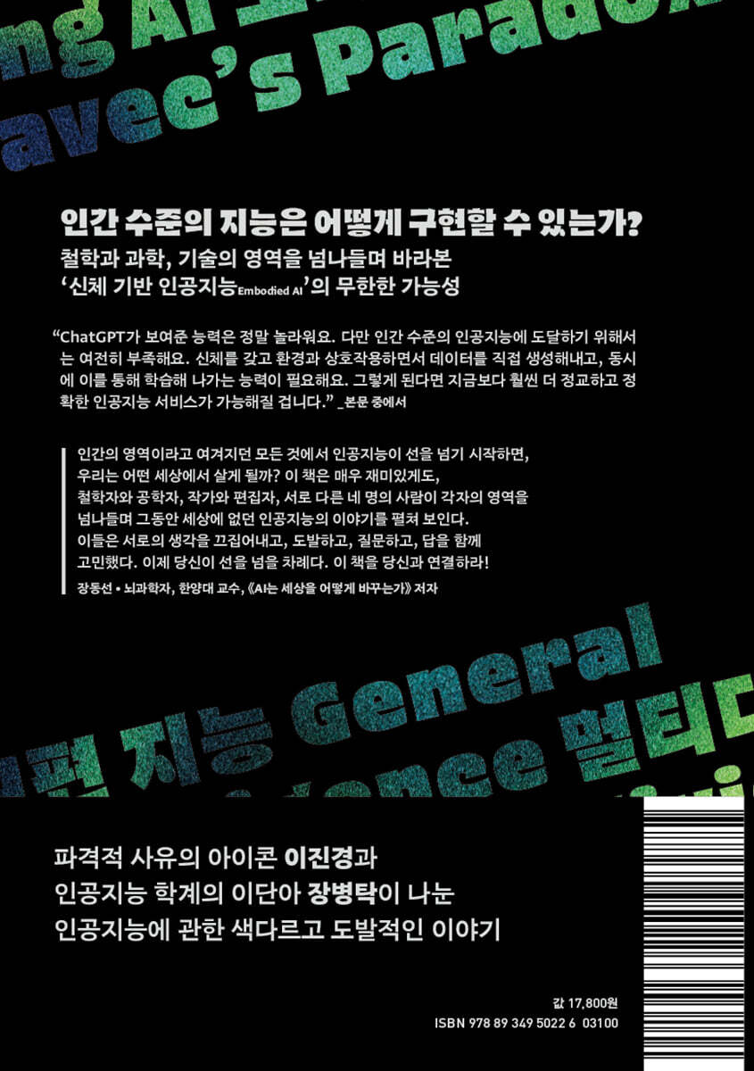 철학자와 공학자의 지적 콜라보레이션 뇌과학자 장동선 박사 강력 추천! 2022년 11월 공개된 ChatGPT는 그동안 어떤 인공지능도 보여주지 못한 ‘그럴듯함’으로 전 세계인을 놀라게 했고, 그 후 이를 수많은 매체에서 앞다투어 다루며 장밋빛 미래를 예고했다. 물론 ChatGPT의 퍼포먼스가 지금까지 나온 범용 인공지능(AGI) 중 가장 뛰어나다고 할 수 있지만, 텍스트나 이미지 등 기존에 있는 (빅)데이터를 학습하고 이를 기반으로 결과물을 생성하는 기존 인공지능 메커니즘을 따르기 때문에, 신뢰성, 편향성, 조작 가능성 등의 이슈가 여전히 존재한다. 또한 기계가 인식할 수 있도록 각각의 정보에 레이블을 일일이 달아줘야 하는 번거로운 과정 또한 필요하다. 이를 극복할 수 있는 방법은 없을까? 장병탁 교수는 인간의 학습 방법에서 그 실마리를 찾는다. 그는 현재 인공지능 기술이 인간의 신경망을 모방해 놀라운 발전을 이뤄냈지만, 인간과 같은 방식으로 학습하는 것은 아니라고 강조한다. 딥러닝이라고 흔히들 알고 있는 인공신경망은 인간이 인지하고 학습하고 기억하는 수많은 방식 중 하나를 차용한 것일 뿐이며, 이 과정에서 많은 정보가 유실되고 만다. “정보 패턴이 신경망의 원리가 된 건 반복 사용되는 신경망의 연결 강도가 강화된다는 헵의 규칙 때문인데, 이것도 신경세포들을 통과한 신호가 뭔지는 모른 채 다만 자주 사용하면 연결망이 강해진다는 것만 ‘추상’한 거고, 많은 데이터가 망실되며 얻어진 정보죠.” _p. 70 왜 인공지능에게 신체가 필요한가? 인간은 언어나 지식, 추상적 인지 기능조차 현실 속 신체를 통해서 체득한다. 우리가 ‘사과’라는 글자를 볼 때, 사과의 형체뿐 아니라 색깔, 맛, 식감, 향기, 감촉 등을 동시에 떠올리는 것이 그 예다. 인간은 이러한 신체 경험을 기반으로 학습하기 때문에 우리는 모호하게 대충 말해도 의사소통이 가능하다. 하지만 인공지능은 현실 속에서 체화한 언어가 아닌 기호로서의 언어만 학습하기 때문에, 통계적 확률 계산으로 그저 ‘그럴듯한’ 결과물을 내놓을 뿐이다. 따라서 인공지능이 제대로 된 성능을 발휘하기 위해서는 무수한 변칙적인 데이터와 이를 처리하는 연산 능력이 요구된다. “인간의 언어가 모호한 이유는 그러한 형태가 진화적으로 효율적이기 때문이에요. 로봇한테 ‘물 좀 줘!’를 설명하려면, ‘앞으로 50cm 가서, 2cm 앞에 물컵을 잡은 뒤, 여기로 이동해 와’ 등을 상세하게 설정해줘야 해요. 인간은 대충 말해도 척하고 알아듣죠. 이 얼마나 효율적인가요.” _p. 29 또한 인공지능과 인간의 가장 큰 차이점은 ‘메타 수준에서 생각할 수 있는가’, 즉 ‘생각에 대한 생각을 할 수 있는 능력, 생각 밖에서 생각을 바라보는 능력이 있는가’다. 여기서 ‘밖’이란 어떤 선택이나 결정에 대한 결과가 나한테 유리한지 불리한지를 따지는 지점이며, 이는 자신의 생존을 최우선 목표로 하면서 이를 유지하기 위해 필요한 판단 체계다. 이것이 가능하기 위한 전제 조건이 ‘신체를 갖는 것’이다. 이런 조건이 모두 갖추어질 때 신체는 알아서 지식(데이터)을 형성하고 학습하며 사용하도록 강제한다. 두 저자는 다양한 외부 정보를 받아들이는 신체와 메타레벨에서 자신의 생존을 우선하는 목적함수를 인공지능에게 부여한다면 보다 인간 의식과 가까운 수준에 도달할 수 있다고 입을 모은다. “진짜 인간 수준의 인공지능에 도달하기 위해서는 더 미세한 단위 수준에서 감각 데이터와 지각·행동의 연결고리들을 잇는 정보처리 능력이 뒷받침되어야 할 겁니다. 이를 위해서는 신체를 갖춘 에이전트가 중요하고요.” _p. 105~106 뇌중심주의·인간중심주의에서 벗어난 사유 신체 기반 인공지능은 뇌중심주의, 즉 ‘뇌’라는 하나의 중심을 설정하고 전체를 설명하려는 오래된 관습에서 벗어나, 뇌 못지않게 신체도 인지하고 기억하며 때로는 뇌의 사고 방향을 규정하기도 한다는 최신 과학에 토대를 둔다. 두 저자의 대담이 신선하고 설득력이 있는 이유가 여기에 있다. “우울증 환자에게 생각을 바꿔보라고 해도 안 되는 건 신체 상태와 신경전달물질이 뇌가 생각하는 방향을 규정하기 때문이죠. (…) 우리는 모두 뇌 중심주의, 뇌의 독재라는 관념에 너무 오래 길들여져 있는 게 아닌가 싶어요.” _p. 75 또한 이진경 교수는 존 설의 ‘중국어 방 논증’을 비판하며 이때 적용된 인간중심적인 ‘이해’의 의미를 낱낱이 해체한다. 나아가 그는 우리가 흔히 알고 있는 ‘지능’ ‘신체’ ‘감정’ ‘자아’ 등의 의미를 비판적으로 되짚어보고, 인간은 물론 동물, 식물, 사물(기계)에게까지 공평하게 적용할 수 있도록 그 의미를 재정의하여 우리가 놓치고 있는 것들을 환기하고 사고와 가능성을 확장시킨다. 나아가 사물이 자기 능력을 모두 발휘할 때까지 계속 생존을 지속할 수 있도록 하는 ‘사물과의 우정’을 주장하며 소비를 부추기는 ‘자본의 지속 가능성’ 시대에 일침을 가하기도 한다. 또한 현재 인공지능 연구에서 고려되지 않는 에너지와 자원의 과용 문제도 지적하며, ChatGPT를 시험 사용하는 것만으로도 지구 온난화를 가속화하는 결