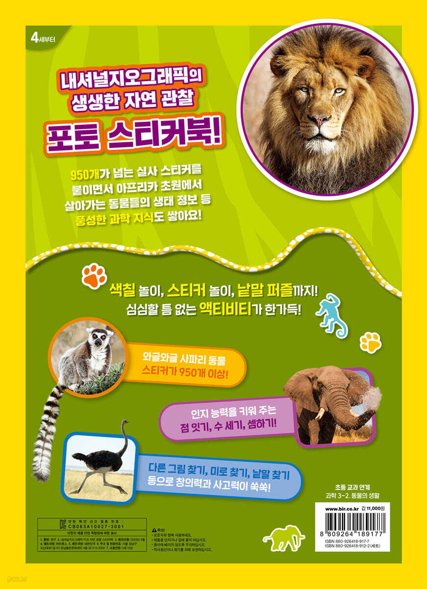 두고두고 꺼내 보는, 공부가 되는 스티커북! 전 세계 28개국이 함께 보는 내셔널지오그래픽에서 만든 포토 스티커북 「내셔널지오그래픽 키즈 자연 관찰 스티커북」 시리즈가 ㈜비룡소에서 출간되었어요. 이 시리즈에는 사파리, 공룡, 강아지, 바닷속 동물처럼 아이들의 사랑을 듬뿍 받는 주제에, 우주, 세계 지도와 문화처럼 똑똑한 지식이 쌓이는 주제를 더했답니다. 페이지를 넘겨 깜찍한 미어캣, 덩치 큰 하마, 날쌘 치타 등 생생한 동물 포토 스티커를 붙여 보세요. 또, 궁금했던 아프리카 동물 정보를 큼직한 사진과 쉽고 짤막한 설명으로 접해 보세요. 어느새 자연 관찰 지식도 머릿속에 쏙쏙 채워져요. 이 시리즈는 스티커를 다 붙여도 버릴 수가 없는, 초등까지 두고두고 꺼내 볼 수 있는 알찬 자연 관찰 스티커북이랍니다. ‘내셔널지오그래픽’의 고퀄리티 포토 스티커로 붙이고, 꾸미고! 미로 찾고, 숫자 세며, 심심할 틈 없는 액티비티 북! 이 시리즈는 1888년부터 130여 년 동안 전 지구를 연구해 온 내셔널지오그래픽의 수준 높은 사진으로 포토 스티커를 꾸몄어요. 다큐멘터리처럼 생생한 사진은 아이들의 호기심을 한껏 자극한답니다. 무려 800개가 넘는 포토 스티커가 넉넉하게 담겨 있어서 아이들이 좋아하는 소지품도 꾸미면서 신나게 스티커 놀이를 할 수 있어요. 또, 페이지마다 미로 찾기, 선 긋기, 숫자 세고 셈하기, 틀린 그림 찾기 등 아이들의 눈길을 사로잡는 액티비티가 가득해요. 잠시도 지루할 틈이 없는 신개념 액티비티 스티커북이랍니다. 귀가 펄럭 코끼리, 얼룩이 기린, 어흥 사자가 뛰노는 사파리가 펼쳐져요! 『사파리 동물』에는 동물원 최고 인기 동물들의 똑똑한 정보가 가득 담겨 있어요. 아프리카코끼리가 아시아코끼리보다 덩치가 크다는 사실을 알고 있었나요? 하마가 물속에서 최대 5분 동안 숨을 참을 수 있다는 건요? 깜찍한 새끼 표범과 무뚝뚝한 표정의 고릴라, 화려한 앵무새한테는 어떤 비밀이 있을까요? 아프리카 사파리에 사는 동물들의 포토 스티커를 즐겨 보세요. 초등 교과 연계! 과학, 사회 교과서도 미리미리 예습! 이 시리즈는 모두 초등 과학, 사회 교과서와 연계되어 있어요. 『사파리 동물』, 『강아지』, 『바닷속 동물』에서는 초등 3학년 과학 교과의 ‘동물의 생활’, ‘동물의 한살이’를 미리 익힐 수 있어요. 『공룡』에서는 초등 4학년 과학의 ‘지층과 화석’을, 『지도와 세계 문화』에서는 초등 6학년 사회의 ‘세계 여러 나라들’을 엿볼 수 있지요. 이 시리즈는 초등 입학 전 아이들에게 학습 자신감을 심어 주는 멋진 자연 관찰 스티커북이랍니다. |