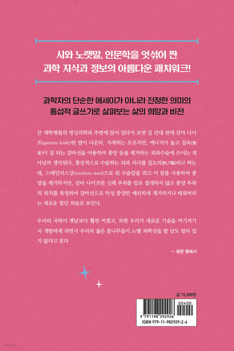---「‘들어가면서’」중에서 “우리가 맨눈으로 식별할 수 있는 물체의 크기는 얼마나 될까. 작은 곤충의 크기가 1~10mm이다. 우리 머리카락의 굵기는 대략 0.05~0.1mm이다. 이렇게 작은 수준의 길이를 표시하기 위해서는 밀리미터보다 마이크로미터(μm)로 표시하는 것이 편리하다. 1mm는 1,000μm이므로 머리카락의 굵기는 50~100μm라고 표시된다. 우리 머리카락은 길이가 수 cm 정도로 길어서 우리 눈으로 쉽게 식별되지만, 지름이 50μm인 둥근 먼지는 맨눈으로 식별이 어렵다. 이것을 가능하게 해 준 것이 광학현미경이다. 현미경의 발명으로 우리는 마이크로미터의 세계를 볼 수 있게 되었다. 특히 생물 분야에서 경이로운 발견이 있었는데, 그 대표적인 것이 바로 세포(cell)의 발견이다. 적혈구 세포의 크기가 100μm 정도이고, 박테리아의 크기는 1~10μm이다. 이것은 새로운 세계의 발견이었다. 렌즈의 발명으로 먼 우주를 가깝게 볼 수 있게 됨과 동시에 미시세계도 확대해 볼 수 있게 되었다.” --- pp.22~23 “일은 결국 사람이 하는 거니까 인력(人力)이 매우 중요하다. 관련되는 말로 노동력이라는 말이 있다. 옛날 우리나라에 인력거라는 교통수단이 있었고, 인력거를 끄는 사람은 땀을 흘려가며 사람의 힘으로 손님을 이동시켜 주고 노동의 대가로 돈을 받았다. 요즘도 일부 국가의 관광지에서 비슷한 교통수단을 볼 수 있다. 한때는 짐을 옮겨주는 지게꾼이라는 직업도 있었다. 엔진에 의한 동력화가 진행되면서 이런 직업들이 없어지고 대신 택시와 화물용 용달차가 등장하였다.” --- pp.33~34 “그러나 입자의 크기가 작거나 파동의 파장이 아주 작은 세계에서는 물리적인 현상을 입자론과 파동론으로 그때그때 설명해야 하는 양면성(duality)을 갖고 있다. 파동의 입자성이니 입자의 파동성이라는 용어가 쓰이고 있다. 이는 미세세계에서 물질이 이중성을 띠고 있다는 뜻은 아니다. 다만 우리가 자연을 이해하고 설명하는 방법이 서로 달라서, 어떤 물리적인 현상은 파동론으로 설명해야 하고 다른 물리적 현상은 입자론으로 설명하여야 우리의 과학적 이해를 충족시킬 수 있다. 옛날에는 빛이 파동인 줄로만 알았더니 빛을 입자론으로 설명해야 할 때가 있다. 19세기 말에 과학자들은 빛과 전기를 둘러싼 현상, 즉 광전효과(photoelectron effect)를 기존의 물리학적인 시각인 파동론으로 설명하기에 무언가 부족하다는 것을 느끼게 되었다.” --- p.60 “보른(Born)의 외손녀가 미성과 미모로 한 시대를 풍미했던 유명한 가수 올리비아 뉴튼존(Olivia Newton-John, 1948~2022)이다. 영국에서 태어나 오스트레일리아에서 성장하고 세계적인 가수로 활동하다가 미국에서 죽은 그녀의 대표적인 노래 ‘Physical’이 생각난다. 1981년에 이 노래를 발표해서 빌보드 핫 100 역사상 두 번째로 10주 연속 1위를 했으며 이 노래 이후 10여 년 동안 10주 이상 1위를 한 노래가 없었다고 한다. 그녀의 외할아버지인 보른은 물리학(Physics) 분야에서 물체(body)의 미세한 영역인 입자(particle)에 관한 양자역학의 기초를 세웠는데 그의 외손녀인 올리비아는 노래 ‘Physical’에서 당신의 몸(body)이 내는 이야기를 들어보자고(Let me hear your body talk, your body talk) 노래하였다.” --- p.68 “치매(痴?, dementia) 환자를 데리고 종합병원의 신경과(neurology)에 찾아가면 문진 후 몇 가지 검사를 주문한다. 그 가운데 하나가 영상의학과에 가서 실시하는 ‘광전자 단층 촬영’이라고 부르는 PET(Positron Emission Tomography)이다. PET에서는 적당한 양전자 방출 방사능 핵종, 예를 들면 산소 동위원소 15O를 환자의 몸에 주사를 놓거나 먹도록 하여 몸 안을 순환하도록 한다. 이 과정에서 양전자는 방출되자마자 몸의 조직을 이루는 원자 내의 전자를 만나게 되고 둘은 바로 없어진다. 이 소멸에 따라 발생하는 감마선들의 방향으로부터 소멸의 위치, 즉 양전자가 없어지는 조직 내의 원자핵의 위치를 알 수 있다. 이런 방법으로 몇 mm의 정확도를 갖고 방사성 핵종의 농도에 관한 지도를 영상으로 만들 수 있다. 그 영상은 디지털화되어 파일로 저장되고 담당 의사는 여기에 접근할 수 있다. 이 영상을 담당 의사를 비롯한 전문가들이 해석하여 환자의 상태를 진단한다. 예를 들어 정상적인 두뇌에서 신진대사 활동이 만드는 PET 영상은 뇌의 반쪽 모습에서 양쪽이 비슷한 모양을 보이나, 비정상적인 두뇌에서는 불규칙한 스캔 영상이 나온다. 그렇지만 많은 경우 PET 영상만으로 치매의 원인을 특정하기는 어렵다.” --- pp.105~106 “요즘은 일반화되고 저렴하게 보급된 사진 관련 기술은 대략 200여 년 전에 프랑스에서 처음으로 개발되었다. 원래 사진기는 회화의 스케치를 제공하려는 목적으로 시작되었다고 하며 19세기 들어 광학 기술과 화학의 발달로 획기적인 발전이 있게 되었다. 초기에는 사진 한 장을 찍는 데에 무려 6~8시간이 걸려서 이 방법으로는 인물 사진을 찍을 수 없었고 풍경 사진만 찍었다고 한다. 그 뒤 1839년에 ‘은판 사진법’이 개발되면서 한 장을 찍는 데에 걸리는 시간이 20분으로 줄여졌고, 이 때문에 인물 사진을 찍는 것이 가능해졌다. 이 덕분에 1840~50년대에 살아있던 서양의 유명인들이 초상
