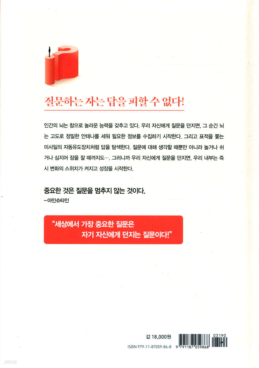 우리는 왜 잠시라도 멈추고 질문하며 살아야 할까? 저자는 이렇게 정리하고 있다. “세상엔 열심히 사는 사람들로 가득 차 있고 부지런한 사람들로 넘쳐난다. 하지만 안타깝게도 그들 대부분은 원하는 것을 이루지 못한다. 그들에겐 한 가지 공통점이 있다. 그냥 열심히만 살고 자신에게 질문하는 시간을 갖지 않는다는 것”이다. 그리고 학생들에게 늘 강조했다. “이 세상에서 말과 글로 표현할 수 있는 가장 무책임한 단어는 ‘그냥’이고, 두 번째로 무책임한 단어는 ‘어떻게 되겠지’이다.”라고. 이런 무책임한 삶에서 벗어나는 방법은 의외로 간단하다. 간간이 하던 일을 멈추고 자기 자신에게 질문하는 것이다. 저자는 우리가 질문하며 살아야 하는 근거로 다음과 같은 예를 들고 있다. “세상의 모든 위대한 발견과 문명의 진화는 모두 질문에서 시작되었다. 아리스토텔레스는 만유인력의 개념도 없었던 때에 ‘해안에서 바라본 지평선이 왜 직선이 아니고 곡선일까?’라는 질문을 통해 지구가 평면이 아니라 둥글다는 증거를 제시했다. 뉴턴은 ‘사과가 왜 위에서 아래로 떨어지지?’라고 질문하면서 만유인력을 발견했다. 제너는 ‘소를 키우는 목장에서 일하는 여자들은 왜 천연두에 걸리지 않지?’라는 질문을 통해서 종두법을 개발했다. 스마트폰과 요즘 열풍이 불고 있는 챗 GPT의 발전 역시 개발자들의 소박한 질문에서 시작됐다.” 질문하는 자는 답을 피할 수 없다! 저자는 “하루를 시작하면서 던진 아침 질문 하나가 그날 하루를 바꾸고 하루하루가 바뀌면 인생이 바뀐다.”고 말하고 있다. “자기 자신에게 던지는 질문 하나, 어찌 보면 작고 사소한 일이지만 이 작은 질문 하나가 나중에 얼마나 큰일로 이어질지는 아무도 모른다.”면서 자기 자신에게 하는 질문의 중요성을 강조한다. 이 책은 인생을 바꾸고 성장하기 위해 반드시 던져야 할 총 144개의 두 글자 질문 키워드를 포함하고 있으며 1장 성장을 자극하는 질문, 2장 생각을 바꾸는 질문, 3장 관계가 좋아지는 질문, 4장 자아실현을 위한 질문으로 구성되어 있다. 독자들은 각각의 글 제목 앞에 제시된 두 글자 키워드를 보면서 자신에게 필요하고 관심이 가는 주제를 자유롭게 찾아 읽고 질문하며 자신만의 답을 찾아나갈 수 있다. 부제 〈질문과 성장의 심리학〉에서 엿볼 수 있듯 왜 질문하며 살아야 하는지, 어떤 질문을 해야 하는지 공감할 수 있는 짧은 이야기를 다양한 심리 실험과 상담 사례와 함께 담았다. 이를 바탕으로 자기 삶과 연결하고 적용할 수 있도록 〈Morning Question〉에서 스스로 질문하고 대답하고 성장할 수 있는 시간을 마련했다. 또한 〈Today’s Review〉를 통해 자신을 성찰하고 점검해서 새롭게 도전할 수 있도록 공간을 비워두었다. 저자는 특히 개인이든 단체든 학교든, 일주일 또는 한 달 동안 ‘아침 질문 00일 챌린지’ 또는 ‘모닝 퀘스천 00일 챌린지’를 시도해서 변화하고 성장할 수 있는 발판으로 사용해보라고 권하고 있다. 세상에서 가장 중요한 질문 저자가 책에서 특별히 방점을 찍은 부분이 있다. “세상에서 가장 중요한 질문은 자기 자신에게 하는 질문”인데, 그 이유를 다음과 같이 말하고 있다. “우리는 궁금할 때 대부분 내가 아닌 다른 누군가에게 묻는다. 부모나 교사일 수도 있고 챗 GPT일 수도 있다. 그런데 가장 중요한 ‘우리 자신의 삶에 관한 질문’은 누구에게 해야 할까? 어느 누구도 아니고 바로 자신에게 해야 한다. 왜냐하면, 사람들은 아무리 좋은 해결책을 얘기해줘도 남이 한 말은 잘 듣지 않으며 자기가 찾아낸 답을 가장 신뢰하고 자기의 말을 가장 잘 듣기 때문이다.” 그러니 우리가 변화와 성장을 원한다면 간간이 가던 길을 멈추고 자신에게 질문하는 시간을 반드시 가져야 한다고 설득하고 있다. 이 책에는 자기 자신에게 질문을 던지면서 하루를 시작하면 세 가지 측면에서 변화와 성장이 시작된다고 설명하고 있다. 첫째, 목적 지향의 삶을 살게 된다. 자신에게 질문을 던지면 유혹에 휘둘리지 않고 질문과 관련한 중요한 일부터 먼저 하게 된다. 질문은 사람이 만들지만, 일단 질문이 만들어지면 질문이 사람을 이끈다. 둘째, 책임감과 자존감이 높아진다. 자신에게 질문을 던지고 답을 찾아가면서 산다는 것은 주도적인 삶을 산다는 것이고 자기 삶을 자신이 선택하고, 자기의 선택에 대해 스스로 책임을 진다는 것이다. 셋째, 다양한 해결책을 찾게 된다. 자기 자신에게 질문을 던지면 문제의 핵심을 더 깊이 이해하게 되고, 그에 대한 답을 찾기 위해 끊임없이 정보를 수집하기 시작한다. 그 과정에서 창의적인 아이디어와 새로운 해결책을 만들어낼 수 있다. |