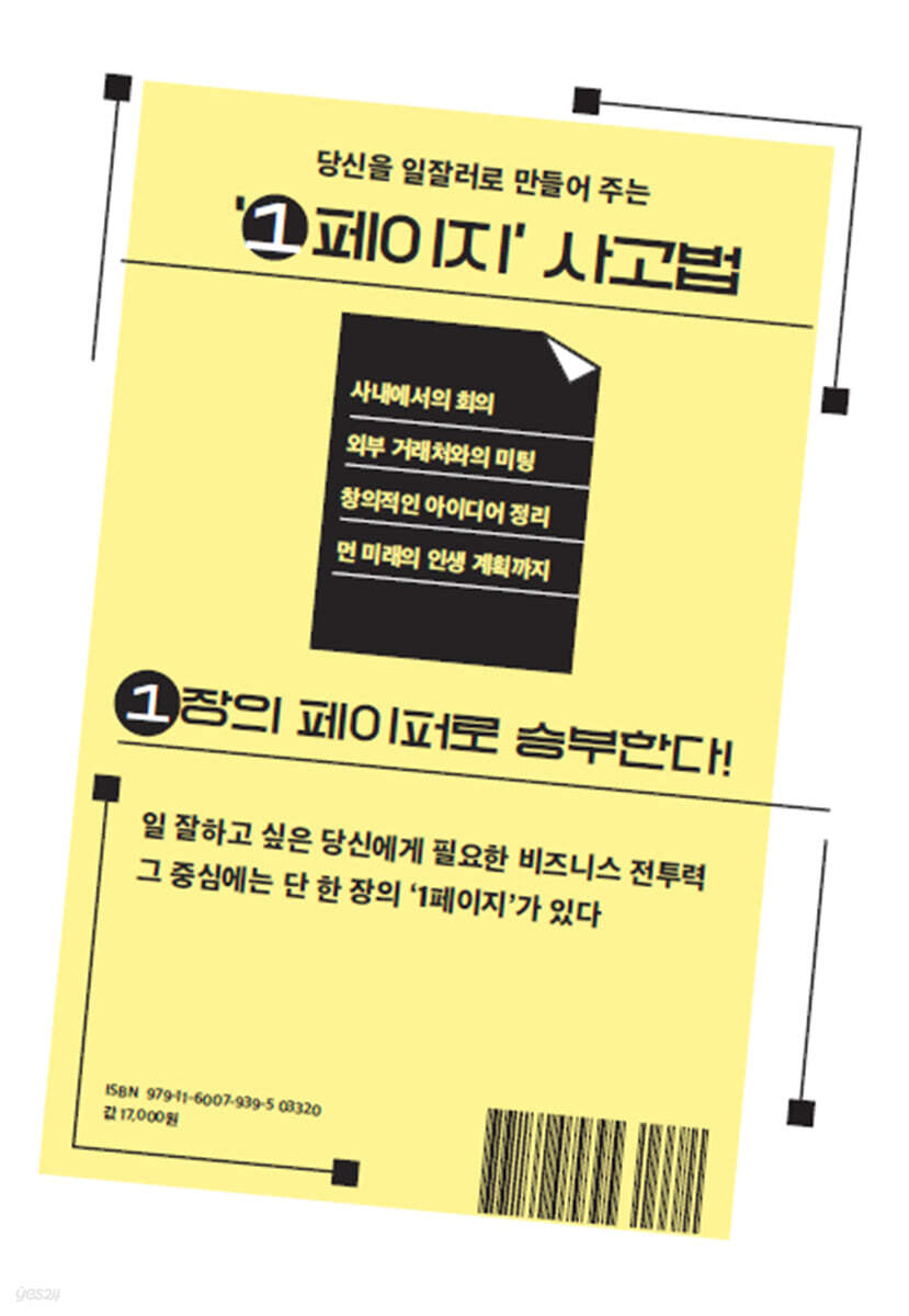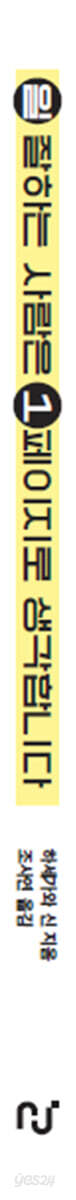PART 1. 일 잘하는 사람으로 거듭나는 1페이지 사고란? Chapter 1. 첫 이직 후 적응이 어려웠던 이유 Chapter 2. 1페이지 정리라는 큰 깨달음 Chapter 3. 1페이지 사고에 필요한 네 가지 항목 Chapter 45. 비즈니스의 모든 상황에서 도움이 되는 1페이지 Chapter 5. 1페이지의 압도적인 이점은? Chapter 6. 네 가지 항목을 채운다고 끝이 아니다 Chapter 7. 생각을 간결하게 다듬어주는 1페이지 Chapter 8. 미팅 없이는 결정도 없다 Chapter 9. 내용이 너무 많으면 움직이지 않는다 Chapter 10. 1페이지, 이것만은 ‘절대 하지 말자’ Chapter 11. 형식이 무기가 되다 PART 2. 사람을 움직이는 1페이지의 구조 Chapter 1. 1페이지는 응원받기 위한 도구 Chapter 2. ‘무엇을 넣을까?’보다 ‘무엇을 뺄까?’가 중요 Chapter 3. 1페이지는 미리 보내지 않는다 Chapter 4. 회의보고서는 초고속으로 Chapter 5. 회의가 끝나도 계속 상황을 관리한다 Chapter 6. 마음에 여유를 주는 1페이지 Chapter 7. 회의력을 높이는 마법의 문구 Chapter 8. ‘551호라이 작전’으로 목적을 제시한다 Chapter 9. 시간 때우기식 미팅은 하지 않는다 Chapter 10. ‘배경’에서 논의의 방향을 정한다 Chapter 11. ‘토의 포인트’에 원리원칙도 넣는다 Chapter 12. ‘넥스트 스텝’에 꼭 필요한 3점 세트 PART 3. 오늘의 업무부터 인생 설계까지: 다양한 1페이지 활용법 Chapter 1. 6개 카테고리, 15개 사례로 살펴보는 바로 활용 가능한 1페이지 Chapter 2. 사내 미팅① 사내 사업 계획 제안 Chapter 3. 사내 미팅② 사내 조직 시책 제안 Chapter 4. 사내 미팅③ 정례 회의 의제 Chapter 5. 외부 미팅① 첫 책 출판 회의 Chapter 6. 외부 미팅② 파트너십 제안 Chapter 7. 외부 미팅③ 외부 전문가에 제작 의뢰 Chapter 8. 일대일 미팅① 상사와의 개인 정례 미팅 Chapter 9. 일대일 미팅② 해외 본사 경영진과의 첫 미팅 Chapter 10. 일대일 미팅③ 새로운 멤버를 위한 오리엔테이션 Chapter 11. 전략 정리① 새로 옮긴 자리에서의 비전 설명 Chapter 12. 전략 정리② 창업 계획 설명 Chapter 13. 배움의 축적① 3개월에 한 번 배움 정리하기 Chapter 14. 배움의 축적② 독후 배움 정리 Chapter 15. 인생·커리어① 멘토와의 커리어 상담 Chapter 16. 인생·커리어② 인생 계획 짜기 PART 4. 우선 손으로 쓰며 생각한다 Chapter 1. ‘손으로 쓰면서’ 뼈대를 만든다 Chapter 2. 컴퓨터로 1페이지를 만들 때의 규칙 Chapter 3. 실제 상황을 상상하며 작성한다 마치며. 1페이지와 함께 개척할 밝은 미래 |
