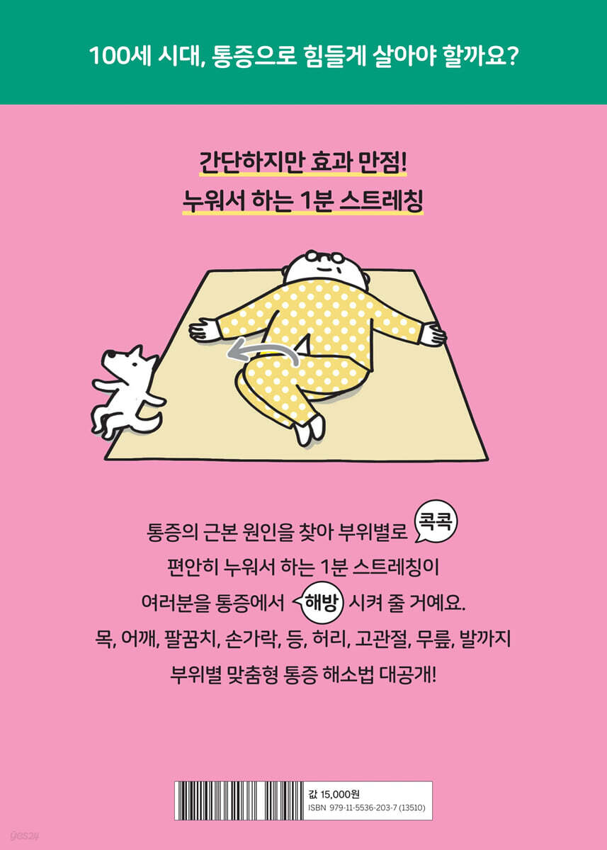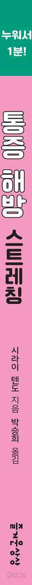 편안히 ‘누워서’ 하는 ‘1분 스트레칭’이 여러분을 통증에서 ‘해방’시켜 줍니다. 간단하지만 효과 만점! 누워서 하는 1분 스트레칭 01_ 재발하는 통증, 늘 온몸이 아프다면 ‘몸의 균형’을 체크하자 허리 통증을 호소하는 사람들이 늘어났다. 직장인 뿐 아니라 중·고등학생까지 나이를 가리지 않는다. 허리뿐만 아니라 이곳저곳의 통증으로 힘들어하는 경우도 많다. 물리 치료, 도수 치료를 받고 나면 잠시 호전되지만 통증은 곧 재발한다. 한의원, 재활의학과, 통증의학과 등 다양한 병원을 전전하기도 한다. 척추관 협착증이나 무릎 통증, 허리 통증으로 일상 보행을 힘들어하며 긴 세월 만성 통증에 시달리는 고령자도 흔하다. 100세 시대, 평균 수명은 급속도로 늘어나고 있다. 하지만 만성 통증으로 하루하루 힘든 시간을 보내는 유병장수는 우리가 기대하는 미래가 아니다. 통증의 원인을 찾아 근본적인 치유가 필요한 이들에게 『통증 해방 스트레칭』을 추천한다. 이 책의 저자는 척추관 협착증 전문가로 불리는 시라이 텐도 니시스미노에 정체원 원장. 그는 통증의 원인은 대부분 뼈나 관절의 ‘틀어짐’ 때문이라고 강조한다. 만성 통증에 시달리는 환자의 경우 무릎이 안쪽으로 틀어져 있거나 어깨의 가동 범위가 너무 좁아서 팔이 올라가지 않고 목도 잘 돌아가지 않는 등 다른 부위의 상태도 좋지 않은 경우가 많다는 것이다. 똑바로 배열되어 있어야 할 요추가 오른쪽이나 왼쪽으로 아주 살짝 틀어져 있으면 뼈나 관절이 틀어지면서 근육을 당기게 된다. 근육은 딱딱해지고 결리고 아픈 증상이 나타난다. 딱딱해진 근육은 몸의 틀어진 상태를 고정시켜 통증을 더욱 악화시킨다. 몸은 서로 연결되어 있다. 목에서 어깨, 어깨에서 팔꿈치로 이어지고 목뼈에서 등뼈, 허리, 고관절, 무릎, 발목으로 계속 이어져 있다. 어딘가에 문제가 생기면 그곳과 연결된 다른 부위에도 영향을 미치게 되는 것이다. 저자는 오사카에서 대를 이어 정체원을 운영하면서 만성 통증 환자에 특화된 치료 효과로 인기를 얻고 있다. 또한 유튜브를 통해 요추의 틀어짐을 교정하는 스트레칭법을 소개하고 있다. 쉬우면서도 간단한 저자의 독창적인 스트레칭을 통해 만성 통증을 치유한 사례만도 10만여 명에 이르고, 유튜브 조회수 또한 1,300만 회 이상을 기록하고 있다. 02_ 원인을 찾아라! 내 몸의 틀어짐 3곳 체크하기 먼저 우리 몸의 ‘틀어짐’을 확인해 보자. 경추와 견갑골, 골반 3곳이다. 좌우 귓불과 어깨 높이, 그리고 좌우 무릎의 길이를 통해 쉽게 알 수 있다. 거울 앞에서 서서 좌우의 귓불과 어깨의 위치를 봤을 때 한쪽으로 처져 있다면 그 방향으로 몸이 틀어져 있다. 또한 무릎을 꿇고 앉거나 의자에 앉았을 때 무릎의 길이가 다르다면 짧은 쪽의 골반이 뒤로 틀어져 있다. 몸이 어느 쪽으로 틀어져 있는지 확인했다면, 이 책에서 소개하는 부위별 스트레칭으로 틀어진 곳의 문제를 해결하면 된다. 전신 근육의 균형이 정돈하면서 목이나 견갑골 주위의 통증, 등 통증, 요통, 고관절 통증, 무릎 통증까지 잡을 수 있다. 03_ 허리가 아파요! 어깨가 아파요! 부위별 통증 해소법 공개 『통증 해방 스트레칭』은 통증의 근본 원인을 찾아 아픈 부위별로 통증을 해소하는 독창적인 스트레칭 방법을 소개하고 있다. 몸의 균형을 맞추고, 목의 통증에서부터 발의 통증까지 온몸의 통증 증상과 그 원인을 설명한다. 스트레칭법을 그림으로 자세히 보여주어 쉽게 따라할 수 있다. 찾아보기 쉽게 목, 어깨, 팔꿈치, 손가락, 등, 허리, 고관절, 무릎, 발까지 부위별로 정리되어 있어 늘 옆에 두고 참고할 수 있어 편리하다. 1~4장에서는 목, 어깨, 팔꿈치, 손가락까지 주로 상반신 통증 해소법, 5~9장에서는 등, 허리, 고관절, 무릎, 다리까지 주로 하반신 통증 해소법을 설명한다. 아픈 부위를 스트레칭한 후에는 그 아래 부위도 세트로 스트레칭하면 더욱 효과적이다. ‘아래 부위’란 ‘목의 통증 → 어깨 스트레칭’, ‘어깨 통증 → 팔꿈치 스트레칭’, ‘허리 통증 → 고관절 스트레칭’, ‘고관절 통증 → 무릎 스트레칭’을 하는 것이다. 목의 통증을 없애기 위해 스트레칭을 한다면 그 아래 부위인 어깨도 세트로 스트레칭 하는 식이다. · 목 통증이 있는 사람 → 어깨 스트레칭 · 어깨 통증이 있는 사람 → 팔꿈치 스트레칭 · 팔꿈치 통증이 있는 사람 → 손목 스트레칭 · 등 통증이 있는 사람 → 허리 스트레칭 · 허리 통증이 있는 사람 → 고관절 스트레칭 · 고관절 통증이 있는 사람 → 무릎 스트레칭 · 무릎 통증이 있는 사람 → 발목 스트레칭 아무리 좋은 운동법이라도 복잡하거나 어렵다면 꾸준히 실천하기 어렵다. 운동은 쉬워야 계속 할 수 있다. ‘통증 해방 스트레칭법’은 무엇보다 간단하고 쉽다. 어린아이들도 따라 할 수 있고, 고령의 어르신들도 안전하게 누워서 할 수 있다. 아침에 침대에서 일어나기 전에 1분, 혹은 잠들기 전에 1분 아픈 부위를 스트레칭 하자. 스마트폰과 전자기기 사용 시간이 폭발적으로 증가했다. 더불어 일자목, 오십견, 요통, 척추관 협착증, 허리 디스크 등 통증으로 고생하는 사람도 늘어나고 있다. 100세
