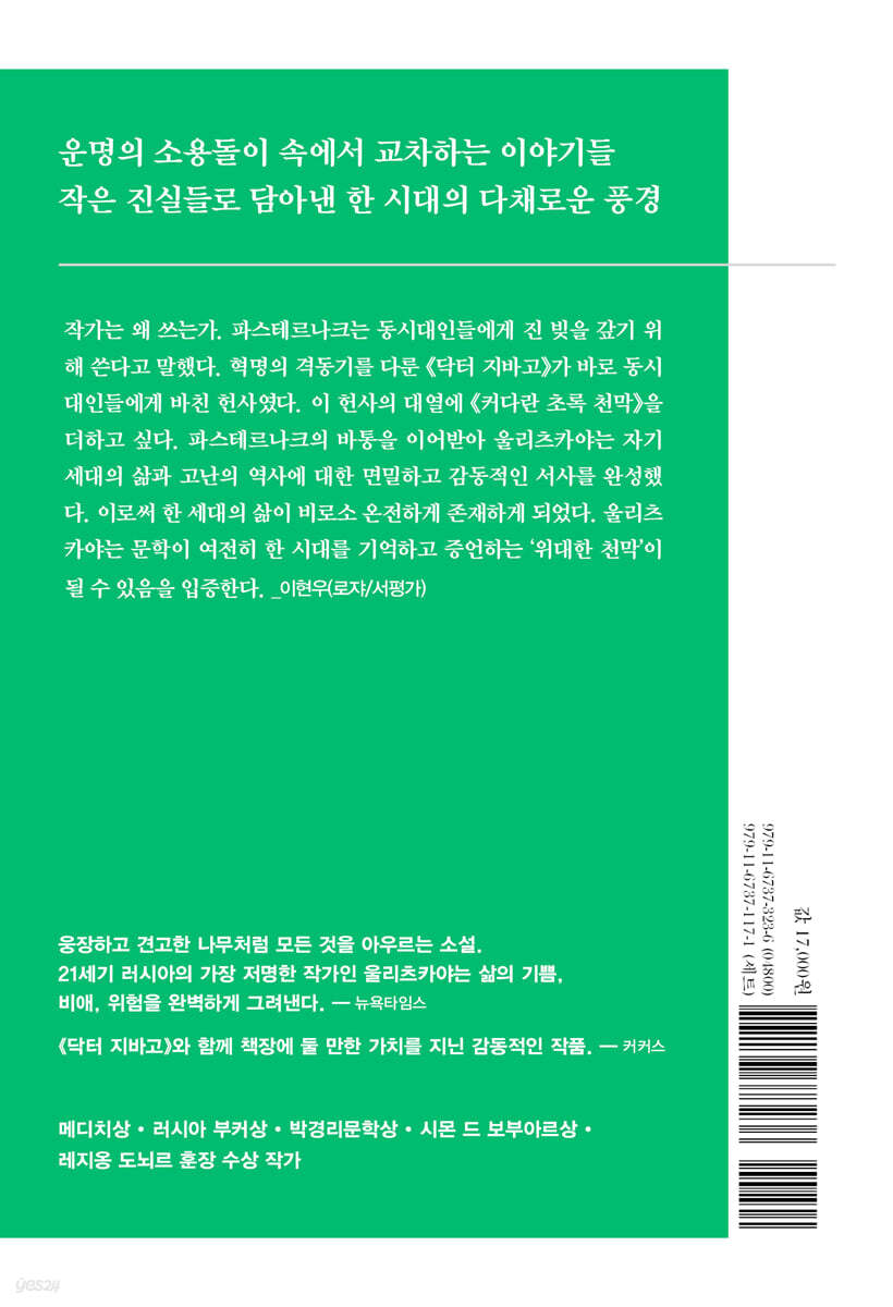 작가는 왜 쓰는가. 파스테르나크는 동시대인들에게 진 빚을 갚기 위해 쓴다고 말했다. 혁명의 격동기를 다룬 『닥터 지바고』가 바로 동시대인들에게 바친 헌사였다. 이 헌사의 대열에 『커다란 초록 천막』을 더하고 싶다. 파스테르나크의 바통을 이어받아 울리츠카야는 자기 세대의 삶과 고난의 역사에 대한 면밀하고 감동적인 서사를 완성했다. 이로써 한 세대의 삶이 비로소 온전하게 존재하게 되었다. 울리츠카야는 문학이 여전히 한 시대를 기억하고 증언하는 ‘위대한 천막’이 될 수 있음을 입증한다. - 이현우 (로쟈/서평가)