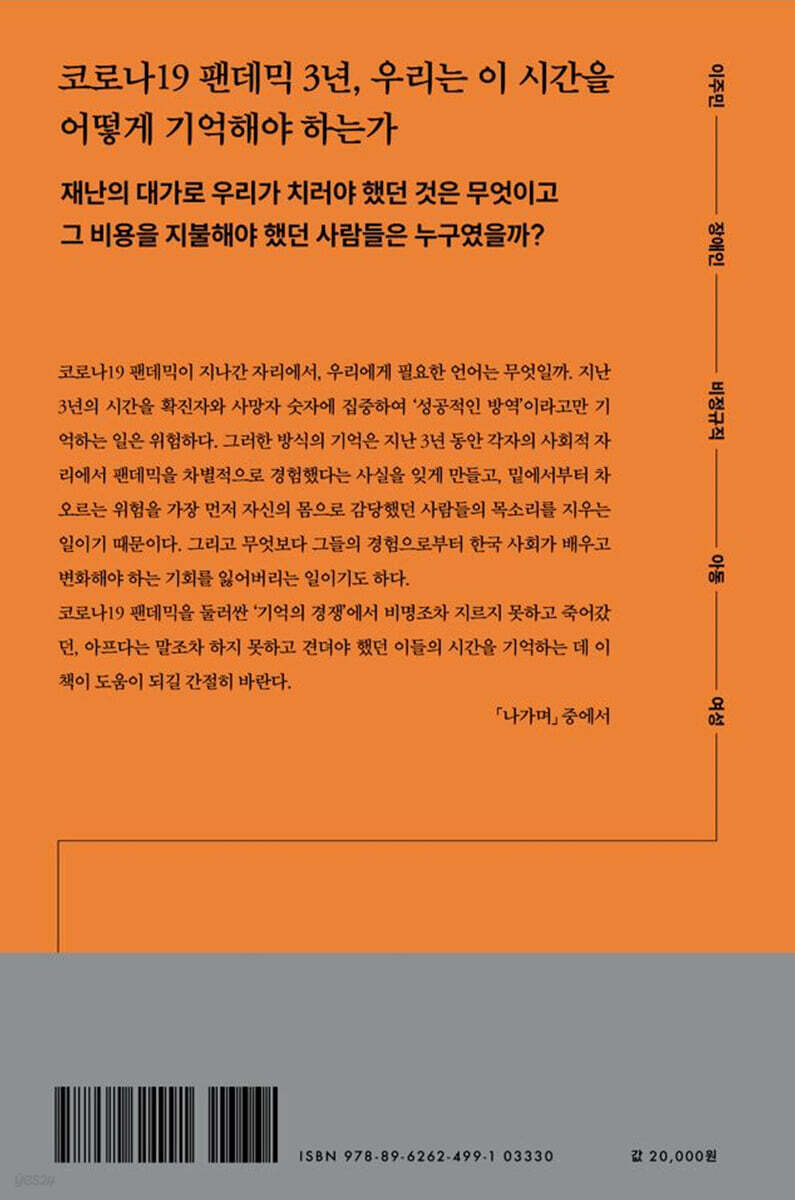 : 우리의 상처는 미래를 바꾸고 있는가 1장 감염보다 추방이 두려운 사람들 : 코로나19와 이주민 2장 스스로 살아남아야만 했다 : 코로나19와 장애인 3장 밀려난 사람들, 떠넘겨진 위험 : 코로나19와 노동 4장 보이지 않는 아이들의 박탈당한 시간 : 코로나19와 아동 5장 돌봄의 최전선에 선 사람들 : 코로나19와 여성 나가며 : 코로나19와 기억의 경쟁 주 |