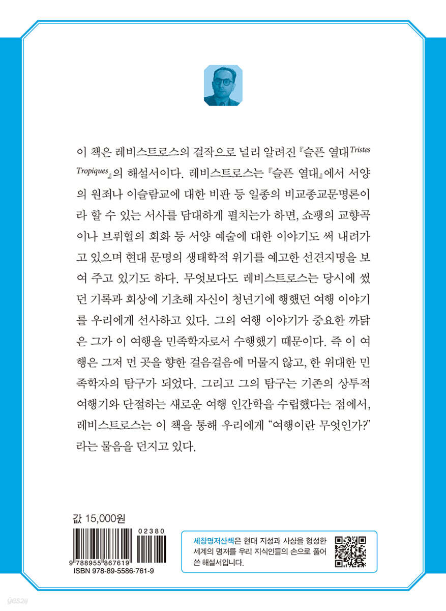 ---「1장 저자의 삶과 저술: 『슬픈 열대』의 배경과 개요」중에서 이 책이 출판되었을 때, 레비스트로스의 대작들은 아직 출간되지 않았을 무렵이었다. 『야생의 사고』를 비롯해, 그의 기념비적 저술인, 4권의 『신화지』 역시 세상에 모습을 드러내지 않은 시점이었다. 『슬픈 열대』에 선행하는 그의 저술 가운데 학술적 중요성을 갖는 책을 언급하자면, 『친족의 기본 구조들』만을 손꼽을 수 있을 정도이다. 바로 이 책의 이 같은 특수한 연대기적 위치로 인해 그 가치는 보다 돋보이기도 한다. ---「2장 『슬픈 열대』의 탄생과 주요 특징」중에서 근본적 진리들은 그 수에 있어 매우 한정되어 있다. 과학을 신성시하기를 원하는 서구의 교만에 의해 스스로가 도취하게끔 내버려 두어서는 안 될 것이다. 과학은, 그것의 정복과 성취가 무엇이건, 인간적 진리의 여정에서 결코 우리가 앞으로 나아가도록 만들어 주지 못한다. … 인간은 그가 우주에서 유일하지 않다는 점을 기억하고 있어야 할 것이다. 어떤 사회도 다양한 많은 사회가 존재한다는 점을 망각해서는 안 되는 것처럼 말이다. 개인 자신도 일정한 무리 속에 존재한다. ---「3장 저서 전체의 세부 주제 분석」중에서 다소 놀랍게도 『슬픈 열대』를 여는 첫 문장은 자신들의 여행 이야기를 쓰는 기쁨을 누리기 위해, 세계의 절반을 가로지르며 구석구석을 누비고 다니는 여행가들과 탐험가들에 대한 신랄한 비판으로 시작한다. 보다 구체적으로, 레비스트로스는 비사실적이며 멀리 동떨어진 자연의 총천연색 슬라이드를 무감각해진 대중들 앞에서 뽐내며 소개하고 희열을 느끼는 여행가들에 대한 힐난으로 포문을 연다. ---「4장 여행의 인간학: 인류학적 경험을 넘어 서구 문명 비판으로」중에서 『슬픈 열대』는 분명히 한 편의 여행기라는 범주에 속하나, 그것은 또한 민족지학적 현장 조사의 서사이며, 그가 선택한 특정 학문의 방법과 요령을 일러 주고 있다. ‘선량한 야만인’을 찾아 길을 떠난 레비스트로스는 다름 아닌, 자신의 연구 대상, 즉 원주민들과의 직접 접촉을 시도한 민족지학을 실천했던 것이다. ---「5장 현대 민족지학의 독보적 성취」중에서 레비스트로스는 이른바 미개발 사회라고 불리는 사회들을 서구 사회 발전의 외부에 놓여 있거나, 서구 사회와 무관한 것으로 파악하는 서구 중심적 판단과 우월주의를 노출하는 사고방식은 서구인들이 갖고 있는 크게 잘못된 시각임을 환기시킨다. 이들 사회는 16세기와 19세기 사이에 이루어진 그것들의 직간접적인 파괴를 감수하며, 즉 엄청난 희생을 치르며 서구 세계의 발전을 가능케 했다. ---「6장 현대 문명 비판과 생태학적 사유」중에서 |