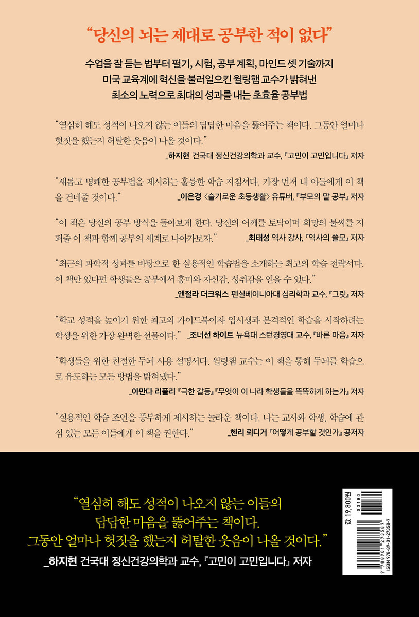 나 역시 책상에 앉아 오랜 시간 공부하지만, 늘 만족스럽지 않다. ‘내 머리의 한계가 여기까지인가. 어쩔 수 없구나’ 하고 체념할 때가 많다. 하지만 이 책을 읽고 내 머리가 문제가 아니라 공부 방식이 문제였다는 사실을 깨달았다. 이 책은 당신의 공부 방식을 돌아보게 한다. 왜 수업이 어렵게 느껴졌는지, 왜 시험에서 실수하고, 평소 집중이 어려웠는지 세심하게 답을 찾아준다. 당신의 어깨를 토닥이며 희망의 불씨를 지펴줄 이 책과 함께 공부의 세계로 나아가보자. - 최태성 (역사 강사, 『역사의 쓸모』 저자)