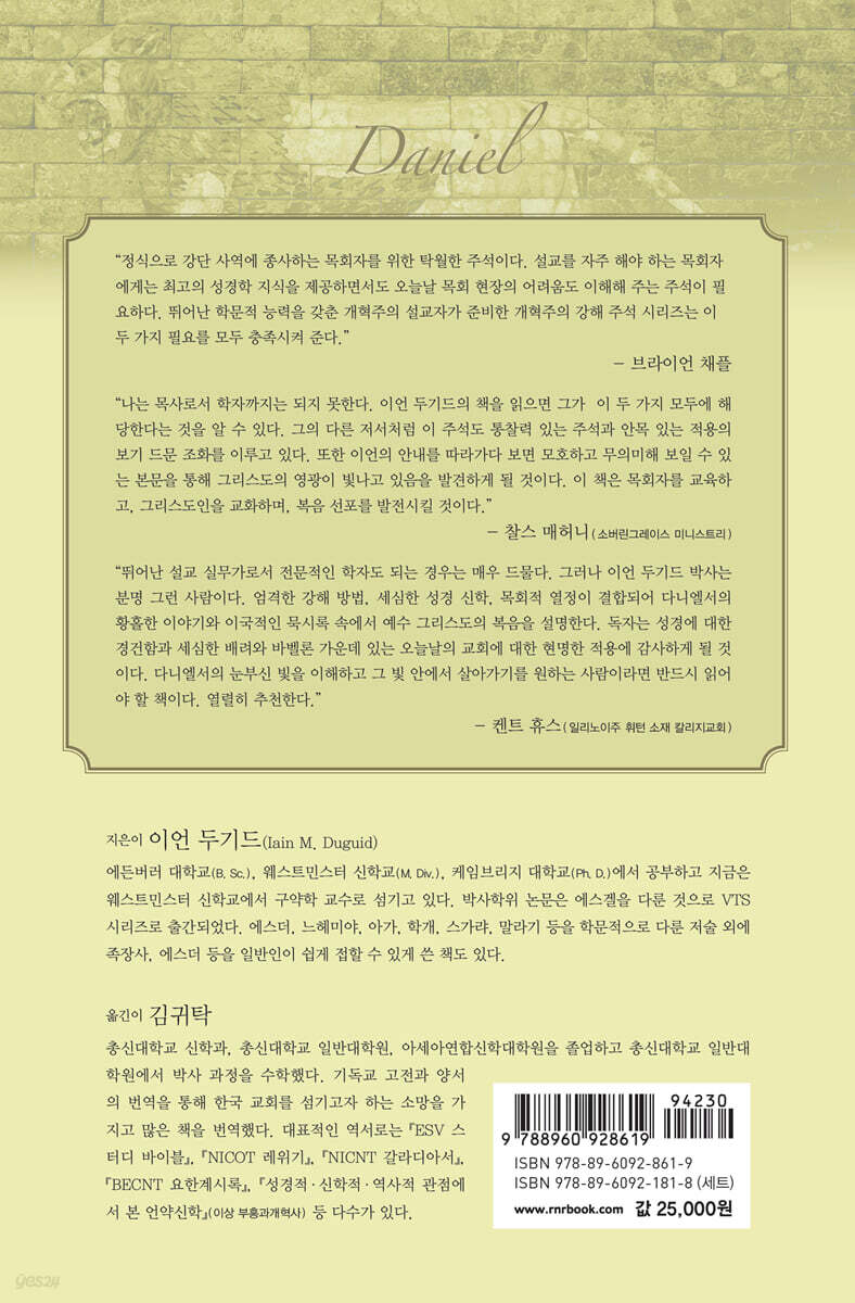 “뛰어난 설교 실무가로서 전문적인 학자도 되는 경우는 매우 드물다. 그러나 이언 두기드 박사는 분명 그런 사람이다. 엄격한 강해 방법, 세심한 성경 신학, 목회적 열정이 결합되어 다니엘서의 황홀한 이야기와 이국적인 묵시록 속에서 예수 그리스도의 복음을 설명한다. 독자는 성경에 대한 경건함과 세심한 배려와 바벨론 가운데 있는 오늘날의 교회에 대한 현명한 적용에 감사하게 될 것이다. 다니엘서의 눈부신 빛을 이해하고 그 빛 안에서 살아가기를 원하는 사람이라면 반드시 읽어야 할 책이다. 열렬히 추천한다.” - 켄트 휴스 (일리노이주 휘턴 소재 칼리지교회)