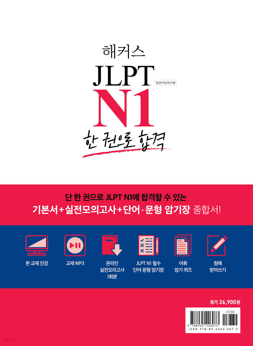 최신 기출경향(2023년 시험)을 완벽 반영한 JLPT N1 최적화 교재! [기본서+실전모의고사+단어/문형 암기장]으로 기본에서 실전까지 4주 완성! [이런 분들께 추천합니다] 1. JLPT N1 합격을 위한 모든 것이 담긴 교재로 단번에 합격하고 싶은 분들 2. 모든 문제에 대한 해석/해설/어휘정리를 담은 ‘완벽 분석 해설집’으로 빈틈 없이 학습하고 싶은 분들 3. 방대한 어휘와 문형을 특징별로 구분해 효율적으로 암기하고 싶은 분들 [해커스 교재만의 특장점] 1. JLPT N1 합격에 필요한 [기본서+실전모의고사+단어/문형 암기장]을 한 권에 담았습니다. 1) 문자어휘/문법/독해/청해까지, JLPT의 모든 과목을 한 권으로 대비할 수 있습니다. 2) 실제 시험과 동일한 ‘실전모의고사 4회분(교재 3회+온라인 1회)’를 통해 충분한 연습 및 시험 직전 최종 마무리가 가능합니다. 3) ‘JLPT N1 필수 단어/문형 암기장’을 통해 2,100개의 필수 단어와 254개의 문형을 완벽 정복할 수 있습니다. (PDF 파일도 함께 제공) 2. 확실한 일본어 듣기 실력 향상! 해커스만의 다양한 무료 교재 MP3를 제공합니다. 1) 학습용 MP3 ‘문자어휘 핵심 표현 및 필수 어휘 학습용’, ‘청해 문제풀이 학습용’, ‘실전모의고사용’으로 구성되어 편리한 학습이 가능합니다. 2) 문제별 복습용 MP3 원하는 청해 문제만 반복 학습이 가능하며, ‘해커스 MP3 플레이어’ 어플을 통해 원하는 배속으로 들을 수 있습니다. 3) 고사장 소음 버전 MP3 실제 시험장의 각종 소음이 들리는 MP3를 제공하여 어떤 상황에서도 집중해서 정답을 찾는 연습이 가능합니다. 4) 단어/문형 암기장 MP3 언제 어디서나 ‘필수 단어/문형 암기장’에 대한 MP3를 들으면서 효율적으로 암기할 수 있습니다. 3. 즉시 음원을 들을 수 있는 QR코드와 모바일 스트리밍 서비스로 언제 어디서든 편리하게 학습할 수 있습니다. 1) 문자어휘 과목의 ‘핵심 표현 및 필수 어휘’ 및 청해 문제 등 음성이 필요한 모든 부분에 QR코드를 수록하였습니다. 2) QR코드와 모바일 스트리밍으로 즉시 일본어 청해 연습 및 어휘/문형 암기가 가능하며, ‘해커스 MP3 플레이어’ 어플을 사용하면 1.0~2.0배까지 0.05배속 단위로 원하는 배속으로 들을 수 있습니다. 4. 일본어 문법에 대한 고민을 날려주는 [N1 필수 문법]을 수록하였습니다. 1) ‘조사, 부사, 접속사 리스트’와 ‘경어 표현’을 통해 해석에 꼭 필요한 기본 문법을 학습할 수 있습니다. 2) N1 수준의 필수 문형뿐만 아니라, N1에 출제되는 N2 수준 문형까지 접속형태별 모든 예문과 함께 수록하여 문법 과목에 완벽 대비할 수 있습니다. 5. 체계적이고 전략적인 학습구성으로 모든 문제 유형에 완벽 대비할 수 있습니다. 1) ‘핵심 전략’ 문제별 ‘핵심 전략’을 통해 최신 출제경향 파악 및 문제풀이 요령을 습득할 수 있습니다. 2) ‘문제풀이 Step’ 및 ‘문제풀이 Step 적용’ 실제 시험장에서 적용할 수 있는 구체적인 ‘문제풀이 Step’을 예문에 단계별로 적용해보며 모든 문제의 유형과 풀이 전략을 확실하게 파악할 수 있습니다. 3) ‘핵심 표현 및 필수 어휘’ 각 문제별 전략과 특징에 맞는 필수 단어와 표현을 정리하였으며, 기출 연도 표시를 통해 어휘의 중요도까지 확인 가능합니다. 4) ‘실력 다지기’ 본격적인 문제풀이에 앞서 연습 문제에 학습한 전략을 적용해볼 수 있습니다. 5) ‘실전 테스트’ 최신 출제경향 및 기출 유형이 반영된 실제 시험과 완전히 동일한 문제 구성을 통해 실전 감각을 극대화할 수 있습니다. 6. 모든 문제에 대한 해석/해설/어휘정리를 담은 [완벽 분석 해설집]으로 빈틈 없는 학습이 가능합니다. 1) 실제 시험장에서 바로 적용 가능한 문제풀이 해설을 알려주어 효과적인 학습이 가능합니다. 2) 모든 문제에 대한 체계적인 해석과 정답은 물론, 오답의 이유까지 확인할 수 있습니다. 3) 문제풀이에 필요한 어휘를 상세하게 정리하여 사전 없이도 간편하게 학습할 수 있습니다. [JLPT 합격을 위한 해커스만의 추가 혜택 - 해커스일본어(japan.Hackers.com)] 1. 본 교재 인강 (교재 내 할인쿠폰 수록) 2. 교재 MP3 ① 학습용 MP3: 문자어휘 핵심 표현 및 필수 어휘 학습용/청해 문제풀이 학습용/실전모의고사용 ② 문제별 복습용 MP3: 청해 복습용/실전모의고사 복습용 ③ 고사장 소음 버전 MP3: 실전모의고사 시험장 적응용 ④ 단어/문형 암기장 MP3: 별책부록 학습용 3. JLPT N1 필수 단어/문형 암기장 (PDF) 4. 어휘 암기 퀴즈 (PDF) 5. 청해 받아쓰기 (PDF+MP3) 6. 온라인 실전모의고사 1회분 (PDF+MP3) |