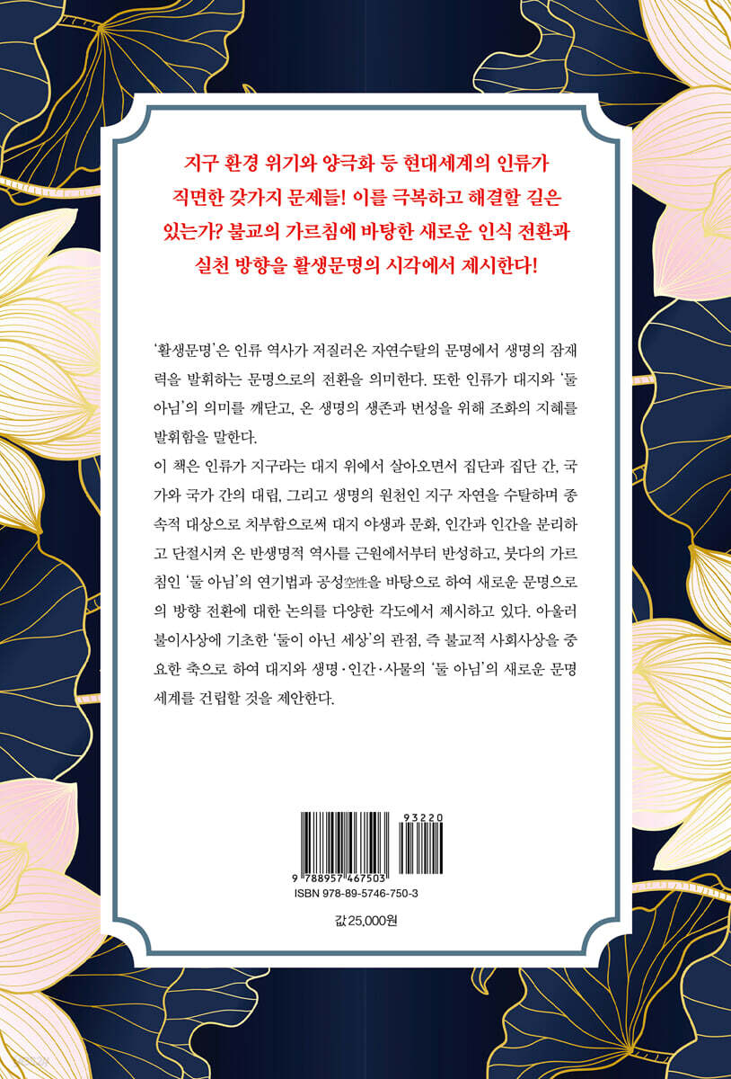 이 책은 인류가 지구라는 대지 위에서 살아오면서 집단과 집단 간, 국가와 국가 간의 대립, 그리고 생명의 원천인 지구 자연을 수탈하며 종속적 대상으로 치부함으로써 대지 야생과 문화, 인간과 인간을 분리하고 단절시켜온 반생명적 역사를 근원에서부터 반성하고, 붓다의 가르침인 ‘둘 아님’의 연기법과 공성(空性)을 바탕으로 하여 새로운 문명으로의 방향 전환에 대한 논의를 다양한 각도에서 제시하고 있다. 아울러 불이사상에 기초한 ‘둘이 아닌 세상’의 관점, 즉 불교적 사회사상을 중요한 축으로 하여 대지와 생명·인간·사물의 ‘둘 아님’의 새로운 문명세계를 건립할 것을 제안한다. 제목으로 쓰인 ‘활생문명’이란 인류 역사가 저질러온 자연수탈의 문명에서 생명의 잠재력을 발휘하는 문명으로의 전환을 의미한다. 또한 인류가 대지와의 ‘둘 아님’의 의미를 깨닫고, 온 생명의 생존과 번성을 위해 조화의 지혜를 발휘함을 말한다. 그래서 활생문명은 방생, 야생의 회복, 자연에의 귀의를 넘어, 인간의 적극적 생명 살리기로 기운 생동하는 평화의 지구문명을 지향함을 목표로 한다. 2. 이 책은 모두 총 3부와 종장으로 구성되어 있는데, 그 개요는 다음과 같다. 제1부는 문제의식과 탐구의 여정 부분으로, 먼저 도입부에서는 젊은 세대를 대상으로 학생운동부터 시민운동과 공적 활동을 거쳐 종교적 사회참여에 이르기까지 관련된 실제적 탐구와 모색의 과정을 소개하였다. 여기에 적시된 문제와 문제의식은 현대사회에서도 여전히 논의되고 있는 중요 사항으로 세대를 불문하고 관심과 흥미를 가질 수 있는 것들이다. 1부 2·3장은 대과도기에 사는 현대인의 나침반으로서 불교와 그 현대적 조명에 관한 견해를 밝히고 있다. 과거의 패러다임과 성공모델이 크게 흔들리고 현재의 지구 붕괴 위기 및 현대 문명의 혼미 상황에서 불교의 현대화에 미래를 향한 한줄기 희망의 빛을 발견할 수 있다고 말한다. 아울러 불교에 잠재된 역량과 인류의 능력을 연결시킨다면 현대적 위기상황에서 큰 힘을 발휘할 수 있으리라고 기대한다. 제2부는 역사와 문명에 대해 근원적으로 성찰하는 부분으로, 역사적 현실, 현대 문명의 표층적 사태와 그 저변의 기조를 만들어온 사상적 심층을 연결시키면서 성찰하고 있다. 여기에는 특히 서양의 물질 중심적 사상에 대한 통렬한 비판과 반성이 포함된다. 제3부와 종장은 이 책의 핵심에 해당되는 부분이라 할 수 있다. 먼저 제3부 ‘생각하는 사람들과 지구촌 시민에게 드리는 제언’에서는, 인류 역사는 출발에서부터 생성·선순환 프로세스와 생산편향 시스템의 원초적 부조화와 모순이 있었다고 진단한다. 원래 생성·선순환 프로세스는 대지와 생명의 순리에 따른 잠재력 발현, 즉 서로를 살려 나가는 지속과 활생의 과정이었다. 반면 생산편향 시스템의 동력은 처음부터 지구 자연의 대상화와 포획을 기반으로 한 물질력과 권력의 생산전략이었다. 이러한 재생산과 증식의 최대화의 귀결은 대지와 생태계의 생명 다양성 고갈과 황폐화였다. 그리고 지금 그 극대화의 지점에서 생산 편집증적 시스템과 그를 기반으로 한 문명의 지배력이 대지를 압도하며 세계의 위기를 초래하고 있다는 것이다. 따라서 우리는 연기적 원리와 사실적 근거를 토대로 이 난관을 돌파하기 위해 ‘자유의 고도화를 통해 둘 아님 너머로 진일보’하는 길을 모색해야 한다고 말한다. 그리고 이에 대해 시안을 제시하고 사회 제현들의 검토를 바란다고 제언한다. 제3부 3·4장 및 종장에 걸쳐 제안의 이유, 내용, 기대효과 그리고 추진전략 등 관련 사항을 가능한 한 구체적으로 설명하고자 하였다. 여기에는 대지활생 지향의 소수 되기 윤리, 생산편향 시스템에서 생성·선순환으로의 전환, 생태·인문운동과 사회·문화운동의 연결 등이 포함된다. 그리하여 결국 대지와 생명·인간·사물의 ‘둘 아님’의 세계인 활생의 문명시대를 열어가야 할 것이라고 강조한다. 그리고 이를 위해서는 무엇보다 ‘내부로부터의 변화’, ‘마음의 변화’가 중요하다고 말한다. 3. 이처럼 이 책은 현대세계의 인류가 직면한 여러 문제들을 문명사적으로 살피면서 문제가 어디에 있는가를 진단하고, 모든 것은 모든 것과 연결되어 있되, 누구도 주체가 없다는 불교의 연기법과 공성에 주목하여 자연과 인간, 인간과 인간이 서로 화쟁하고 협력하는 새로운 미래의 비전을 제시하고 있다. 따라서 이 책은 인간이 바르게 사는 길과 인류가 나아가야 할 올바른 방향에 관심을 가진 이들에게 많은 시사점을 줄 것이다. |