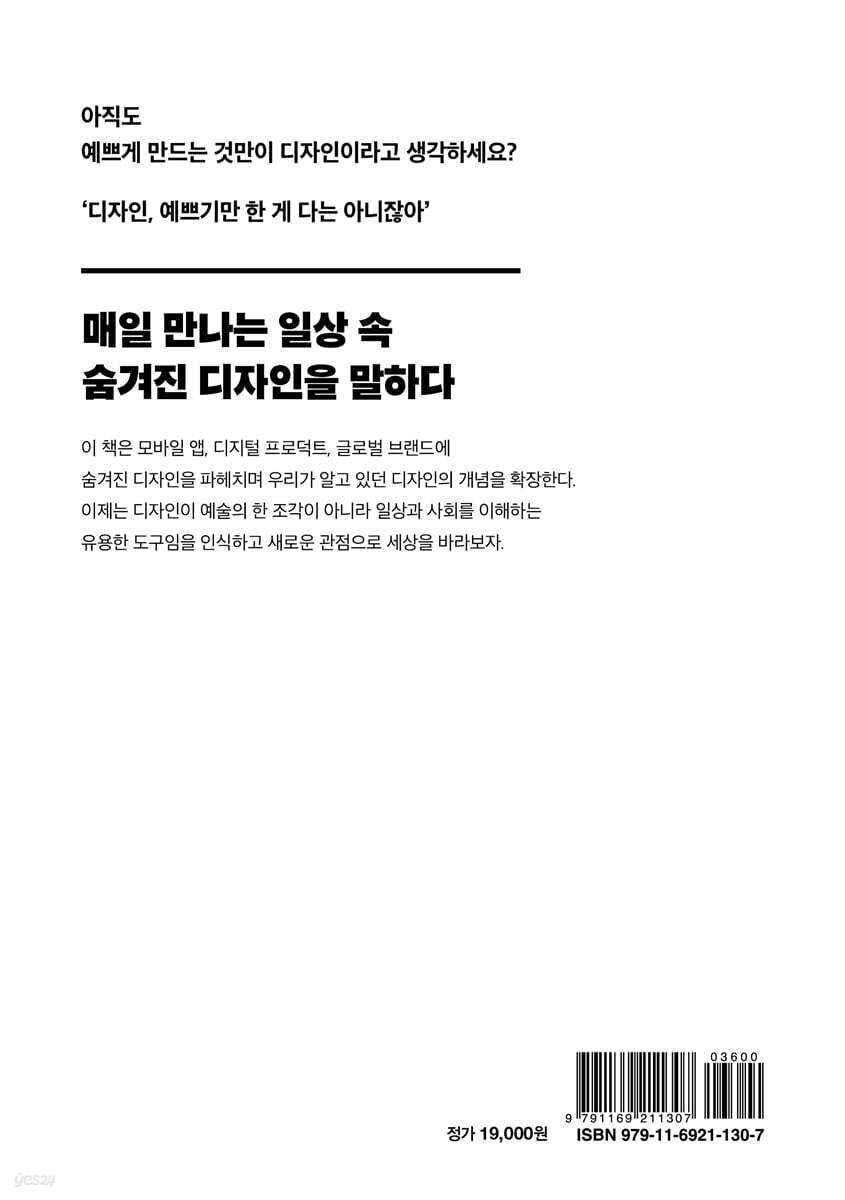 우리는 온종일 끊임없이 경험한다. 카페를 방문하고 물건을 구매하며 사람들을 만나고 일을 하면서 하루하루를 경험으로 가득 채운다. 그리고 이러한 일상을 더 나은 경험으로 채우고 싶어 한다. 디자인은 더 나은 경험을 만들고 싶은 모든 이에게 유용하고 중요한 수단이 되었다. 따라서 이제는 디자인을 장식품이 아니라 나와 상호작용하는 모든 것을 변화시킬 수 있는 강력한 수단으로 인식해야 한다. 이 책은 디자인을 돋보기 삼아 일상을 통찰하도록 돕는다. 이 책을 통해 디자인이라는 도구로 무엇을 변화시킬지 고찰하고 더 나아가 변화를 만들어내기를 희망한다. - 전지윤 (강남언니 프로덕트 오너)