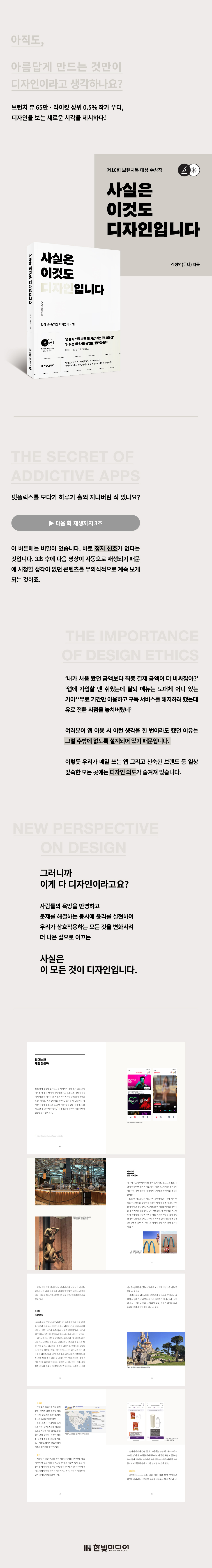 브런치 뷰 65만 · 라이킷 상위 0.5% 작가 우디, 매일 만나는 일상 속 숨겨진 디자인의 비밀을 파헤치다! 『사실은 이것도 디자인입니다』는 현시대를 반영하는 디자인 교양서다. 구독자 5천여 명을 사로잡고 제10회 브런치북 출판 프로젝트 대상을 거머쥔 〈새로운 시대의 디자인〉을 몰입력 높은 일상 속 사례와 저자의 인사이트로 재구성했다. 토스, 오늘의집, 쿠팡 등 매일 쓰는 앱 이면에 녹아 있는 디자인 원칙부터 빠르게 변화하는 브랜딩 트렌드 그리고 실무적인 개념까지 함께 다루어 서비스 기획자, 프로덕트 메이커, 나아가 사용자 관점에서 새로운 경험을 설계하는 사람이라면 누구나 도움을 받을 수 있다. ‘아직도 예쁘게 만드는 것만이 디자인이라고 생각하는가’ 디자인, 예쁘기만 한 게 다는 아니다! 디자인을 ‘장식’으로 보는 시대는 끝났다. 오늘날 디자인은 단순히 사물을 장식하거나 아름다움을 표현하는 수단에 그치지 않는다. 디자인은 비즈니스 문제를 해결하는 핵심 열쇠이자 일상 속 더 나은 경험을 만드는 유용한 도구다. 또한 디자인은 시대와 환경 그리고 사람들의 욕망을 반영하고 윤리를 실현하는 수단으로서 그 의미가 커지고 있다. 장식적인 의미의 디자인과 관련이 없어 보이는 이 책은 현재 가장 트렌디한 디자인 사고방식을 담고 있다. 소셜 프루프, 핍진성, 다크 넛지, 프리토타입, 디자인 윤리 등을 통해 새로운 시대상을 반영하는 디자인 사례를 다룬다. 디자이너가 아니더라도 디자인 사고의 메커니즘을 알아 둔다면 여러분이 일하는 모든 영역에서 디자인을 삶의 무기로 삼을 수 있을 것이다. 이 책을 통해 디자인을 단순히 보고 느끼는 것으로 생각하지 않고 우리가 상호작용하는 모든 것을 변화시킬 수 있는 강력한 수단으로 인식하기를 바란다. |