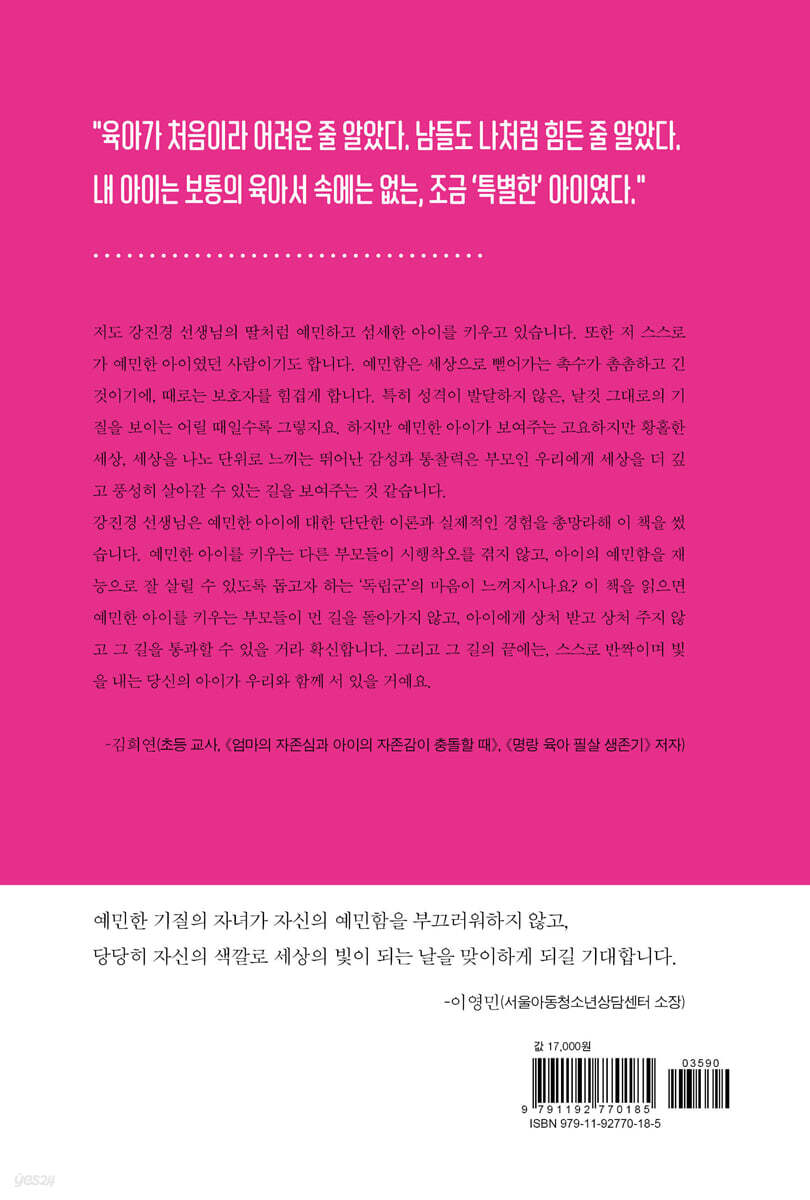 강진경 선생님은 예민한 아이에 대한 단단한 이론과 실제적인 경험을 총망라해 이 책을 썼습니다. 예민한 아이를 키우는 다른 부모들이 시행착오를 겪지 않고, 아이의 예민함을 재능으로 잘 살릴 수 있도록 돕고자 하는 ‘독립군’의 마음이 느껴지시나요? 이 책을 읽으면 예민한 아이를 키우는 부모들이 먼 길을 돌아가지 않고, 아이에게 상처 받고 상처 주지 않고 그 길을 통과할 수 있을 거라 확신합니다. 그리고 그 길의 끝에는, 스스로 반짝이며 빛을 내는 당신의 아이가 우리와 함께 서 있을 거예요. - 김희연 (초등 교사, 『엄마의 자존심과 아이의 자존감이 충돌할 때』, 『명랑 육아 필살 생존기』 저자) |