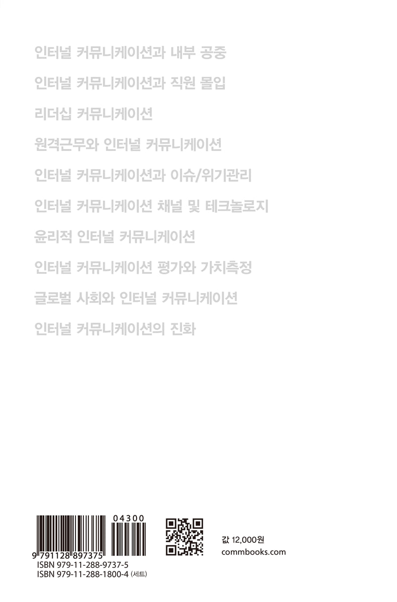 01 인터널 커뮤니케이션과 내부 공중 02 인터널 커뮤니케이션과 직원 몰입 03 리더십 커뮤니케이션 04 원격근무시대와 인터널 커뮤니케이션 05 인터널 커뮤니케이션과 이슈/위기관리 06 인터널 커뮤니케이션 채널 및 테크놀로지 07 윤리적 인터널 커뮤니케이션 08 인터널 커뮤니케이션 평가와 가치측정 09 글로벌 사회와 인터널 커뮤니케이션 10 인터널 커뮤니케이션의 진화 |