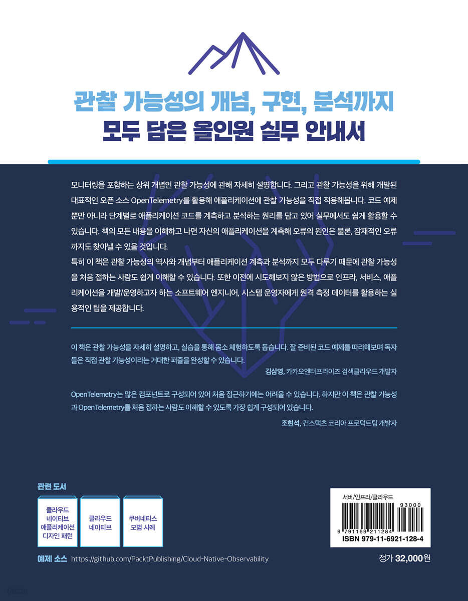 이 책은 관찰 가능성을 자세히 설명하고, 실습을 통해 몸소 체험하도록 돕습니다. 잘 준비된 코드 예제를 따라해보며 독자들은 직접 관찰 가능성이라는 거대한 퍼즐을 완성할 수 있습니다. - 김삼영 (카카오엔터프라이즈 검색클라우드 개발자)