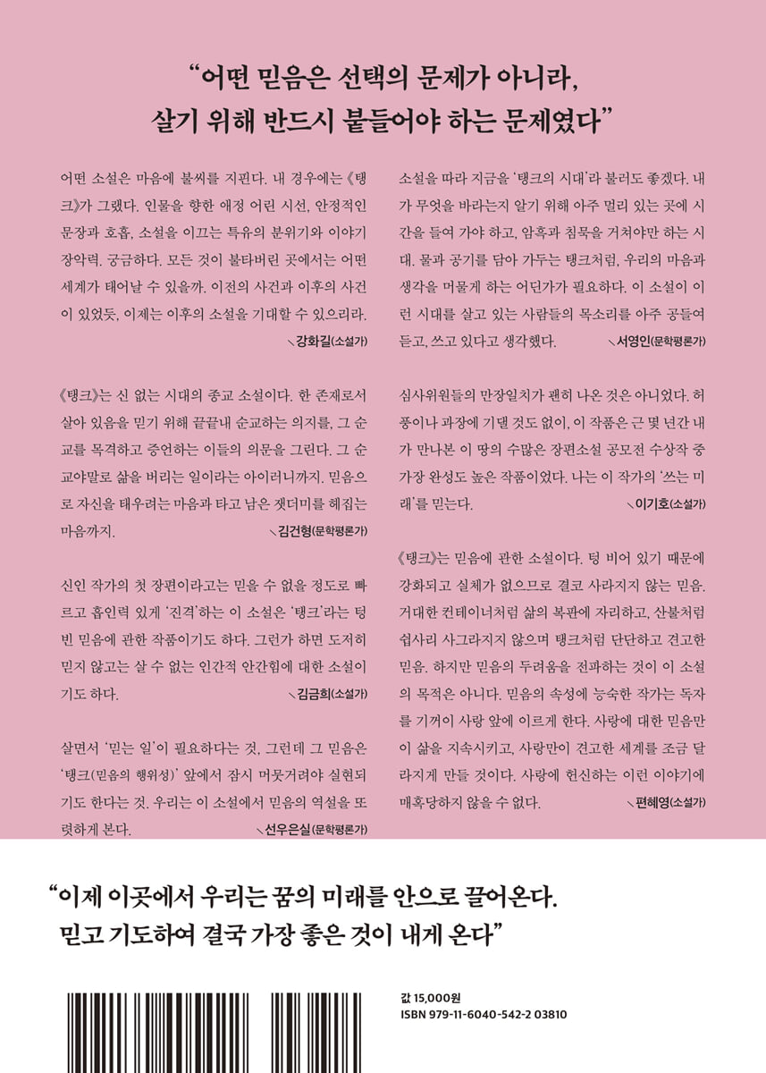 『탱크』는 믿음에 관한 소설이다. 텅 비어 있기 때문에 강화되고 실체가 없으므로 결코 사라지지 않는 믿음. 거대한 컨테이너처럼 삶의 복판에 자리하고, 산불처럼 쉽사리 사그라지지 않으며 탱크처럼 단단하고 견고한 믿음. 하지만 믿음의 두려움을 전파하는 것이 이 소설의 목적은 아니다. 믿음의 속성에 능숙한 작가는 독자를 기꺼이 사랑 앞에 이르게 한다. 사랑에 대한 믿음만이 삶을 지속시키고, 사랑만이 견고한 세계를 조금 달라지게 만들 것이다. 사랑에 헌신하는 이런 이야기에 매혹당하지 않을 수 없다. - 편혜영 (소설가)