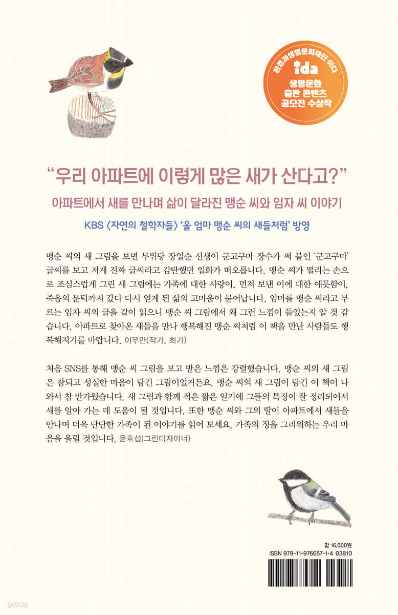 맹순 씨의 새 그림을 보면 무위당 장일순 선생이 군고구마 장수가 써 붙인 ‘군고구마’ 글씨를 보고 저게 진짜 글씨라고 감탄했던 일화가 떠오릅니다. 맹순 씨가 떨리는 손으로 조심스럽게 그린 새 그림에는 가족에 대한 사랑이, 먼저 보낸 이에 대한 애틋함이, 죽음의 문턱까지 갔다 다시 얻게 된 삶의 고마움이 묻어납니다. 엄마를 맹순 씨라고 부르는 임자 씨의 글을 같이 읽으니 맹순 씨 그림에서 왜 그런 느낌이 들었는지 알 것 같습니다. 아파트로 찾아온 새들을 만나 행복해진 맹순 씨처럼 이 책을 만난 사람들도 행복해지기를 바랍니다. - 이우만 (작가, 화가)
