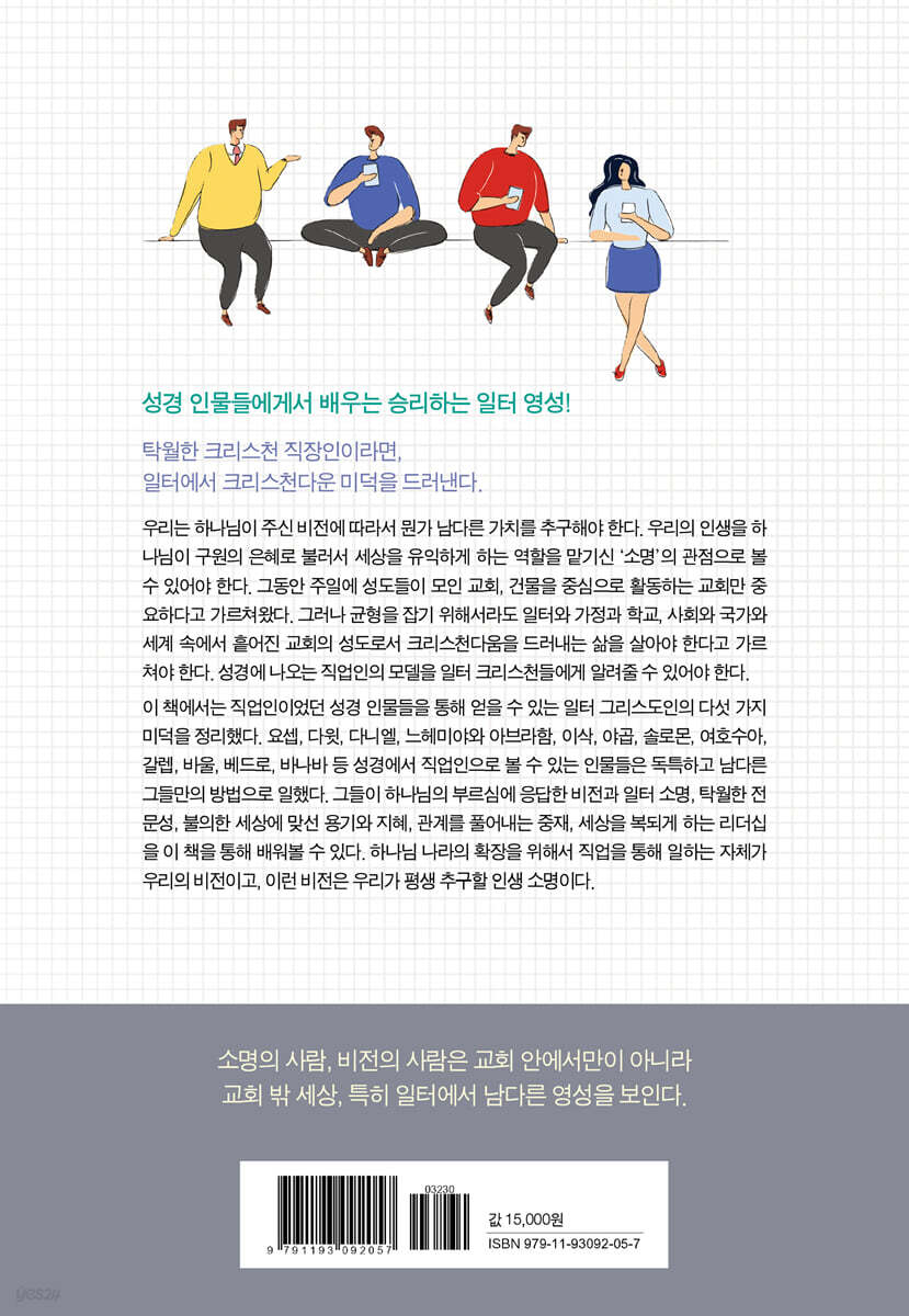 Part 1. 일터에서 부르심에 응답하는 소명자 1. 앞이 캄캄해도 꿈꾸는 소명자가 되기 위하여 2. 크리스천의 남다른 정체성으로 무장하고 3. 소명 실천으로 완성하는 우리 시대 종교개혁 Part 2. 탁월하고 균형 잡힌 전문가 1. 땀 흘리며 당신의 물맷돌을 준비하고 2. 땀과 짬의 균형을 이루는 참된 안식 3. 성령 충만한 전문가가 되기 위하여 Part 3. 깡과 꾀로 무장한 투사 1. 악한 세상과 맞설 크리스천 깡이 필요하다 2. 의무는 다하지만 권리를 포기하는 전략적인 꾀 3. 문화와 윤리적 갈등 속에서 대안의 지혜를 발휘하며 Part 4. 관계를 풀어내고 공동체를 세우는 중재자 1. 얽히고설킨 관계의 매듭을 사랑으로 풀어내고 2. 분노사회를 치유할 가장 강력한 미덕, 용서! 3. 일터를 세우는 공동체 의식의 유산을 남기며 Part 5. 세상을 복되게 하는 리더 1. 크리스천 리더의 남다른 품격을 뽐내고 2. 목표인가, 사람인가? 목-사 공감! 3. 창고를 준비하여 세상을 복되게 하는 리더십 |