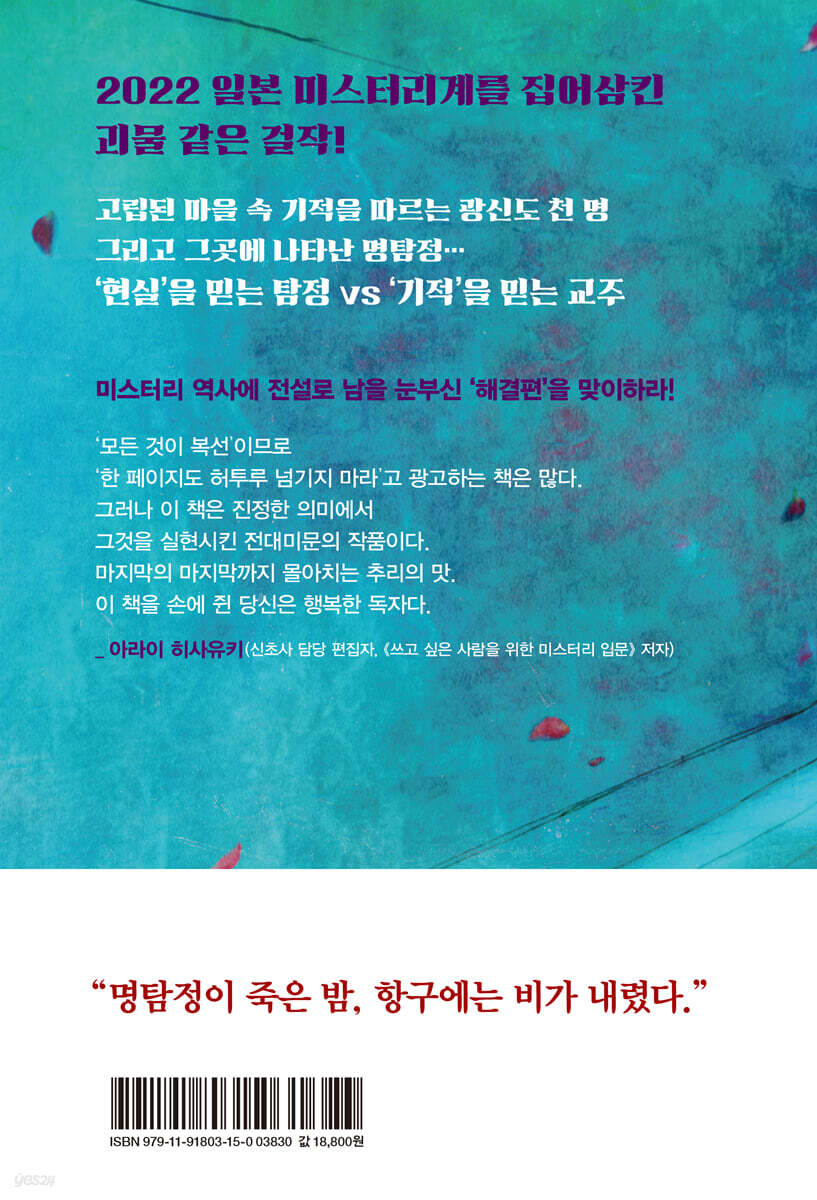 ‘모든 것이 복선’이니 ‘한 페이지도 허투루 넘기지 마라’고 광고하는 책은 많다. 그러나 이 책은 진정한 의미에서 그것을 실현시킨 전대미문의 작품이다. 마지막의 마지막까지 몰아치는 추리의 맛. 이 책을 손에 쥔 당신은 행복한 독자다. - 아라이 히사유키 (신초사 담당 편집자, 『쓰고 싶은 사람을 위한 미스터리 입문』 저자)