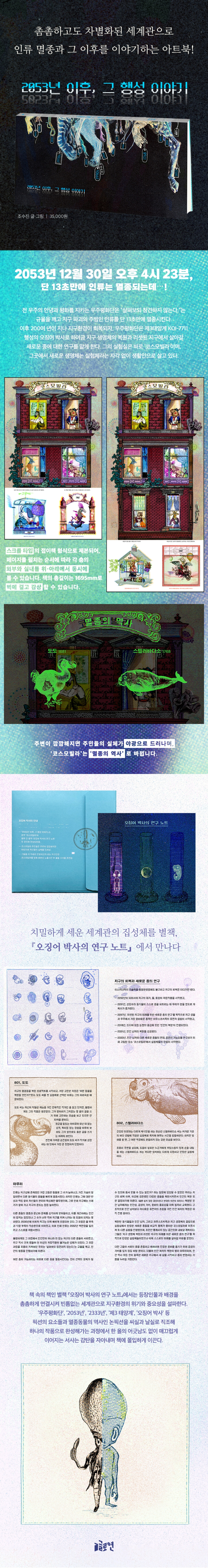 작가의 기발한 상상력은 지구를 오직 자신들만의 터전이라 여기며 다른 생명체들에게 이기적이고 야만적인 행태를 보여 온 인류를 단 13초만에 멸종시켜 지구상에서 사라지게 만든다. 신체적 고통은 물론 스스로의 죽음도 인지하기 전에 지구에서 멸종된 인간이라니! 드넓은 우주를 품에 안고 경계없이 상상의 나래를 펴며 시각적으로도 온전하게 그 이미지를 구현해내는 조수진 작가의 창작 세계와 지구환경에 대한 메시지가 이 책을 통해 재미있게 발화됐다. 코스모빌라 외관과 내부를 동시에 볼 수 있는 스크롤 타입의 접이책 형식과 야광으로 나타나는 멸종동물 책은 글과 이미지만이 아니라, 물성을 통해서 내용을 확장하고 심화시키도 하는데, 『2053년 이후, 그 행성 이야기』는 그 부분을 잘 살펴볼 수 있는 좋은 예이다. 표지를 펼치면 ‘코스모빌라’ 팻말과 함께 8층의 외관이, 바로 아래에는 8층의 실내 모습이 동시에 보인다. 페이지를 아래로 한 번 더 펼치면 7층의 외관과 7층의 실내가 함께 보이며, 이런 순서로 1층까지 이어진다. 전체를 다 펼치면 1965mm 길이로 8층의 코스모빌라가 드러나는 구조의 이 책은 벽걸이로 어둠 속에 있을 때 작가의 완전한 의도가 드러난다. 빛 속에서 컬러 이미지로는 코스모빌라에 살고 있는 새로운 종의 모습을 보여주지만, 불을 끄면 ‘코스모빌라’ 팻말이 ‘멸종의 역사’로 바뀌며 이 세상에 존재했지만 멸종된 동물, 그리고 인간을 포함한 멸종 위기의 동물들이 야광의 모습으로 나타나기 때문이다. 이는 과거에 존재했지만 현재는 볼 수 없다는 멸종동물의 의미를 시각적으로 완벽하게 전달하는 장치로, 작가가 말하고자 한 멸종의 역사와 위기를 한눈에 보여준다. 별책, ‘오징어 박사의 연구 노트’는 이 책 전체를 이해하는 핵심 열쇠로 역할 본책에서 특별한 형식으로 멸종의 위기에 대한 경각심을 보여주었다면, 책 속의 책인 별책 ‘오징어 박사의 연구 노트’에서는 등장인물과 배경을 촘촘하게 연결시켜 빈틈없는 세계관으로 지구환경의 위기와 중요성을 설파한다. #우주평화단, #2053년, $2333년, #제3태양계, #오징어박사 등 픽션의 요소들과 멸종동물의 역사인 논픽션을 씨실과 날실로 직조해 하나의 작품으로 완성해가는 과정에서 한 올의 어긋남도 없이 매끄럽게 이어지는 서사는 감탄을 자아내며 책에 몰입하게 만든다. 인물의 성격 형성 부분으로 그 예를 들면 코스모빌라에서 소개되는 402호의 멜로미스 씨는 골디락스 영역의 우주보안관으로 해마다 온도가 오르는 것에 대해 걱정한다. 이를 관찰하는 오징어 박사는 그의 연구 노트에서 멜로미스 씨가 우주보안관이 될 수 있었던 것은 기온과 날씨를 포함한 모든 변화를 누구보다도 빠르게 알아챌 수 있기 때문이라고 말하며, 지구를 지키기 위해 애쓰는 자신의 모습을 멜로미스 씨에게 투영해 동질감을 느낀다. 실제 브램블케이멜로미스는 2016년에 멸종되었는데, 그 원인은 이상기후로 인한 해수 온도 상승으로 서식지가 없어져 떼죽음을 당했기 때문이다. 이와 같은 멸종동물에 대한 자세한 설명은 ‘오징어 박사의 연구 노트’ 참고자료 부분에 실려 있다. 인물 하나에 대한 연결고리가 이러하다면, 책 전반에 대한 연결고리가 담긴 세계관은 이 책의 중심인물인 오징어 박사를 통해 살펴볼 수 있는데, ‘오징어 박사의 연구 노트’ 마지막 페이지가 특히 인상적이다. 이 내용은 ‘지구 생명체 복원과 리셋된 지구의 미래를 위한 새로운 종의 연구’를 목적으로 탄생된 실험체들에 대한 이해를 돕고자 지구의 언어로 기록되었으며, 특히 인간을 학습시키기에 가장 효율적인 매체였던 ‘책’의 형태로 만들어질 것이다. 매혹적인 이미지로 구현된 새로운 생명체, 판타지에 구체성을 더하다 작가는 자신의 상상력을 내용 구성만이 아니라, 시각 언어를 통해서도 완벽하고도 매력적으로 표현하고 있다. 초점이 흐려 몽환적으로 보이면서도 빈티지의 친근함을 풍기는 이 책의 이미지는 15~ 18세기 드로잉에서 고판화 느낌의 선을 추출하는 것으로 시작해 드로잉과 페인팅, 디지털드로잉 등으로 일차적인 이미지를 만들어 리소그라피로 출력한 다음, 이들을 다시 디지털에서 편집하는 기법을 이용했다. 과거와 현재를 넘나드는 미술 표현을 통해 경험해보지 않은 기묘한 세계를 자신만의 작품 세계로 자연스럽고 아름답게 끌어내어 하나의 미래 종족을 탄생시킨 작가에게 진정한 크리에이터라는 이름을 붙여주고 싶다. 작가의 말 이야기의 시작은 사람들에 대한 관심이었습니다. 다양한 사람들을 바라보며 관찰하던 중 “저 사람은 어떤 집에서 살까?”, “그 집은 문이 어떻게 생겼을까?”라는 궁금증에 구체적인 상상을 더해 보았습니다. 처음에는 문패의 형상을 떠올리며 그 집에 살 것만 같은 인물을 함께 그렸지요. 문패의 모습에 따라 그곳에 사는 이들의 성격도 규정하면서요. 이러한 과정이 이 책의 기초 작업이었던 것 같아요.? 이를 발판으로 이미지와 이야기를 확장시키며 인물 간의 유기적인 관계를 만들어 나가던 중 자연스럽게 동물과 인간의 모습이 혼재된 형상들이 나오게 되었고, 그 과정에서 다른