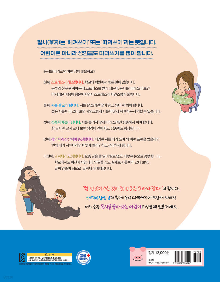 ★ 글쓰기 향상: 또박또박 읽고 따라 쓰면 글쓰기가 쉬워져요. ★ 집중력 강화: 눈으로만 읽고 대충 쓰는 습관을 바로잡을 수 있어요. ★ 창의력 증진: 이야기 속 장면들을 상상하면서 따라 쓰면 창의력이 쑥쑥 자라요. ★ 글씨체 교정: 바른 자세로 손에 힘을 주고 따라 쓰면 글씨를 예쁘게 쓸 수 있어요. 동시 읽기와 글쓰기를 싫어하는 아이들과 자녀의 문해력 성장을 바라시는 부모님들에게 초등 교사 해피이선생님이 쓴 『문해력이 성장하는 참 쉬운 따라 쓰기 - 동시 편』을 강력히 추천합니다. 동시 읽기와 글쓰기를 한 번에! 우리 아이들이 부모님께 자주 듣는 말은 무엇일까요? 아마도 “책 좀 읽어!”가 아닐까 싶습니다. 또한 우리 아이들이 숙제를 하거나 문제집을 풀 때 부모님들은 “글씨 좀 예쁘게 써라!” 하고 말씀하시곤 합니다. 요즘 아이들은 글씨를 써 볼 일이 별로 없기 때문에 글씨를 예쁘게 쓰고 싶어도 쉽지 않습니다. 책 읽기와 글쓰기는 자녀들의 학습과정에 꼭 필요합니다. 이뿐만 아니라 아이들의 상상력과 창의력을 길러줄 수 있는 동시 읽기는 문학 작품 읽기와 병행되어야 합니다. 동시의 중요성을 알지만, 평소 동화책이나 학습 만화 읽기에만 집중하기 때문에 동시를 즐겨 읽는 아이들이 많지 않습니다. 하지만 동시 읽기는 꼭 필요합니다. 가장 큰 장점은 아이들의 창의력과 상상력이 증진됩니다. 시인은 왜 이런 표현을 사용했는지, 만약 나라면 어떻게 쓸지를 생각하다 보면 자연스럽게 창의력과 상상력이 풍부해집니다. 그리고 관찰력이 좋아집니다. 시는 우리 주변의 일상에서 나옵니다. 남들은 평범하게 보고 넘기는 것들을 시인은 색다른 관점에서 유심히 바라보게 됩니다. 그래서 동시를 읽으면 관찰력이 증진됩니다. 마지막으로 시를 읽으면 아이들의 정서 발달에 도움을 줄 수 있습니다. 바른 공부 습관에 도움이 되는 따라쓰기!! 국어책에는 문학 작품만 수록되어 있는 것이 아닙니다. 문학 작품과 더불어 아이들에게 유익한 동시도 수록되어 있습니다. 이 모든 것들을 고루고루 접하고 공부해야 아이들의 국어 실력이 향상됩니다. 국어 실력이 부족하면 수학과 영어, 과학 등 다른 과목에서도 그 내용을 이해하는 데 어려움을 겪을 수 있습니다. 게다가 서술형 문제의 출제 비중이 점점 늘어나는 요즘 서술형 문제를 제대로 풀지 못할 수도 있습니다. 이러한 문제를 문학 작품과 동시를 읽고, 따라 쓰기를 반복하는 과정을 통해 해결할 수 있습니다. 『문해력이 성장하는 참 쉬운 따라 쓰기 - 동시 편』을 통해 아이가 자기주도적으로 언어 능력을 키울 수 있도록 해 주시길 바랍니다. |