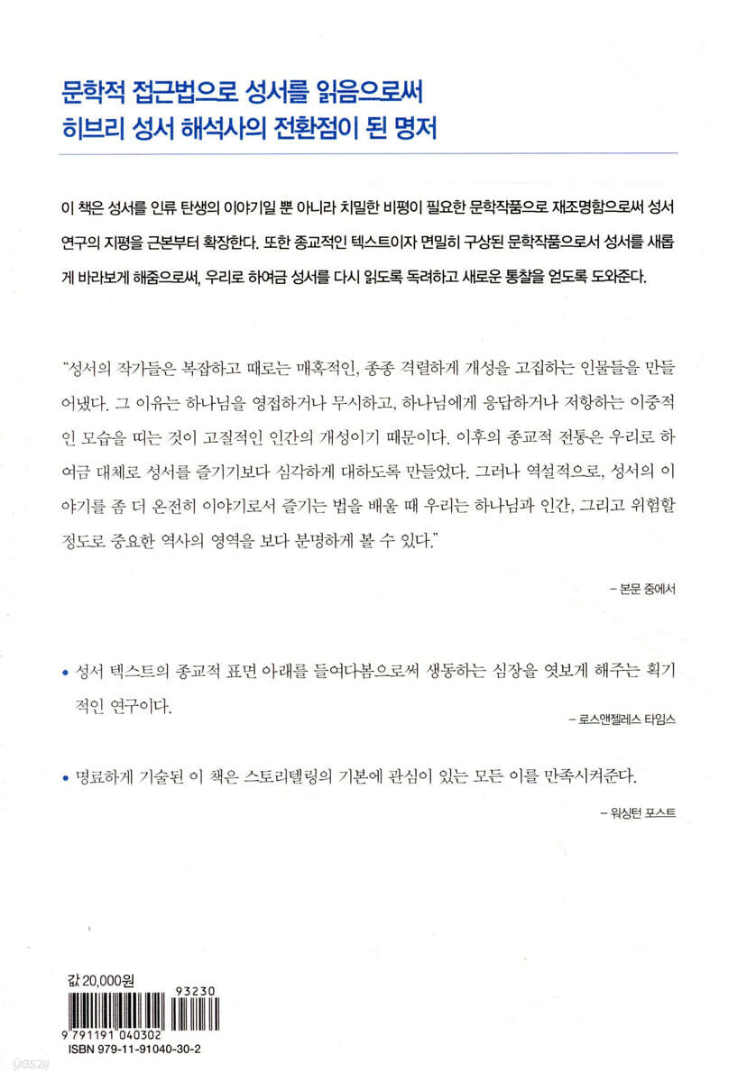 초판 서문 1장 성서에 대한 문학적 접근 2장 신성한 역사와 산문픽션의 기원 3장 성서의 전형장면과 관습의 활용 4장 서술과 대화 5장 반복의 기법 6장 인물 설정과 침묵의 기술 7장 복합의 기교 8장 서술과 앎 9장 결론 옮긴이의 말 찾아보기 |