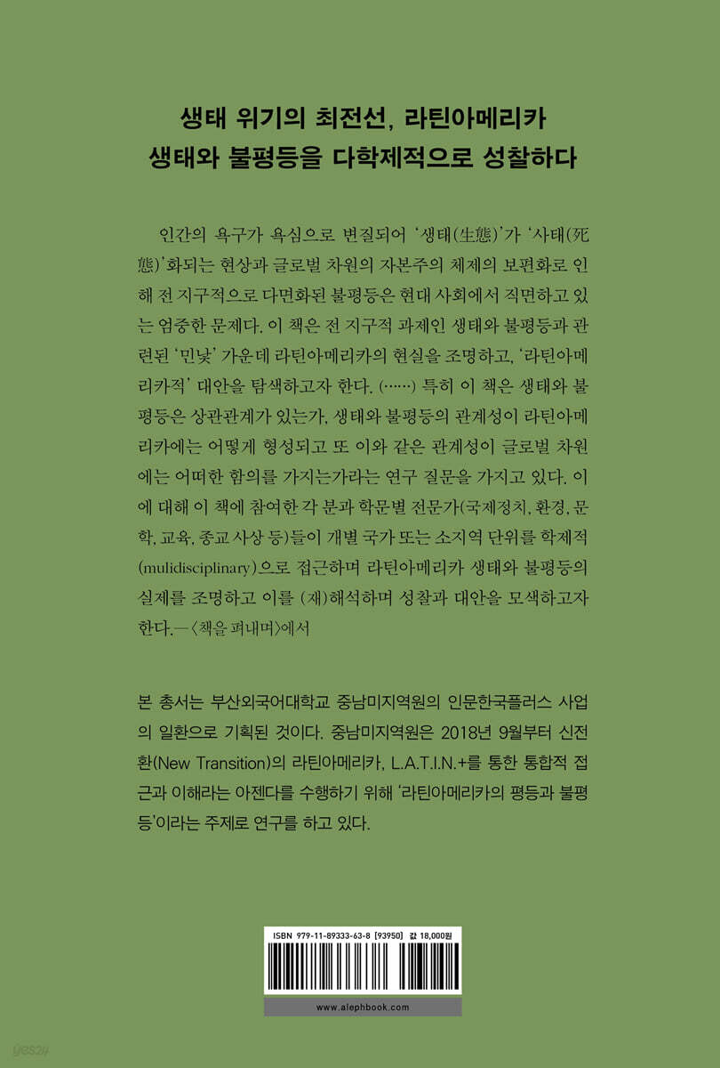 인간의 욕구가 욕심으로 변질되어 ‘생태(生態)’가 ‘사태(死態)’화되 는 현상과 글로벌 차원의 자본주의 체제의 보편화로 인해 전 지구적으로 다면화된 불평등은 현대 사회에서 직면하고 있는 엄중한 문제다. 이 책은 이와 같은 전 지구적 과제인 생태와 불평등과 관련된 ‘민낯’ 가운데 라틴아메리카의 현실을 조명하고, ‘라틴아메리카적’ 대안을 탐색하고자 한다. 다시 말해, 라틴아메리카 지역의 사유와 경험을 활용하여 종합적인 접근을 모색함으로써 인류가 풀어야 할 엄중한 과제에 대한 해결책을 찾고자 한다. 따라서 이 책은 라틴아메리카적 사유를 통해 전 지구적인 대안을 모색하는 중요한 과제를 다룬다.