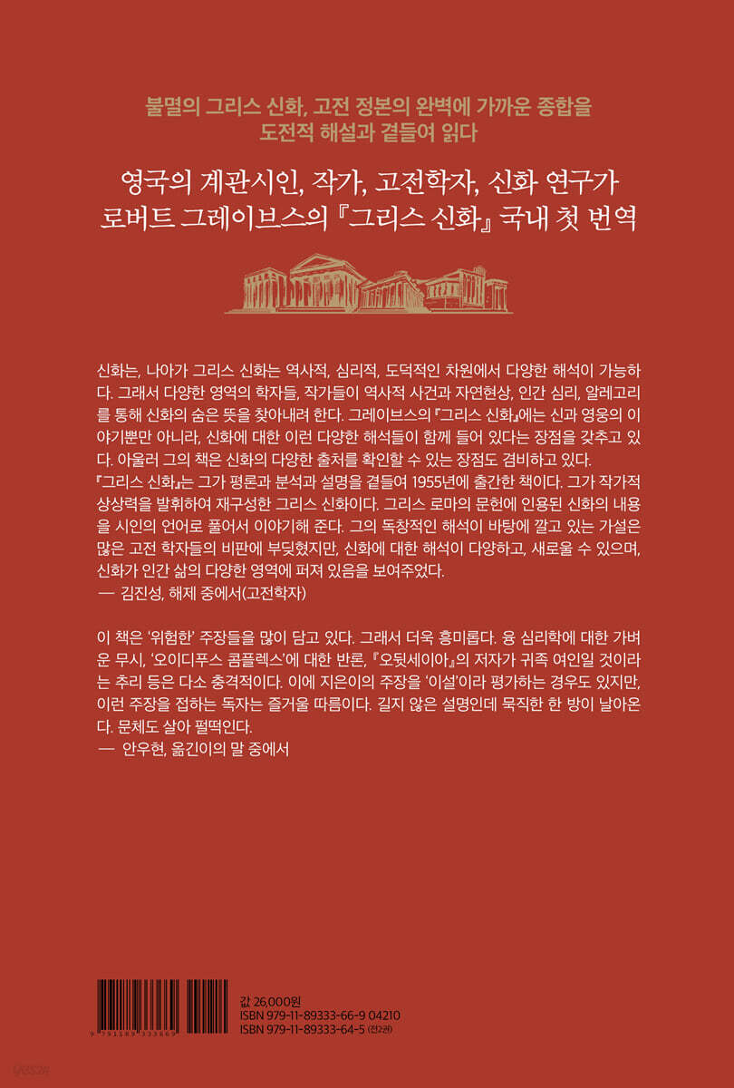 “로버트 그레이브스에게 이 막중한 임무를 맡긴 펭귄북스의 편집자들의 용기와 통찰력에 찬사를 보내야 마땅하다.” ― C. M. 보우라(고전학자, 문학 비평가) 로버트 그레이브스는 현대 영국의 대표적 시인 중 한 사람으로, “17세기 시인 ‘존 던 이래 영국에서 가장 위대한 사랑의 시인”(《타임》), “그레이브스가 없다면 현대 시 자체의 이야기는 불완전하다”는 등의 평가를 받아 왔다. 또한 그레이브스는 『나, 클라우디우스』, 『클라우디우스, 신이 되다』, 『벨리사리우스 백작』 등의 역사소설을 통해 “금세기 최고의 역사 소설가 중 한 사람”(《뉴욕타임스》)이라는 평가를 받기도 했다. 그는 『하얀 여신』으로 그리스 신화와 시적 자극에 대한 새로운 해석과 관점을 제시했다. 고전과 신화에 대한 심도 깊은 연구를 해온 그레이브스는 펭귄북스로부터 ‘그리스 신화’에 대한 책을 집필해 달라는 요청을 받았고, 마침내 정설과 이설을 폭넓게 아우르는 방대한 컬렉션을 구축하고 이에 통찰력 있는 해석을 곁들여 한 편의 ‘그리스 신화 사전’을 엮어 냈다. 이 책, 『그리스 신화』가 바로 그것이다. 그리스 신화를 바라보는 특별한 시선, 논쟁과 비판 속에서 70년간 사랑받은 『그리스 신화』 로버트 그레이브스의 『그리스 신화』가 현대의 독자들이 주로 읽는 ‘그리스 신화집’인 토머스 불핀치 판, 이디스 해밀턴 판, 구스타프 슈바브 판 그리스 신화와 다른 점이 있다. 그것은, 그레이브스가 신화의 정설뿐 아니라 ‘이형’과 ‘이설’에도 주목하여, 이들을 폭넓게 아우르는 신화집을 엮어냈다는 점이다. 그리고 여기에 그레이브스는 자신의 독창적인 해석을 곁들였다. 이러한 방식의 ‘신화 다시 쓰기’가 성취한 문학적 수준은 일반적으로 찬사를 받았다. 한편으로, 그의 독창적인 해석이 바탕에 깔고 있는 가설은 많은 고전학자들의 비판에 부딪히기도 했으며, 이로 인해 『그리스 신화』는 출간 이후 줄곧 논쟁과 비판의 대상이 되어 왔다. 하지만 그는 신화에 대한 해석이 다양하고 새로울 수 있으며, 신화가 인간 삶의 다양한 영역에 퍼져 있음을 보여주었고, 『그리스 신화』는 출간 70여 년이 지난 오늘날에도 널리 읽히는 그리스 신화집 중 하나로 남아 있다. 신화는 살아 숨 쉰다 진정한 그리스 신화, 이제 이형과 이설로 읽는다! 이 책의 가장 큰 장점은 신화를 평면적인 이야기의 단순한 총합이 아니라 입체적으로 이해할 수 있게 한다는 점이다. 아울러 그의 책은 신화의 다양한 출처를 확인할 수 있는 미덕도 겸비하고 있다. 이처럼 그레이브스의 『그리스 신화』는 신화의 여러 이야기 가닥이 어떻게 서로 얽혀가는지, 왜 비슷한 패턴이 반복되는지 의문을 갖게 만든다. 우리의 신화 공부는 그렇게 한 걸음씩 앞으로 나아간다. 오늘날 그리스 신화를 두고 다양한 해석이 이루어지고 있다. 신화는 역사적 사실이 아니다. 그렇다고 완전히 허구인 것도 아니다. 그리스 신화는 역사적, 심리적, 도덕적인 차원에서 다양한 해석이 가능하다. 그래서 다양한 영역의 학자들, 작가들이 역사적 사건과 자연현상, 인간 심리, 알레고리를 통해 신화의 숨은 뜻을 찾아내려 한다. 그레이브스는 『그리스 신화』에서 『하얀 여신』 등 자신의 이전 저술에서 논의된 모계 사회의 종교에 바탕을 두고 이야기의 기원과 의미를 풀어낸다. 이 책의 또 하나 중요한 성취는 그리스 신화와 수메르, 이집트, 히브리(이스라엘), 아일랜드, 북유럽 신화를 꾸준히 비교하고 있다는 점이다. 그리스 신화의 많은 내용이 지금의 중동에서 넘어간 것처럼, 많은 신화들의 뿌리를 더듬어 볼 수 있다. 또한, 그레이브스는 인류학과 고고학 연구의 성과를 바탕으로 가부장제, 가모장제를 구분하면서 그리스 사회의 큰 변화를 포착해 낸다. 한편, 이 책은 ‘위험한’ 주장들을 많이 담고 있다. 융 심리학에 대한 가벼운 무시, ‘오이디푸스 콤플렉스’에 대한 반론, 『오뒷세이아』의 저자가 귀족 여인일 것이라는 추리 등은 다소 충격적이다. 이에 그레이브스의 주장을 ‘이설’이라 평가하기도 하지만, 이런 주장을 접하는 독자는 즐겁고 흥미로울 것이다. 신화가 담긴 고대 그리스·로마 문헌들을 일일이 언급하며, 수많은 신들과 영웅들이 다양한 방식으로 풍부하게 서술되었다는 점 역시 이 책의 주요한 특징이다. 이 책은 신들과 영웅들의 이야기로 양분된다. 신들의 이야기에서는 천지 창조와 인간 창조(1-5장), 신들의 전쟁(6-7, 35장)과 올륌포스 주요 신들을 다룬다(8-27장). 영웅들의 이야기에서는 대표적인 지역 영웅들(테세우스: 94-104장, 헤라클레스: 118-147장, 이아손: 148-157장)의 업적과 트로이아 전쟁의 영웅들(아킬레우스와 오뒷세우스: 158-171장)을 다룬다. 지금, 그레이브스의 『그리스 신화』를 읽는 다섯 가지 이유 오늘날 널리 사랑받는 ‘그리스 신화집’으로는 그레이브스의 것 외에도 토머스 불핀치 판, 이디스 해밀턴 판, 구스타프 슈바브 판 등 여러 버전이 있다. 그럼에도 지금 우리가 그레이브스의 『그리스 신화』에 주목해야 하는 이유는 무엇인가? 정설과 이설을 망라하다 첫째, ‘정본’과 ‘정설’을 구축하는 데 