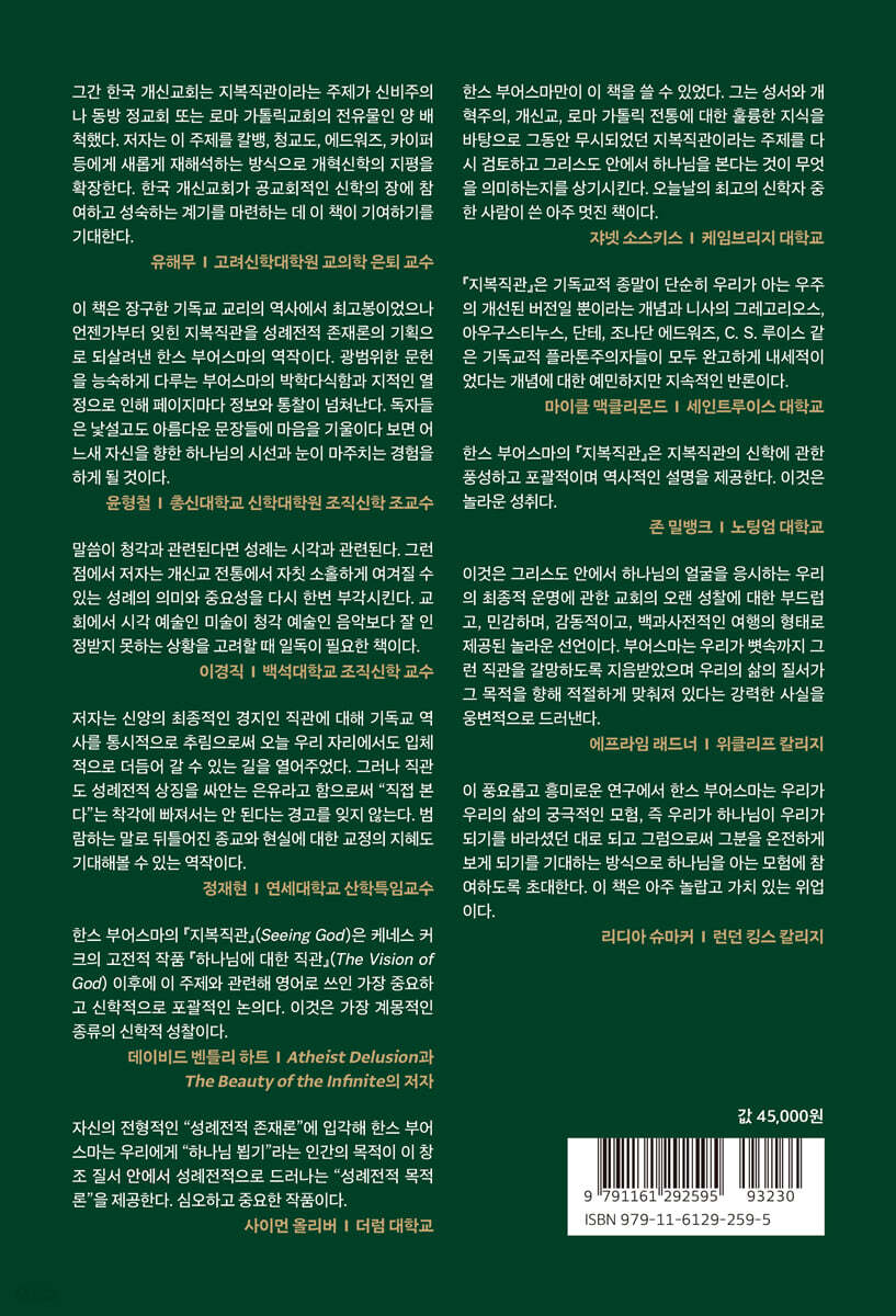 한스 부어스마만이 이 책을 쓸 수 있었다. 그는 성서와 개혁주의, 개신교, 로마 가톨릭 전통에 대한 훌륭한 지식을 바탕으로 그동안 무시되었던 지복직관이라는 주제를 다시 검토하고 그리스도 안에서 하나님을 본다는 것이 무엇을 의미하는지를 상기시킨다. 오늘날의 최고의 신학자 중 한 사람이 쓴 아주 멋진 책이다. - 쟈넷 소스키스 (케임브리지 대학교)