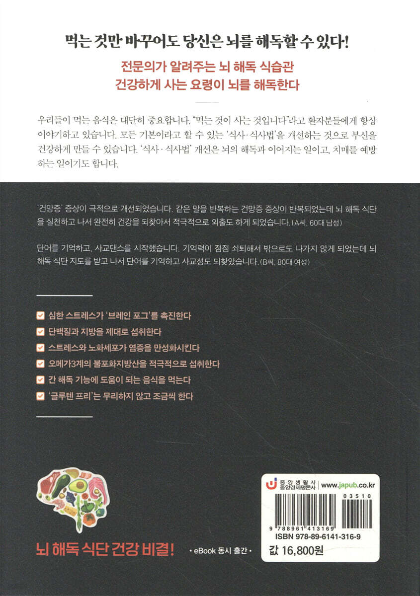 * 일본 최초 부신피로 병원 전문의들의 뇌 해독 식사법! 이유 없이 피곤하지 않은가? 아침에 일어나기가 힘들지 않은가? 우울증 같은 정신적인 문제로 치부되기가 쉬운 피로함의 원인은 놀랍게도 뇌에 쌓인 독소에 있다. 한때 몸이 무척 지쳐 일어날 수도 없었던 저자 혼마 류스케는 자신의 병이 몸속 장기 중의 하나인 ‘부신’이 쇠약해지는 ‘부신피로’임을 각고의 연구 끝에 알아낸다. 부신피로가 심해지면, 부신과 연결된 뇌에도 독이 쌓이고, 노화가 가속되고, 컨디션이 나빠진다. 저자들은 여러 임상으로 체득한, ‘부신을 건강하게 만드는 식사법’, ‘부신이 피로해지지 않는 식사법’, ‘부신 건강에 도움을 주는 일상 속의 생활습관’들을 체계적으로 정리했다. 모든 기본이라고 할 수 있는 ‘식사·식사법’을 개선하는 것으로 뇌를 해독할 수 있다. ‘부신피로’를 치료하는 것이 뇌 건강과 노화를 다스리는 핵심이다. 이 책은 모든 연령대의 독자들이 평생 뇌 건강을 위해 실천할 수 있는 뇌 해독 기본서가 될 것이다. * ‘독소를 들이지 않고, 내보내고, 좋은 것을 섭취하는’ 초간단 뇌 해독의 비밀! 일본에서 최초로 ‘부신피로 병원’을 개원한 안티에이징 분야 전문의들은 뇌를 해독하는 3가지 법칙(독소를 체내에 들이지 않는다, 체내에 들어온 독소를 내보낸다, 몸에 좋은 영양소를 섭취한다)을 제안한다. 뇌 해독을 위한 첫 번째 포인트는 독소를 체내에 들이지 않는 것이다. ‘글루텐 프리’, ‘카세인 프리’, ‘슈거 프리’, ‘카페인 프리’를 지향하는 것은 실천하기 어렵지만, 이 책에서는 뇌에 독이 쌓이게 하는 밀가루 제품, 유제품, 백설탕, 카페인을 제한하거나 대체할 수 있는 실천 가능한 구체적인 방법을 제시하고 있다. 두 번째 포인트는 체내에 들어온 독소는 밖으로 내보내는 것이다. 해독을 위한 여러 종류의 허브, 향신료를 자연스럽게 요리에 활용해보자. 세 번째 포인트는 몸에 좋은 영양소를 섭취하는 것이다. 이 책에서 여러 종류의 제철 음식의 일람과 ‘단백질’과 ‘지방’으로 구성된 간단한 식단을 살펴보자. 오메가3계의 불포화지방산, 아연, 비타민 B군 등 부신피로를 치료하고 뇌 해독으로 이어지는 필수 영양소들도 섭취한다. * “먹는 것이 사는 것입니다” * 건강하게 사는 요령이 뇌를 해독한다! 안티에이징 전문의인 두 저자는 “먹는 것이 사는 것입니다”라고 환자분들에게 항상 이야기하고 있다. 식사·식사법을 비롯한 생활습관의 개선은 인간 본래의 ‘자연스러운 생활방식’의 회복과 맥락을 같이 한다. 앞서 설명한 여러 좋은 습관들을 실천하면서도 너무 지나치게 고집하지 않는 것으로 가장 자연스러운 생활을 추구할 수 있다. 인간 본래의 자연스러운 생활방식을 회복하는 식사·생활습관이야말로 부신을 건강하게 하고 뇌를 해독하는 비결이다. 일상에서 실천 가능한 뇌 해독의 방법을 따라 하면 누구라도 뇌를 치유하고 노화를 늦출 수 있다. |