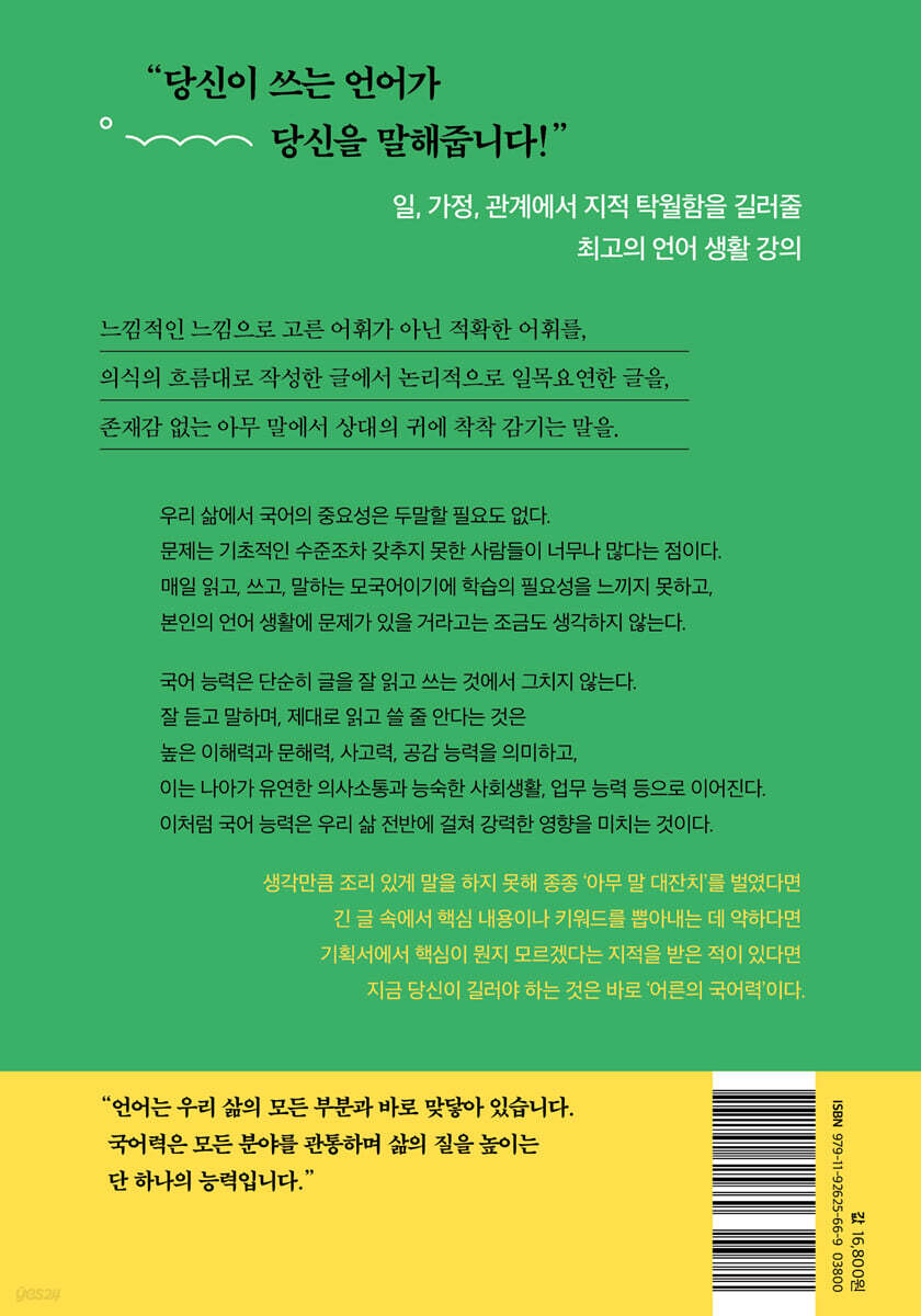 --- p.23 이제 완독과 정독에게 이별을 고하고 편하게 책을 읽어봅시다. 책을 읽는 것은 국어력을 높이기 위한 가장 좋은 방법이긴 하지만 책에 굴복당하는 방향으로 진행되면 곤란합니다. 우리가 실행해야 할 독서법은 발췌독, 즉 ‘골라독’입니다. 골라 읽으면 됩니다. 책 한 권에 너무 많은 것을 바라지 말고, 자신에게 필요한 10퍼센트만 찾아 읽어도 대성공이라고 여유 있게 생각하세요. 어떻게 그럴 수 있느냐고 반문할 수 있겠습니다. 이해합니다. 예를 들어 세계적 석학이 쓴 책이 있다고 가정해보죠. 당연히 처음부터 끝까지 꼼꼼하게 읽어야 하는 것이 옳지 않냐고 말하는 분이 계실 겁니다. 하지만 저는 이에 대해 “어리석은 사람은 이름난 저자의 것이라면 무엇이든지 찬미한다. 나는 오직 나를 위해서만 읽는다”라는 말을 남긴 프랑스의 철학자 볼테르의 말을 인용해서 들려주고 싶습니다. 책은 나를 위해 읽는 것이지, 책을 쓴 사람을 위해 읽는 게 아닙니다. 저자의 대단함은 오직 우리의 일상에 변혁을 줄 수 있을 때 인정되는 것이고, 우리 삶의 변화는 필요한 것을 찾아냄에서 시작됩니다. --- p.34 듣기에 대해 말씀드리고 싶습니다. 잘 말하는 일만큼이나 중요한 것이 ‘잘 들어주는 일’입니다. 관계는 말을 하는 누군가를 바라보는 또 다른 누군가의 듣기가 있기에 유지됩니다. 여러분이 어느 모임에서 나름의 지분을 얻고 있다면 그것은 멋진 말로 구성원들을 매혹해서가 아니라 타인의 말을 잘 들어주고 있기에 그러할 가능성이 높습니다. 만약 들어주기를 멈춘다면 여러분의 지분은 사라질 겁니다. --- p.73 누군가를 ‘디스’한 말 한마디가 바로 당사자의 귀에 들어가는 순간을 상상해보시죠. 끔찍합니다. 우리가 세상의 모든 것에 대해 일일이 잘남과 못남, 옳고 그름을 따질 필요가 없는 이유입니다. 본인의 일상을 누리는 데 아무런 문제를 주지 않는 것이라면 더더욱 그러합니다. 그 대신 비움의 마음과 절제하는 태도로 말을 해야 최소한 중간은 갈 수 있습니다. 누군가 혹은 무엇인가의 옳고 그름을 하나하나 전부 확인하면서 살려고 하는 건 본인의 삶만 피폐하게 만드는 행동입니다. ‘내가 아닌 것들’과 투쟁하는 것이 아니라 본인 삶의 본질적 가치에 집중하려는 말하기야말로 어른답고 세련된 삶의 태도 그 자체입니다. --- pp.102~103 대학생이라면 교수님이 평가자입니다. 회사원이라면 상사가 의사 결정권자입니다. 논문, 보고서 등은 모두 이들의 입장에서 생각하고 쓰면 됩니다. 잘 생각이 나지 않는다면 그들이 하라고 하는 대로만 하면 됩니다. 그뿐입니다. 우리의 글이 늘 그 모양이었던 이유, 이제는 짐작되십니까. 정해진 규칙대로 쓰지 않아서 그런 것입니다. 유명한 저자나 명사처럼 멋진 작품을 쓰려고 하기 전에 ‘써야 할 것’부터 쓰십시오. 그러면 최소한 중간은 갑니다. 놀랍게도 우리 주변에는 중간도 가지 못하는 어른이 너무나 많습니다. --- pp.178~179 |
