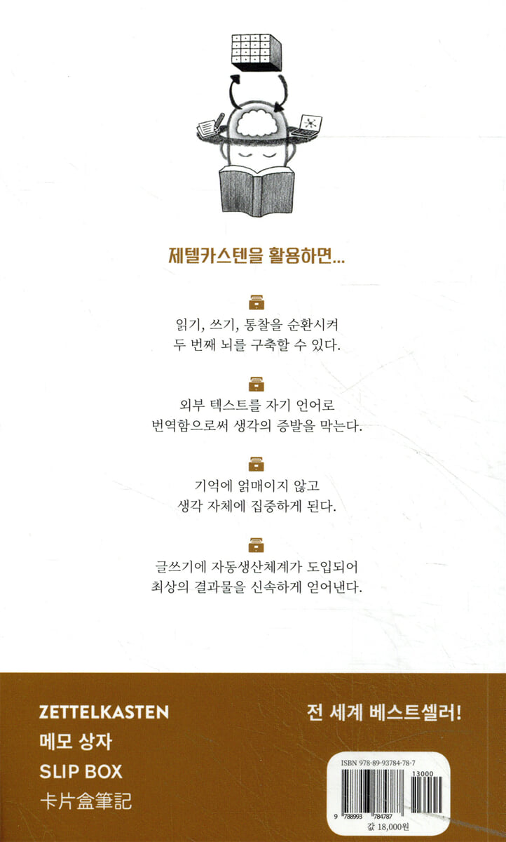 『재수의 연습장』으로 유명한 만화가 재수는 자신의 SNS에 최근 다음과 같은 글을 연달아 올렸다. “작년 11월 제텔카스텐을 알게 되었습니다. 종이에 직접 쓰고 분류하는 메모 활동의 질과 품격을 높여주는 수납장을 상상했습니다. …. 저는 오늘 하루 내내 이 생각에 사로잡혀 있었습니다. 메모들을 연결하고 조직화하는 시스템을 갖추는 것만으로 큰 도약이 생길 거라는 기대감에 설레었네요. …. 서랍 한 개의 샘플이 도착했습니다. 아름답네요… 이제 여기에 메모를 쌓고 연결하고 순환시켜보겠습니다.” 머릿속에서 다양한 아이디어들이 교차하다 어느 순간 사라지는 경험을 수없이 해봤을 예술가에게 자신의 뇌처럼 기능하는 별도의 저장공간이 있다면 작업의 완성도뿐만 아니라 그 속도는 기하급수적으로 향상될 것이다. 이런 가치를 단번에 알아차린 재수 작가는 『제텔카스텐』 최신 개정판의 표지 이미지를 작업하기도 했다. 취향에 따라 종이에 직접 메모를 하고 순번을 매겨 상자에 모아두는 아날로그 방식을 고수할 수도 있고, 옵시디언이나 노션 같은 스마트 앱을 적극 활용할 수도 있다. 그러나 어느 방식이든 제텔카스텐이 갖는 의미는 마찬가지이다. 바로 “두 번째 뇌”를 갖는 것이다! 모든 학습능력을 폭발적으로 향상시키는 단 한 가지 심플한 원리! 효과적이고 생산적인 학습의 열쇠는 순간순간 떠오르는 아이디어와 메모들을 스마트하게 관리하는 데 있다. 이 책 『제텔카스텐』은 메모들 사이에 연결 관계를 만들어 상자로 대표되는 특정한 공간에 보관해 두는 단순한 원리만으로 어떻게 읽기, 쓰기, 사고력, 분석력 등 모든 학습능력이 폭발적으로 향상되는지, 심리학적 통찰이 담긴 수많은 실험 결과들을 통해 설명하고 있다. 이 책에 소개된 심플한 메모법을 활용하면 당신은 지난 자료들, 인용문, 그리고 참고문헌을 뒤지느라 시간을 허비하는 대신 정말로 중요한 일, 즉 생각하고 이해하고 새로운 아이디어를 발전시키는 데 집중할 수 있다. 에버노트, 노션, 옵시디언, 롬 리서치 등 최신 스마트 노트 앱들을 사용해도 좋고 그냥 펜과 종이를 사용해도 좋다. 원리만 알고 있으면 당신은 지금 당장, 최고의 생산성을 발휘할 수 있다. 어떤 도구를 사용하든 제텔카스텐이라는 두 번째 뇌와 함께한다면 논문, 에세이, 보고서 등 당신이 이루고자 하는 모든 프로젝트들이 가장 효율적인 방식으로 완성될 것이다. 자신의 언어로 써 놓지 않은 지식은 곧 증발될 감각일 뿐이다. 1987년 「사회 시스템」이라는 제목으로 니클라스 루만의 저작목록에서 도서번호 “666”번을 단 책이 출간되었을 때 사람들은 이런 번호가 달린 것이 우연이 아니라고 생각했다. 악마와 거래한 결과로밖에 설명될 수 없을 정도로 루만의 다작 능력은 불가사의했기 때문이다. 그러나 루만이 남긴 9만여 장의 메모들을 분석한 결과 오늘날 하이퍼링크나 해시태그로 불리는 기법들과 유사한 방식으로 메모들이 촘촘하게 연결되어 있으며 그런 연결 관계를 꾸준히 만들어 놓은 것이 폭발적인 생산성의 비법인 것으로 밝혀졌다. 이제 하이퍼링크든, 해시태그든, 백링크든, 얼마든지 손쉽게 만들어 낼 수 있는 스마트 노트 앱들을 손에 쥔 우리들이 루만과 같은 능력을 발휘하지 못할 이유가 없다. “그 누구도 글을 쓰지 않고는 생각할 수 없다.” 루만은 이렇게 단언했다. 그가 남긴 메모 상자를 들여다보면 우리가 학습이라고 할 때 떠올리는 행위들, 즉 책에 열심히 밑줄을 치고 그 내용을 연습장이 까맣게 될 때까지 베껴쓰는 것이 얼마나 비효율적이고 단시안적인 방법이었는지 깨닫게 된다. 밑줄 치고 베껴쓰는 대신 자신이 읽은 내용을 자신의 언어로 “번역”하여 메모를 남기는 것, 그리고 그 메모들을 연결해놓는 것, 이 단순한 원리만으로도 당신은 지금껏 경험해 보지 못한 학습 성과를 이루게 될 것이다. 그 원리들이 고스란히 녹아 있는 『제텔카스텐』 이 한 권의 책이 언제나 생산적인 글쓰기를 갈망하던 당신의 인생을 송두리째 변화시키리라 단언한다! 개발자와 프로그래머들 사이에서 컬트적인 독서열풍을 일으킨 바로 그 책! 『제텔카스텐』은 특히 IT 개발자들 사이에서 열광적인 반응을 일으키고 있다. 트위터나 유튜브를 통해 서로에게 이 책을 추천하면서 이 책이 자신의 사고방식을 어떻게 바꿔놓았는지, 이 책을 통해 얼마나 많은 통찰력을 얻었는지, 그리고 좀 더 일찍 이 책을 알았다면 그동안 겪었던 시행착오는 없었을 텐데 하는 아쉬움 가득한 토로에 이르기까지, 이 책에 대한 다양한 논의들이 끝없이 이어지고 있다. 그들은 왜 이토록 이 책에 빠져드는 것일까? 그 이유는 직종의 특성상 프로그래머나 IT 개발자들이 두루 갖춰야 하는 능력들이 바로 제텔카스텐이 제공하는 바와 정확히 일치하기 때문이다. 정확성, 창의성, 그리고 생산성 말이다. 이 책의 진정한 가치를 느낄 수 있는 사람은 아마도 그동안 좀 더 생산적인 방법은 없을까를 고민하면서 고군분투해왔던 사람일 것이다. 자 이제, 더 이상 회의감만 느끼게 만드는 방법론들은 뒤로 한 채, 제텔카스텐이라는 검증된 솔루션으로 새로운 통찰력