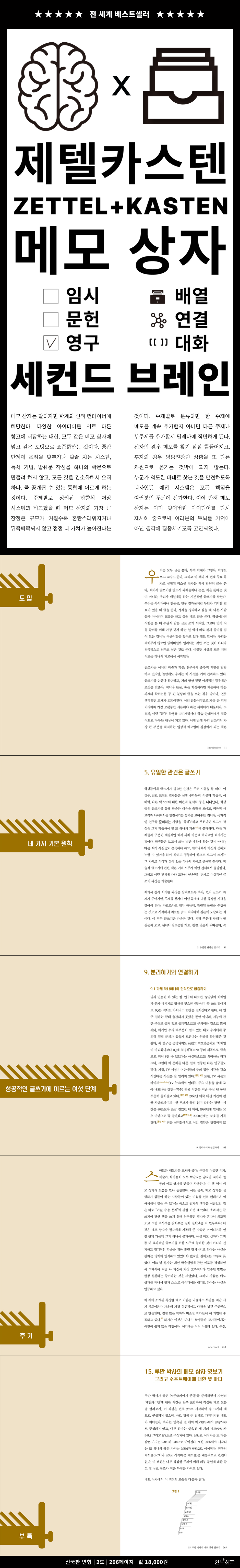 1. 여러분이 알아야 할 모든 것 2. 여러분이 해야 할 모든 것 3. 여러분이 지녀야 할 모든 것 4. 명심해야 할 한두 가지 2부 네 가지 기본 원칙 5. 유일한 관건은 글쓰기 6. 가장 중요한 것은 단순함 7. 맨땅에서 시작하는 사람은 없는 법 8. 흐름을 타고 나아가기 3부 성공적인 글쓰기에 이르는 여섯 단계 9. 분리하기와 연결하기 10. 이해를 위한 읽기 11. 스마트하게 메모하기 12. 아이디어 발전시키기 13. 통찰 공유하기 14. 습관화하기 후기 부록: 15. 루만 박사의 메모 상자 엿보기, 그리고 소프트웨어에 대한 몇 마디 출처 |