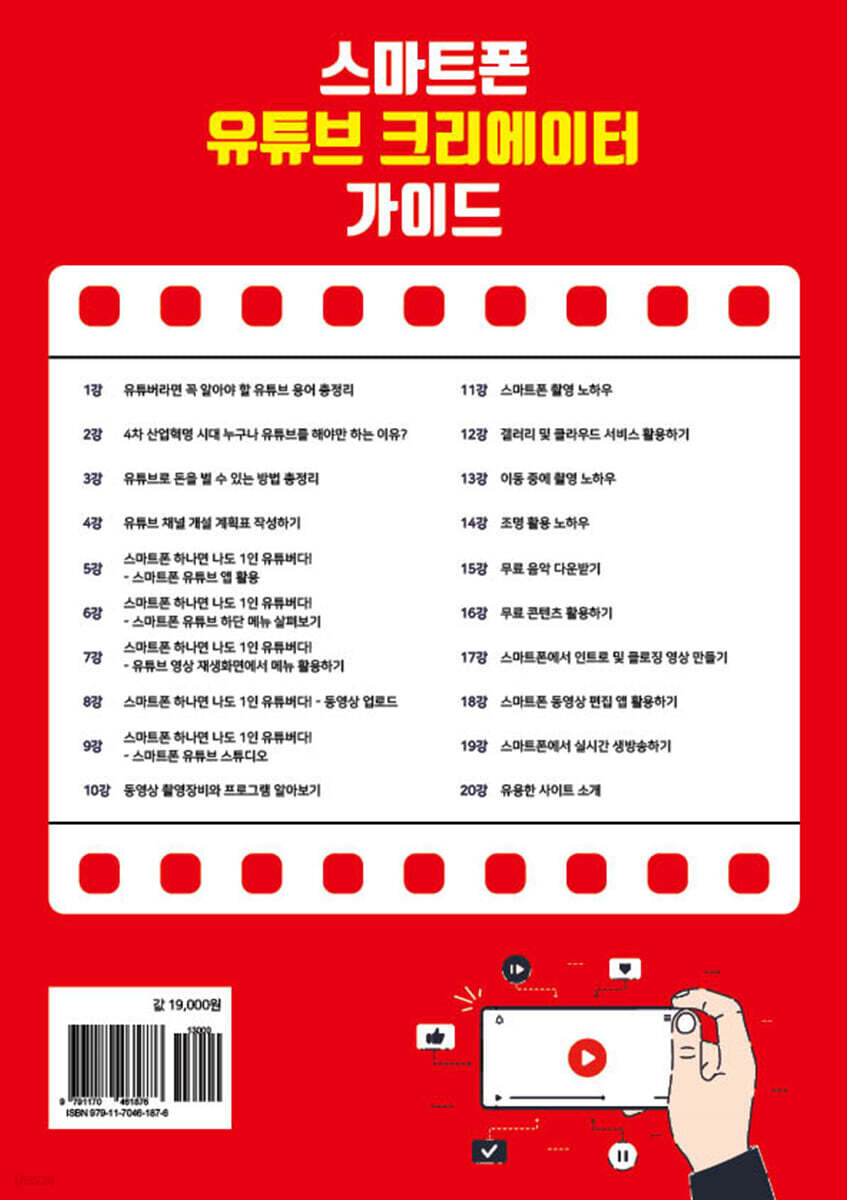 브랜드 계정 채널(Brand channel) 구글에 가입하여 해당 아이디로 본 채널을 개설한 이후 추가적으로 개설한 서브 채널을 말합니다. YPP(YouTube Partnership Program) 유튜브 파트너십 프로그램 유튜브 파트너십 프로그램은 유튜브 사용자들이 동영상 업로드를 통해 수익을 창출하는 기회를 제공하는 프로그램입니다 범퍼 광고(Bumper AD) 범퍼 광고는 건너뛸 수 없는 인스트림 광고와 비슷하고, 동영상 전후, 중간에 6초 이하의 짧은 광고를 말합니다. 덕후, 오덕 -기존 사용하던 영어 'mania'와 같은 의미로 무언가에 열중하는 사람, 본인이 좋아하는 특정 영역에 대한 취향이 뚜렷한 이들을 지칭하는 용어로 --- pp.18~29 4차 산업혁명 시대 누구나 유튜브를 해야만 하는 이유? 직장인들의 경우에도 과거와 달리 투잡, 쓰리잡을 하는 경우가 많습니다. 직장인들이야말로 미래를 준비하는 차원에서라도 유튜버로서 활동해야 합니다. 과거에는 특정인이나 특정 콘텐츠가 인기가 많고 돈이 되었습니다. 하지만, 요즘은 흥미 위주의 콘텐츠를 넘어서 다양하고 전문적인 지식을 공유하는 유튜버들이 시청자들과 소통하면서 유튜브 세계를 키워나가고 있습니다. --- p.39 유튜브로 돈을 벌 수 있는 방법 총정리 1. 구글 애드센스 광고로 돈을 벌 수 있습니다. 구글 애드센스 광고는 유튜브 영상 앞에 나오는 광고를 말합니다. 구독자 1,000명 1년 내 총 시청 시간 4,000시간 이상이 되어야 조건이 됩니다. -구글 애드센스란? 구글에서 운영하는 광고 수익 배분 사업입니다. 2. 유튜브 멤버십으로 돈을 벌 수 있습니다. 매달 정기적으로 일정 금액을 크리에이터에게 후원하는 제도를 말합니다. 멤버십 수익 배분은 7:3으로 수익 의 70%를 유튜버가 가져가는 구조입니다. 구독자 3만 명 이상인 크리에이터들만 가능한데 게임채널은 1,000명 이상이면 된다고 합니다. 3. 유튜브 슈퍼 챗(Super Chat)으로 돈을 벌 수 있습니다. 유튜브의 실시간 스트리밍 방송에 들어 있는 슈퍼 챗 기능을 이용해 수익을 버는 방식입니다. 구독자 1,000명 이상 만 18세 이상이어야 합니다. --- pp.41~42 유튜브 채널 개설 계획표 작성하기 [ 유튜브 채널 개설 계획표 ]는 SNS소통연구소 블로그에서 다운받으실 수 있습니다. *마케팅 타깃 마케팅의 기본은 고객을 세분화하는 것입니다. 처음 유튜버 활동을 하는 사람들은 자신이 만든 콘텐츠가 남녀노소 누구에게나 통용된다고 생각하면서 영상을 제작하게 되는데 현 실은 그렇지 않습니다. [ 60대 이상 스마트폰 사용자들은 꼭 보셔요 ]라고 했는데 조회 수가 24,307회나 나왔습니다. *홍보 키워드(검색어) 만들기 예를 들어 [ 남성 화장품 ]을 소개하는 영상이라고 한다면 유튜브에서 많이 검색되는 관련 키워드를 찾아보는 것이 우선이지만 네이버가 가장 많이 사용하는 검색 사이트이므로 네이버 검색창에 [ 남성 화장품 ]이라고 검색해 보면 하단으로 관련된 키워드들이 보이는데 네이버에서는 [ 연관 검색어 ]라고 하지만 이런 키워드들도 함께 섞어서 사용하면 시청자를 모으는 데 조금이라도 도움이 될 것입니다. --- p.47 스마트폰 하나면 나도 1인 유튜버다! - 스마트폰 유튜브 앱 활용 [ 두 번 탭하여 탐색 ] 시간이 초 단위로 보입니다. 15초를 터치합니다. --- p.53 자막 1 재생 중인 동영상 화면 우측 상단 [ 설정(톱니바퀴 모양) ]을 터치합니다. 2 [ 자막 ]을 터치합니다. --- p.58 전체화면 모드가 작동되지 않을 경우(공유받은 영상의 경우) 1 카카오톡으로 [ 유튜브 URL 링크 ]를 공유받은 경우에 활용할 수 있습니다. 2 ② [ 다른 기기에 연결 ]은 TV나 주변 다른 기기에 연결하여 시청할 수 있습니다. --- p.62 유튜브 숏츠(YouTube Shorts) 만드는 3가지 방법 1. 촬영과 편집과 업로드를 유튜브(YouTube)에서 합니다. 2. 촬영은 다른 앱으로 하고 편집과 업로드를 유튜브(YouTube)에서 합니다. 3. 촬영과 편집은 다른 앱에서 하고 업로드만 유튜브(YouTube)에서 합니다. --- p.63 동영상 만들기 [ 동영상 업로드 ]를 터치합니다. 2 [ 갤러리 ]에서 영상을 선택합니다. 3 [ 다음 ]을 터치합니다. [ 세부정보 추가 ] 동영상 제목, 설명 추가, 공개 상태(공개, 일부 공개, 비공개) 중에 하나를 선택합니다. --- p.65 라이브 스트리밍 시작 1 유튜브 라이브 스트리밍은 일반적으로 유튜브에서 방송하는 것을 의미합니다. [ 더하기 버튼 ]을 터치합니다. 2 [ 라이브 스트리밍 시작 ]을 터치합니다. --- p.66 동영상 업로드 ㆍ동영상 업로드 - 일반 영상 업로드 할 때 1 ① 유튜브 하단 메뉴에 [ + ]를 터치합니다. 2 ① [ 동영상 업로드 ]를 터치합니다. 3 ① 갤러리에 내가 준비한 60초 이상의 업로드 할 영상을 찾아 선택합니다. (15분 이상 일반 동영상을 첫업로드 시 구글 계정을 문자 메시지 또는 자동 음성 통화로 인증코드를 받아 계정 확인을 한 후 가능하며 60초 이하 영상의 경우 Shorts 동영상으로 변경하여 올릴 수 있습니다.) - Shorts 동영상 설명 PC에서 삽입하기 -① PC에서 유튜브 내 계정으로 들어가 [ 내 동영상 ]을 클릭해 동영상 목록 화면으로 이동합니다 --- p.78 스마트폰 하나면 나도 1인 유튜버다! - 스마트폰 유튜브 스튜디오 - 내 채널 분석하기 1 ① [ 내 채널 ] - [ 동영상 관리 ]로 들어가서 업로드된 동
