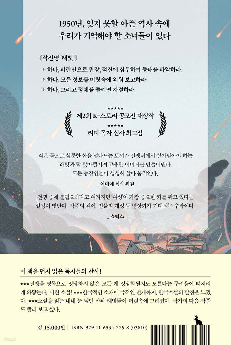 리디 독자 심사 최고점 1950년대 한반도에 실재했던 소녀 첩보원 ‘래빗’ 살아남는 것만이 유일한 목표이자 꿈이었던, 지금은 세상에서 잊힌 이들의 이야기! “작은 몸으로 험준한 산을 넘나드는 토끼가 전쟁터에서 살아남아야 하는 ‘래빗’들과 딱 맞아떨어져 고유한 이미지를 만들어낸다. 홍주를 비롯한 모든 등장인물이 살아 움직인다.” -이미예 심사평 2022 제2회 K-스토리 공모전에서 6.25전쟁을 배경으로, 당시 활동했던 소녀 첩보원들의 삶을 생생하고 감동적이게 그려낸 『래빗』이 대상을 받았다. 2021년에 이어 올해도 심사를 맡은 이미예 작가는 “흰토끼가 시각적으로 첩보원 소녀들과 맞아떨어지면서 이야기의 고유한 이미지가 머릿속에 각인됐고, 모든 등장인물이 살아 움직이는 것 같다.”, “생생한 영상화가 기대되는 작품”이라고 호평했다. 심사에 참여한 제작사 쇼박스는 “전쟁에 불필요하게 여겨졌던 여성이 가장 중요한 키를 쥐고 있다는 설정이 빛난다.”, “작품의 깊이, 캐릭터의 입체성 모두 발군”이라고 최고점을 주었으며, 제작사 SLL은 “실제 소재인 래빗을 모티프로 한 콘셉트가 눈길을 끌”며, 특히 “여성 캐릭터 간의 유대가 잘 드러난다.”고 심사평을 남겼다. 또, 백여 명의 독자 심사 위원에게도 뜨거운 반응을 불러일으키며 가장 높은 점수를 받아, 작품성과 대중성을 모두 갖춘 수작임을 증명했다. “아무런 의심을 받지 않고 적진을 돌아다닐 첩보원이 필요합니다. 누가 전쟁 중에 어린 여자애들을 의심합니까?” _본문 중에서 『래빗』은 6.25전쟁을 배경으로, 당시 작전을 펼쳤던 첩보원 ‘래빗’들의 활동에 스포트라이트를 비춘다. 적에게 의심받지 않는 효율적인 정보원이 필요해 시작된 작전명, 래빗. ‘전쟁 승리’라는 국운을 건 중대한 사명 아래, 힘없는 개개인의 운명은 손쉽게 스러지고 묻힌다. 무기는 피아를 가리지 않으므로, 아군의 지뢰, 미사일, 총칼에 희생되는 일도 종종 일어났다. 심지어 첩보원인 래빗은 작전 중에 적군에게 회유되어 변절하지는 않았는지 늘 아군의 의심을 견뎌야 한다. 적군의 총칼 앞에서 살아 돌아와도 아군의 의심을 피하지 못하면 죽을 수도 있는 위태로운 존재다. 그러나 이 이야기에 나오는 래빗들은 철두철미하게 작전을 수행하면서도 인간성과 다정함을 잃지 않는다. 누군가를 의심하고, 죽이는 게 당연해진 상황에 익숙해지고 싶지 않다고, 비겁하고 비정한 마음에 전쟁이라는 핑계를 대고 싶지 않다는 그들의 꼿꼿한 마음이 귀해서 더 빛난다. 더욱이 총상을 입은 동료를 포기하지 않고 함께 돌아오는 강인한 생명력도 지니고 있다. 장편 시나리오 작업을 계속해 온 고혜원 작가는 뛰어난 캐릭터 설정과 철저한 사전조사를 거쳐 한편의 웰메이드 영화를 보는 듯 울림을 주는 작품을 만들어냈다. 전장에서 교차하는 두 소녀의 운명 폐허가 된 마음에서 피어나는 한 줄기 희망 여기 갓 스물이 된 두 명의 여성 첩보원, 홍주와 유경이 있다. 홍주는 전쟁이 시작되자마자 폭격으로 모든 것을 잃었다. 살고 싶지 않았기에 고향을 떠나 첩보 부대에 입대했다. 또 다른 래빗, 유경은 첩보원 활동을 하면 원하는 것을 들어주겠다는 거래에 응했다. 또, 보고 싶은 사람을 만날 수 있을까 하는 기대도 있었다. 두 가지 모두 유경에겐 꿈같은 일이었다. 3년 후, 홍주와 유경은 적군 점령지에서 마주친다. 우연히 두 사람 다 래빗이라는 걸 알게 되어 함께 지내면서, 전쟁이 시작되고는 처음으로 사귄 벗이 된다. 홍주는 유경 덕분에 전쟁이 끝난 뒤의 미래를 꿈꾸고, 유경은 홍주 앞에서 〈옥중화〉 연극을 선보이며 배우라는 제 꿈을 펼쳐 보인다. 그렇게 유경의 꿈과 미래는 잃어버린 과거를 붙잡고 있던 홍주에게로 전해진다. “이 전쟁이 곧 끝나면 너는 뭘 하고 싶어? 나는 무대에 설 거라고 이미 말했잖아.” “……모르겠어. 생각해 본 적이 없어서.” “그럼 이제부터 상상하고 생각해. 전쟁이 끝나면 너는 무엇을 할지.” _본문 중에서 첩보 부대 켈로(KLO)에서 적진으로 향한 래빗들은 열에 아홉이 죽었기 때문에 그곳에서 죽음은 특별하지 않다. 가장 오래 살아남은 홍주는 돌아오지 못한 소녀들의 이름을 다 외우지 못해 캐비닛에 바를 정 자를 새겨 그 숫자를 기억한다. 다시 만날 수 없는 동료들의 빈자리를 보며 홍주는 스스로에게 묻는다. ‘죽고 싶어서 왔는데, 아군으로부터 변절을 의심받으면서도 왜 나는 필사적으로 살아남고 있나.’ 자기모순에 갇힌 홍주에게, 전쟁이 끝나면 무엇을 할지 상상해 보라는 유경의 말은 이렇게 들리지 않았을까. ‘살아 있는 것이 살아 있으려는 데는 이유가 없으니, 쓸데없는 생각 말고 네가 하고 싶은 걸 찾아.’ 언제나 앞을 보고 걷는 유경은 흔들리지 않고 나아갈 수 있게, 제자리걸음 중이던 홍주의 손을 이끈다. 래빗들이 켈로 부대에 들어온 이유는 저마다 다르다. 누군가는 막 해방된 조국에 대한 애국심으로, 또 누군가는 소중한 것을 앗아간 적군에 대한 복수심으로 자원하여 입대했다. 하지만 그런 마음은 시간이 흐르면서 점점 사라져 가고, 래빗들은 저마다 생존의 이유를 찾는다. 내일을 기대하