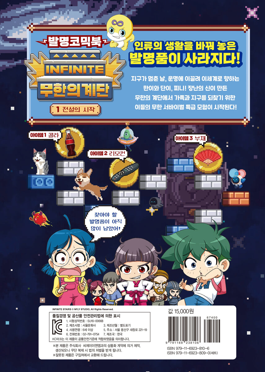 이용유저: 7~13세 (초등학생) 유저층의 6~70% 점유 / 하루 이용자수: 90만 명 두 개의 버튼으로 끝없이 계단을 오르는 아케이드 게임! 캐릭터 380종, 캐릭터 스킨 167종, 캐릭터 변신 칭호 172종, 펫 169종 다양하고 수많은 캐릭터들로 계단을 오르고 기록을 세우는 즐거움! 2000만 명 다운로드, 무료게임 인기순위 1위, 8년 스테디셀러 모바일 게임! [무한의 계단 발명코믹북]의 특징 2015년 런칭 후 간단한 조작방법과 플레이로 유저층 6~70%인 초등학생의 마음을 사로잡은 스테디셀러 모바일 게임, [무한의 계단]이 발명 코믹북으로 태어나다! 특징1 ‘무한의 계단’이라는 설정과 ‘발명’이라는 주제를 결합해 주인공이 발명아이템을 얻고 활용하면서 미션을 달성하게 되며, 자연스럽게 다양한 ‘발명’에 대한 상식도 습득하게 됩니다. 특징2 게임사(엔플라이 스튜디오)에서 코믹북을 위해 만든 주인공 한이, 단이, 피니가 코믹북 출간에 맞춰 게임에도 런칭될 예정으로 코믹북에서 서사를 만들어 갈 세 명의 주인공을 게임 속에서도 캐릭터로 만나는 색다른 즐거움을 누릴 수 있습니다. 특징3 주인공은 엄마를 찾기 위해, [무한의 계단]을 올라가면서 게임 속 수많은 캐릭터와의 서바이벌 대결을 하고, 아이템을 찾아내며 때론 실수로 떨어지기도 하고, 지하에 갇히기도 하는 어려움에 빠지기도 합니다. 이것은 큰 목표를 이루기 위해 누구나 겪어야만 하는 과정을 보여주는 것이기도 합니다. 독자들은 주인공의 흥미진진한 모험을 통해 책 읽는 즐거움을 느끼게 될 것입니다. 또한 어려움을 헤쳐 나가며 무언가 얻기 위해서는 끊임없는 노력과 의지가 필요하다는 것을 깨닫게 될 거예요. 그리고 함께 성장할 수 있을 것입니다. |