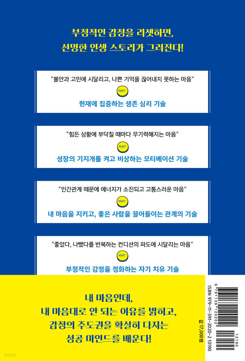 ◆ 성장의 기지개를 켜고 비상하는 모티베이션 기술 ◆ 내 마음을 지키고, 좋은 사람을 끌어들이는 관계의 기술 ◆ 부정적인 감정을 정화하는 자기 치유 기술 부정적인 감정을 긍정적인 감정으로 리셋하는 지혜를 이해하면, 우리의 일상과 인생은 완전히 달라진다. 세상살이의 고단함으로부터 마음을 유연하게 지키고 인생을 조망하는 관점을 터득하는 순간, 내 인생에 엄청난 그림이 그려지고 있음을 깨닫게 될 것이다. 내 마음인데, 내 마음대로 안 되는 이유를 밝히고, 감정의 주도권을 확실히 다지는 성공 마인드를 배운다! 정신과 의사이자 베스트셀러 작가인 저자는 20여 년간 ?Twitter,?Facebook,?Instagram, 뉴스레터를 통해 일반인들에게 정신의학, 심리학, 신경과학 관련 지식을 알기 쉽게 전달해 왔다. 2014년부터는 유튜브 채널을 개설하여 스트레스 해소, 정신질환 예방 및 치료에 도움이 되는 정보 콘텐츠를 매일 업로드 하는 크리에이터이기도 하다(23년 7월 기준 구독자 46.4만 명). 저자는 수천 건의 고민 상담을 해 오면서 세상의 모든 고민에는 ‘공통점’이 있다는 흥미로운 사실을 발견했다. 그 공통점을 분석한 결과, ‘세상 고민의 90%는 스스로 해결할 수 있다’고 말한다. 세상 고민의 90%는 후회, 초조, 짜증, 불안과 같은 ‘부정적인 감정’이 원인이기 때문이다. 이 책에는 ‘누구라도 실천할 수 있는 확실한 노하우를 중심으로, 이해하기 쉬운 문장과 실용적인 방법을 제시한다’는 저자의 사명이 담겨 있다. 총 6장에 걸쳐, 90여 가지의 실천적 감정리셋 기술을 제안한다. 심리학, 정신의학, 뇌과학 등 과학적 연구를 기반으로 하고 있기 때문에 재현성이 높다는 것이 이 책의 강점이다. 1장 : 내 감정인데 내 마음대로 통제가 안 돼서 힘들 때가 있다. 우리의 감정은 뇌에서 만들어지므로 뇌 속 물질들의 일정한 변화와 작동 패턴 그리고 메커니즘을 이해하면 감정을 제어할 수 있다. 뇌 과학적 관점에서 감정을 리셋하는 방법을 제시한다. 2장: 인생을 즐기는 사람들은 어떻게 순식간에 기분을 전환할까? 저자가 실제로 효과를 확인했고, 공신력 있는 연구기관과 학자들이 발표한 자료에 기반하여, 긍정적인 마음으로 전환하는 구체적인 실천 방법을 제안한다. 3장: 성공한 사람들이 고난과 고통을 동기 부여의 원천으로 전환한 방법은 무엇일까? 그들이 단숨에 의욕을 끌어올리는 노하우를 분석하여, 괴로움을 성장 동력으로 전환하고 동기부여로 이어가는 기술을 배운다. 4장: 인간관계가 좋은 사람들은 어떻게 악의를 호의로 바꾸고 주변에 사람을 모을 수 있었을까? 인간관계가 나쁘면 삶이 곤궁해지고, 인간관계가 좋으면 삶이 풍요로워진다. 타인과 좋은 관계를 맺기 위해 필요한 요령을 터득한다. 5장: 어지간해서는 감정 기복이나 주변 여건에 쉽게 동요되지 않고 충실한 일상을 사는 사람들은 걱정을 빨리 지우는 방법을 알고 있다. 고통과 근심의 무게를 덜어내는 데 유용한 6가지 리셋 기술을 소개한다. 6장: 각종 불안과 근심에 효과적으로 대처하기 위해서는 감정 리셋 파워를 높이는 두뇌 습관이 필요하다. 긍정적인 일상을 지켜내는 기본 생활 수칙을 점검하자. |