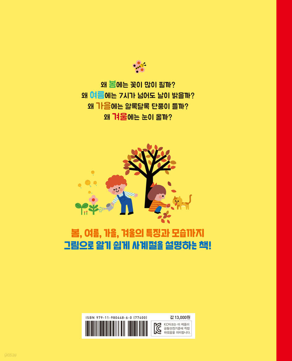 그림으로 알기 쉽게 사계절을 설명하는 책! 우리나라의 사계절은 저마다의 모습으로 아름다움을 뽐내요. 꽃과 함께 피어나는 봄, 바다와 뜨거운 태양이 생각나는 여름, 알록달록한 산과 높은 하늘을 가진 가을, 온 세상이 하얀 겨울까지 모든 계절이 자신만의 풍경을 보여주고 있어요. 이 책에서는 계절에 따라 달라지는 자연의 변화, 동물들의 행동, 우리 몸의 느낌 등을 그림으로 알기 쉽게 설명하고 있어요. 봄에는 왜 춘곤증이 오는지, 여름에는 왜 모기가 많아지는지, 가을에는 왜 하늘이 유난히 맑은지, 겨울에는 스키장의 눈이 녹지 않는지 등 평소 사계절에 대해 느꼈던 다양한 궁금증을 풀어주는 책이에요. 아름다운 사계절을 헤치는 지구 온난화를 막기 위해 우리 모두 노력해요! 이 책에서는 사계절의 특성과 함께 지구 온난화에 따라 달라지고 있는 현상도 알려주고 있어요. 지구 온난화로 우리의 지구가 점점 더워지고 있어요. 우리나라와 가까운 중국도 사막이 점점 많아지고, 일본도 조금씩 물에 잠기는 등 지구 온난화에 따라 눈에 보이는 변화가 나타나고 있어요. 이대로 가다가는 우리나라의 사계절이 3계절, 2계절로 변화할지도 몰라요. 이 책을 통해 아름다운 사계절의 특성을 알고 나면 지구를 위해 노력해야겠다는 마음이 더욱 커질 거예요. 사계절을 지키기 위해서는 우리 모두의 노력이 필요해요. 분리수거로 재활용을 잘하고, 식물을 보호하고, 멀지 않은 거리는 자동차를 이용하지 않고 걸어 다니는 식의 작은 노력이 우리의 지구를 지키는 밑거름이 될 거예요. |