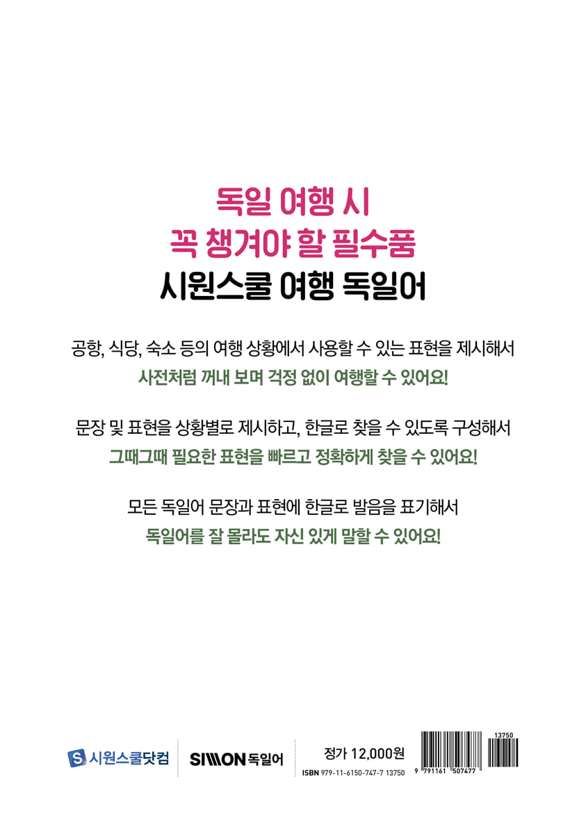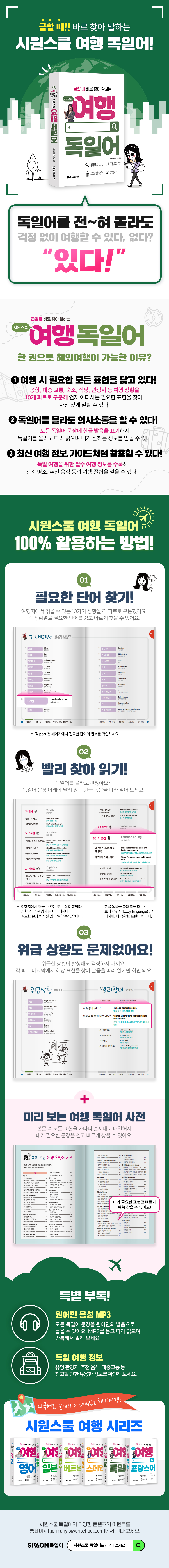 본서는 여행할 때 마주칠 수 있는 다양한 상황들을 - 공항에서, 전철 & 기차에서, 식당에서, 관광할 때 - 등등의 총 10가지로 제시해, 언제 어디서든 필요한 표현을 찾아 쓸 수 있도록 기획하였습니다. 자신이 필요로 하는 표현을 목차에서 찾아 해당 페이지를 넘기면, 바로 문장을 찾아 따라 읽을 수 있습니다. 여행하면서 사용할 수 있는 표현을 사전처럼 꺼내 보며 걱정 없이 여행할 수 있습니다. ② 한글 독음을 따라 읽으며 언제 어디서나 자신있게! 독일어를 전혀 몰라도 문제없습니다. 본서의 모든 독일어 문장과 표현에 한글 독음을 달아, 한글 발음을 따라 읽기만 하면 원어민처럼 정확한 독일어를 구사할 수 있으니까요! 독일어를 몰라도, 책에 쓰여진 문장을 따라 읽으면, 길을 묻고 음식을 주문하며, 자신 있게 여행할 수 있습니다. ③ 다급한 상황이나 컴플레인을 걸 때 사용할 수 있는 표현 수록 말도 통하지 않는 낯선 외국에서, 우리는 종종 위급한 상황에 처하곤 합니다. 갑자기 길을 잃었다거나, 아프다거나, 주문한 음식이 잘못 나왔다거나 하는 등등의 일이 일어났을 때 어떻게 하면 좋을까요? 본서는 이렇게 다급하거나 혹은 컴플레인을 걸어야 할 때 사용할 수 있는 유용한 표현들을 각 파트 뒷부분에 수록하여, 이러한 상황에서 당황하지 않고 대처할 수 있도록 하였습니다. ④ 독일, 오스트리아, 스위스 최신 여행 정보 수록 독일 여행 시 필요한 문장 및 표현 외에도, 여행 책이라면 관광 명소, 추천 음식, 대중 교통 등에 대한 정보는 필수일 것입니다. 따라서 본서에서는 독일어를 사용하는 독일, 오스트리아, 스위스의 최신 여행 정보를 수록하여, 유용한 도움을 드리고자 하였습니다. ⑤ MP3를 듣고 따라 하며 익히는 실전 독일어 나에게 필요한 표현을 찾아 한글 독음을 따라 읽는 것만으로는 부족하다고 느끼시는 분들을 위해, 원어민 MP3를 제공합니다. MP3를 듣고 따라 읽으며, 보다 정확한 발음과 억양, 강세를 익히며 실전 독일어를 익힐 수 있습니다. 자주 반복하면서 연습하면 자신도 모르는 사이에 독일어에 금방 익숙해질 수 있습니다. ⑥ 독일 유학파 이로사 선생님의 (유료) 강의 본서는 도서뿐만 아니라, 독일 유학파 출신으로 수준 높은 강의로 유명한 이로사 선생님의 강의로도 함께 공부할 수 있습니다. 이해와 암기를 바탕으로 독일어 회화 표현과 어휘를 완전 정복할 수 있는 강의를 제공합니다. 여행의 처음부터 끝까지 꼭 필요한 내용들을 10강으로 엄선해서 컴팩트하게 정리합니다. 이로사 선생님의 (유료) 강의도 함께 이용해 보세요! 이런 학습자를 위해 만들었습니다! ① 독일이나 독일어권 국가로 여행을 떠나시는 분 ② 독일어를 전혀 모르지만, 여행에 필요한 독일어 표현을 단기간에 익히시고 싶은 분 ③ 여행 독일어를 통해 기본적인 독일어 회화를 접하시고 싶은 분 ④ 독일 여행 tip, 혹은 독일 문화에 대해 알고 싶으신 분 ⑤ 여행을 가기 전, 독학이나 저자 직강(유료) 동영상 강의를 들으면서 공부하고자 하는 분 *여행 독일어를 비롯한 다양한 독일어 강의와 무료 학습자료를 시원스쿨 독일어에서 만나실 수 있습니다. (germany.siwonschool.com) |