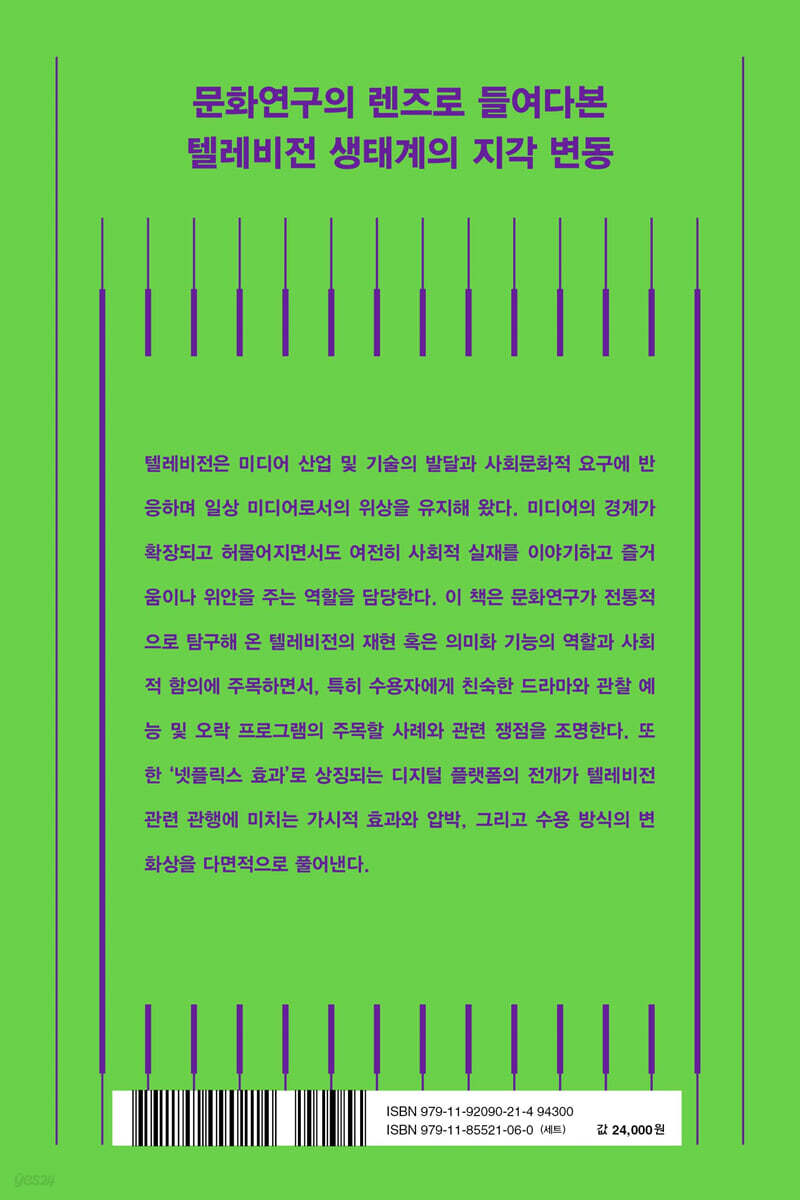 1. 텔레비전 생태계의 지각 변동과 문화연구의 대응 2. 텔레비전 연구의 현황과 명암 3. 책의 구성 2장 OTT 미디어 환경의 텔레비전 시청자 1. 우리에게 텔레비전은 무엇인가 2. 기술·문화적 형식의 진화 3. 넷플릭스는 시청 경험의 조건을 어떻게 바꾸고 있는가 4. 텔레비전 수용자론에 대한 도전 5. 전지구적 시청 공간과 지역의 수용자 6. OTT 시대의 시청 문화를 어떻게 탐구할 것인가 3장 한국 사회에서 텔레비전 드라마의 변화상과 역할을 다면적으로 돌아보기 1. 플랫폼이 주도하는 변동 속 텔레비전 드라마의 위상 2. 드라마가 재현하고 욕망하는 사안과 징후: 드라마는 사회상을 ‘어떻게’ 반영하는가? 3. 텔레비전 드라마라는 텍스트의 이해와 텍스트 분석의 명암 4. 플랫폼이 주도하는 정경 속 텔레비전 드라마의 변화하는 위상 5. 드라마 생산과 수용에 관한 정련된 탐구의 모색 4장 TV 리얼리티 프로그램의 변주 1. 대안과 공감이라는 착시로서의 ‘리얼리티’ 2. 관계성을 중계하는 리얼리티 프로그램의 역사 3. 진성성의 재현: 능력 경쟁에서 감정 경쟁으로 4. 정상성으로 회귀하는 연애 리얼리티 5. 리얼리티: 생애 주기를 재현하는 자기계발서 5장 텔레비전이 보여 주는 인종의 풍경 1. 텔레비전이 ‘인종’과 ‘이주’라는 주제와 만날 때 2. 텔레비전이 구성하는 다문화와 다인종의 정경 |