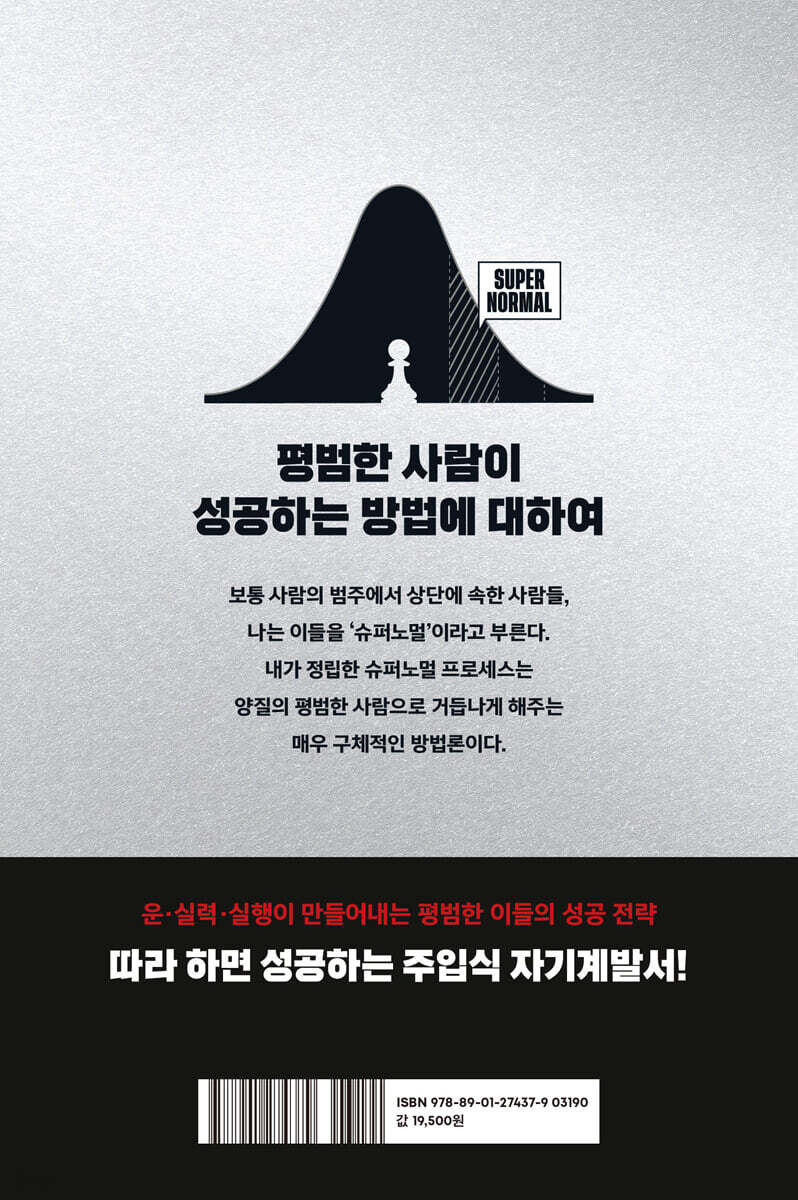 ---「프롤로그 | 성공하는 삶을 꿈꾸는 아주 보통의 사람들에게」중에서 한 달에 수천만 원을 벌어들이며 수십억 원의 자산을 쌓은 사람들이 지하철 한두 칸에 한 명씩은 있다. 그들은 금수저를 물고 태어난 것도, 상식을 벗어난 천재도 아니다. 우리와 동일한 평범함의 범주 안에 있는 듯하지만 알고 보면 앞서나가는 사람들. 나는 이들을 ‘슈퍼노멀’이라고 부른다. 나는 유튜브를 운영하고 사업을 하며 수많은 슈퍼노멀을 만났다. 그리고 수많은 인터뷰와 관찰 등의 연구를 통해 깨닫게 되었다. 천재가 아닌 뛰어난 보통 사람들이 일정한 프로세스를 밟으며 부와 성공을 거머쥐고 슈퍼노멀로 거듭난다는 사실을 말이다. … 이제 그 프로세스에 대해 이야기하려고 한다. 나 같은 평범한 사람이 자본주의사회에서 살아남는 길, 슈퍼노멀의 프로세스를 말이다. 지금부터 월 소득 160만 원의 직장인에서 오늘에 이르기까지 내가 어떤 프로세스를 적용해왔는지 가감 없이 고백하고 싶다. ---「1부 | 앞서나가는 프로세스를 깨우친 평범한 사람」중에서 그렇게 몇 년을 살다가 문득 깨달았다. 월 100만 원씩 저축해 1년이면 1,200만 원, 10년을 모아봐야 1억 2천만 원. 오랜 시간 돈을 모아도 아파트는커녕 빌라도 사기 힘들 것이라는 사실을 말이다. 낡은 빌라 반지하 생활을 평생 벗어날 수 없을 것 같았다. 빛 하나 들지 않던 낡고 비좁은 반지하 신혼집을 어떻게든 꾸며보려던 아내의 모습을, 내가 가장 보기 싫어했던 그 장면을 계속 보게 될 것만 같았다. 돈이 필요했다. 돈만 있었다면 날 부당하게 대하는 회사, 진작 때려치우고 나왔을 것이다. 그럼 나를 무시하는 선배 따위 만날 일도 없었겠지. 돈만 충분하다면 넓고 깨끗하고 볕이 잘 드는 집을 아내와 함께 꾸미는 재미를 느낄 수 있었으리라. 그렇다면 방법은 하나다. 부자가 되는 것. 다시는 누구도 나를 무시하지 못하게 말이다. 아니, 애초에 나를 무시하는 사람이나 가까이 하기 싫은 사람과는 얽히는 일조차 없을 정도로 꽤 많은 돈을 버는 것. 그것만이 답이었다. 그렇게 나는 돈을 벌기로 ‘결심’했다. ---「1부 | 앞서나가는 프로세스를 깨우친 평범한 사람」중에서 ‘돌연변이’의 발견은 나에게 부자의 문을 열어준 첫 번째 힌트였다. 돌연변이의 존재를 깨닫기 전에 나는 슈퍼노멀의 마인드와는 거리가 먼 삶을 살았다. 무언가 시도도 하기 전에 시도할 수 없는 이유부터 떠올렸기 때문이다. 한마디로 핑곗거리가 너무나 많았다. … 인생의 변화는 생각의 회로를 바꾸는 데서 시작된다. 이 일이 있은 후부터 습관적으로 떠오르는 핑계에 성공의 힌트가 숨어 있음을 알게 되었다. 그때부터 모든 핑계에서부터 해답을 찾기 시작했다. 이런 핑계를 깨부수기 위해서, 나처럼 가지지 못한 사람들 중 뛰어난 성과를 올린 사람이 있는지를 찾기 시작했다. 부잣집에서 태어나지 않았는데 부자가 된 사람, 명문대를 나오지 않았으나 잘된 사람, 전문가가 아닌데도 성과를 낸 사람이 있는지 샅샅이 살폈다. 그리고 이런 사례들이 바로 당신이 앞으로 찾아야 할 ‘돌연변이’다. 즉, 돌연변이는 ‘나와 상황이 비슷한 사람이 압도적인 성과를 만들어낸 사건’이다. 돌연변이를 찾아내면, 자신감이 솟구칠 것이다. ---「2부 | 1단계 돌연변이를 발견한다」중에서 제아무리 감 좋은 천재라고 해도 그의 영감과 재능이 다하는 순간부터는 무엇을 해야 할지 방향을 잃을지도 모른다. 애초에 ‘그냥’ 얻게 된 것이므로 그 방법을 타인에게 가르쳐줄 수도 없다. 그저 영감이 떨어지지 않기를, 내가 가진 재능이 많은 사람들에게 계속해서 사랑받기를 기도하는 수밖에 없다. 특히 천재들은 시간이 지날수록 ‘뛰어난 보통 사람’이 되어가는 자신을 견디지 못하고 깊은 슬럼프에 빠질 수도 있다. 우리는 노멀에서 ‘뛰어난 보통 사람’이 되고자 하는 만큼 이러한 상황을 겪지 않아도 되는 나름의 강점이 있다. 뛰어난 보통 사람이 되기 위해 영감과 재능을 찾아 헤맬 필요는 없으니까. 만약 당신이 나와 같은 보통 사람이라면, 그러니까 특별한 능력과 무한한 자원이 없는 상황이라면 ‘돌연변이를 찾아내는 전략’이 매우 유효하게 작용할 것이다. ---「2부 | 1단계 돌연변이를 발견한다」중에서 투자 전략가 마이클 모부신은 그의 저서 『마이클 모부신 운과 실력의 성공 방정식』(에프엔미디어, 2019)에서 이렇게 말한다. “다양한 방식으로 결합한 운과 실력이 실제로 우리 인생을 좌우한다. 그런데도 사람들은 운과 실력을 제대로 구분하지 못한다.” 나는 그의 저서에서 2단계 ‘분해’의 핵심 아이디어를 얻어 이를 나의 사업에 적용해보기 시작했다. 도대체 운과 실력이 어떻게 결합해서 결과를 만들어내는지 알아보고 미리 대책을 세웠던 것이다. 2단계에서는 (돌연변이를 모방하기 위해) 작업의 전체 과정을 순서대로 정리하는 것부터 시작한다. 그런 뒤 ‘운의 영역’과 ‘실력의 영역’을 구분하여 낱낱이 따져볼 생각이다. 복잡하다고? 자본주의사회에서 가장 중요한 돈과 시간, 에너지를 효율적으로 사용하게 해주는 가장 중요한 단계임을 강조하고 싶다. ---「2부 | 2단계 운과 실력을