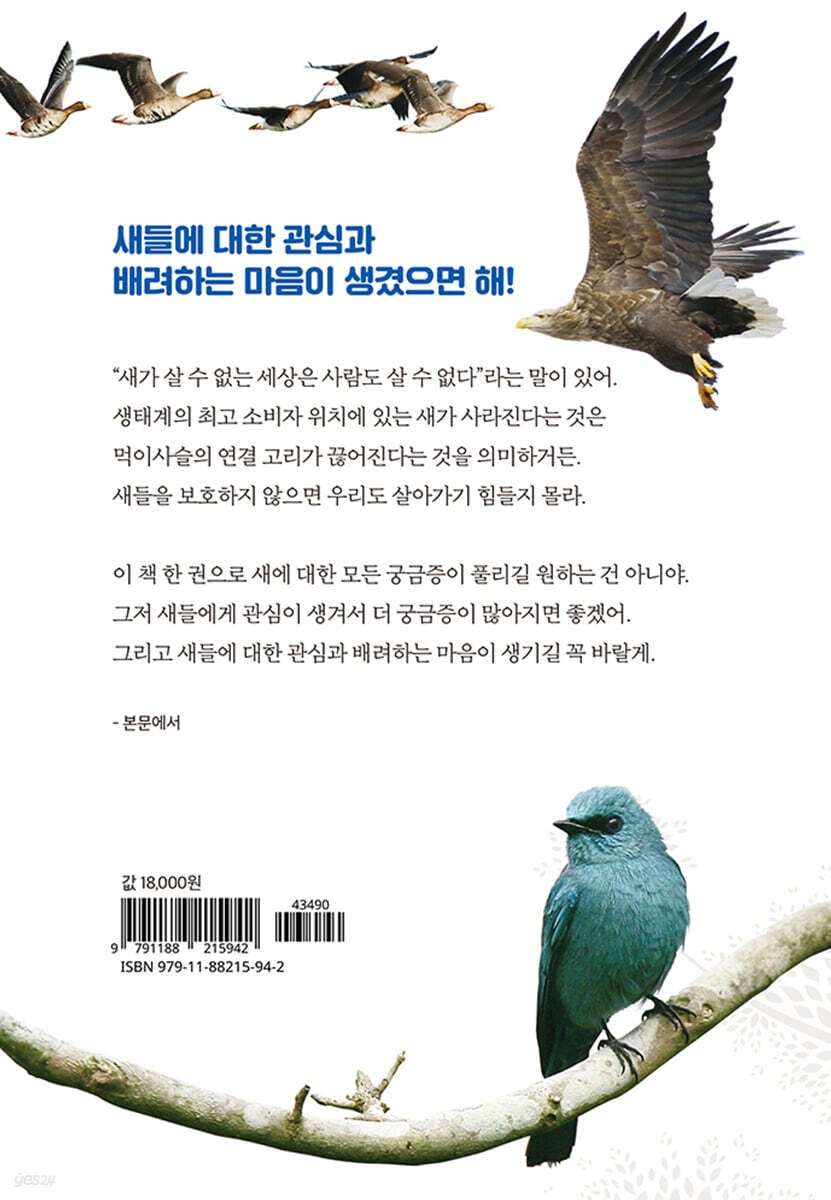 -깃털을 가진 동물은 새밖에 없어. 다른 동물과 구별되는 가장 큰 특징이지. 깃털처럼 가볍다는 말을 들어 본 적이 있니? 날아갈 때 몸무게를 최소화하려고 가벼운 거야. 그렇지만 몸을 보호하기 위해 단단하기도 해. 벌새처럼 깃털이 1천 개 이하인 새도 있지만 고니류처럼 깃털이 2만 5천 개 이상인 새도 있어. -새는 시야도 넓어서 천적이나 먹잇감을 쉽게 발견해. 사실 새는 눈이 머리뼈에 고정되어 있어서 사람처럼 눈을 움직이기 어려워. 그래서 눈을 움직이지 않고도 넓게 볼 수 있도록 진화했지. 사람의 시야가 약 200도인데, 비둘기는 316도, 멧도요는 359도라고 해. 부엉이류는 시야가 사람과 거의 비슷하지만 대신 목을 270도나 돌릴 수 있어서 좁은 시야를 극복한단다. -새들은 다른 종과 함께 살아가기도 해. 종종 들판에서 소 등 위에 황로가 서 있는 모습을 볼 수 있어. 덩치 큰 소에게 찰싹 붙어 있으면 안전하거든. 게다가 소가 움직이면 풀숲의 곤충이 놀라 튀어 오르잖아. 그 곤충은 바로 황로의 먹이가 되는 거야. 소와 함께 있으면 위험도 피하고 손쉽게 먹이도 구할 수 있으니 일석이조인 셈이지. -암컷과 수컷의 생김새가 다른 새들은 대부분 수컷이 화려하고 아름다워. 평소에는 암컷과 생김새가 비슷하지만 번식 시기에만 예쁜 번식깃이 생기는 수컷도 있어. 암컷에게 선택되려고 아름답게 진화한 것 같아. 암컷은 화려하지 않고 색이 수수한 경우가 많아. 암컷이 아름다우면 번식할 때 위험에 맞닥뜨릴 수 있잖아. 대부분의 암컷은 번식 활동에 전념해야 하는데 천적의 눈에 쉽게 띈다면 잡아먹힐 수도 있거든. -알의 크기와 색깔도 천차만별이야. 새 중에서 가장 큰 타조의 알은 가장 작은 벌새의 알보다 무려 4,500배나 커. 색깔도 다양해서 휘파람새의 적갈색 알은 초콜릿 같고, 쇠유리새의 푸른색 알은 사파이어 보석 같아. 나뭇가지로 둥지를 지어서 알을 낳는 까치는 짙은 밤색의 얼룩무늬여서 보호색을 띠지. 새들은 저마다 생활환경이나 습성에 맞게 모양도, 크기도, 색깔도 제각각인 알을 낳도록 진화했어. 새들이 다양한 만큼 새의 알에도 새 생명을 탄생시키기 위한 다양한 생존 전략이 숨겨져 있단다. -가장 먼 거리를 이동하는 새는 북극제비갈매기야. 번식지인 북극과 겨울을 나는 남극을 해마다 왕복하지. 그 거리는 무려 3만~4만 킬로미터라고 해. 해마다 지구 한 바퀴를 도는 셈이지. 손바닥만 한 새가 이렇게 먼 거리를 비행한다니 무척 놀라워. 물론 북극과 남극 사이를 한 번도 쉬지 않고 날아가는 것은 아니야. 우리가 차를 타고 갈 때 휴게소에서 쉬어 가는 것처럼 북극제비갈매기도 중간 지점에서 잠시 쉬었다가 가지. 그런데 북극에서 번식하고 북아메리카에서 겨울을 나는 흰기러기는 단 하루 만에 약 2,000킬로미터를 이동한 기록이 있다고 해. 계산해 보면 시속 83킬로미터로 쉬지 않고 날아간 셈이지. -사람들이 시각에 의존해 길을 찾듯 새들도 주변의 사물이나 환경을 보면서 길을 찾아. 새들은 시력이 좋은데 높은 하늘에서는 더 멀리 볼 수 있지. 낮에 이동하는 새들은 햇빛의 이동 방향과 해의 높이를 기준으로 길을 찾아. 밤에 이동하는 새들은 계절에 따라 나타나는 별자리나 북극성처럼 위치가 변하지 않는 별을 기준으로 길을 찾기도 하지. 새들은 뇌의 앞부분에 철 성분이 있어서 지구의 자기장을 느낄 수 있다고 해. 지구는 커다란 자석과 같기 때문에 자기장을 느낄 수 있다면 쉽게 방향을 알 수 있을 거야. --- 본문 중에서 |